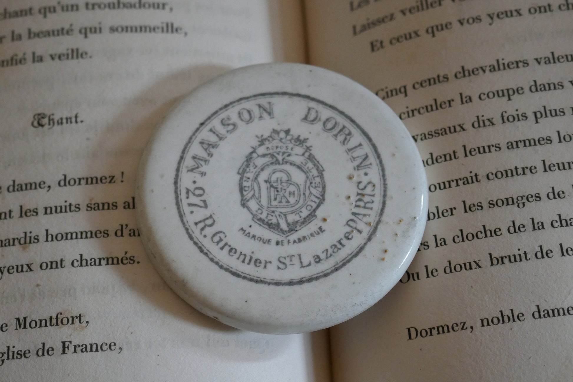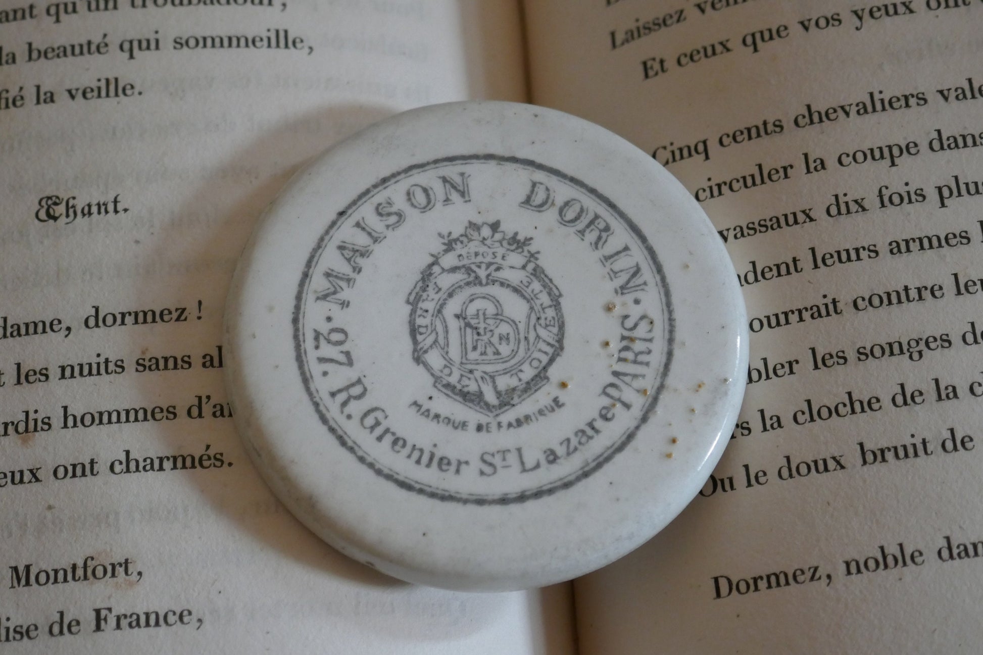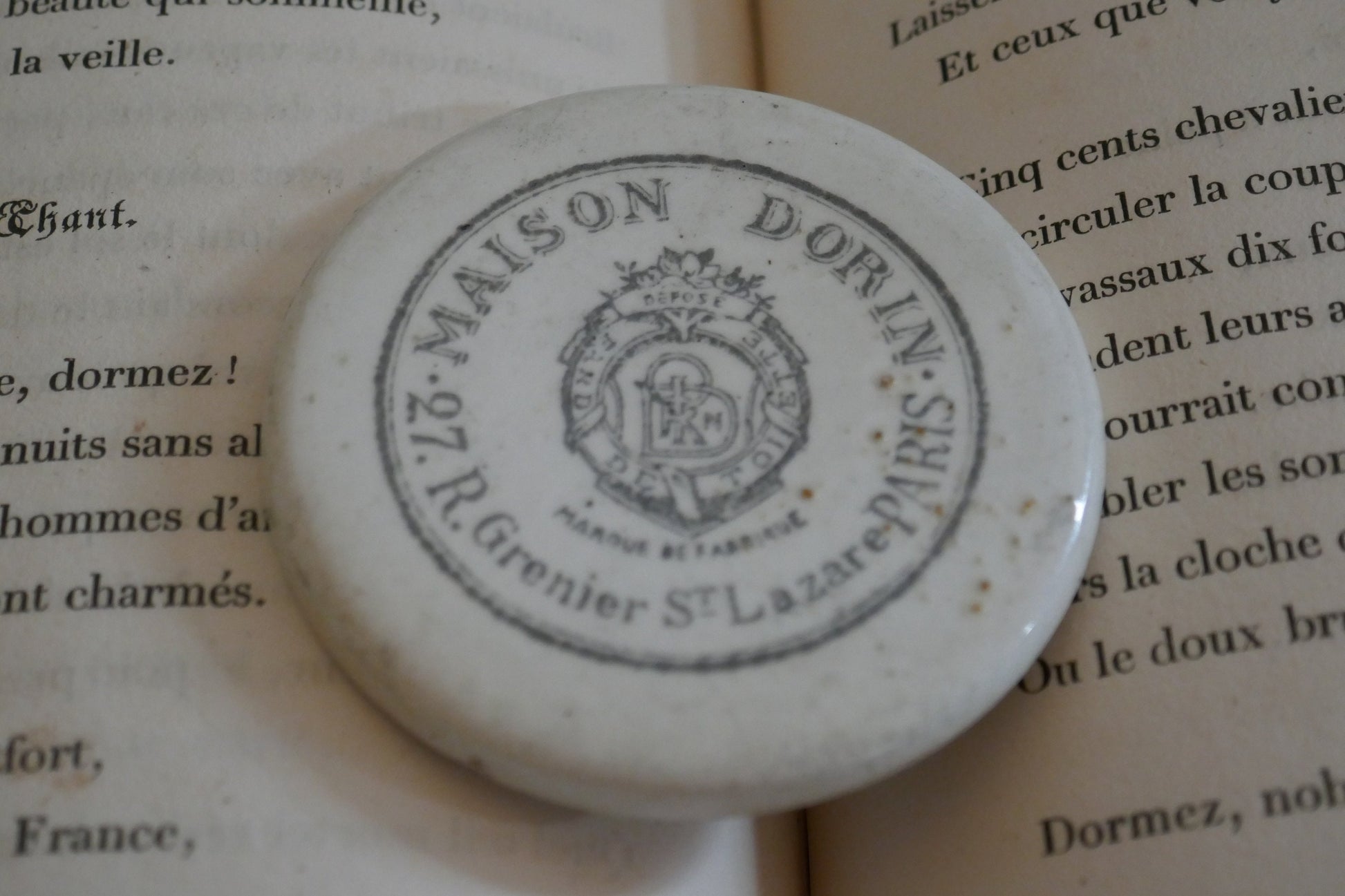 Antique Advertising Pot - Antique Maison Dorin Paris Transfer Printed Victorian Pot Lid - Circa 1890 - Antique Advertising - Farmhouse Decor