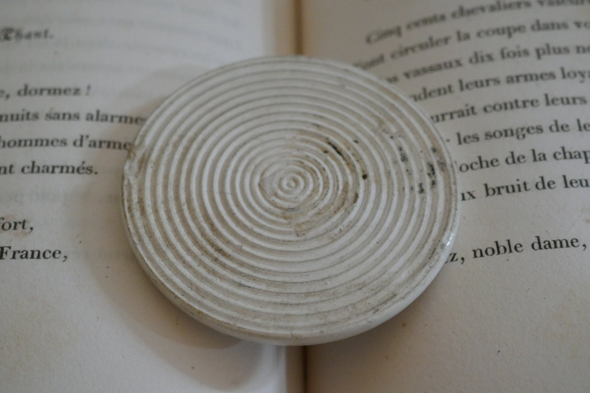 Beautiful French Ironstone circa 1890s advertising perfume potlid.