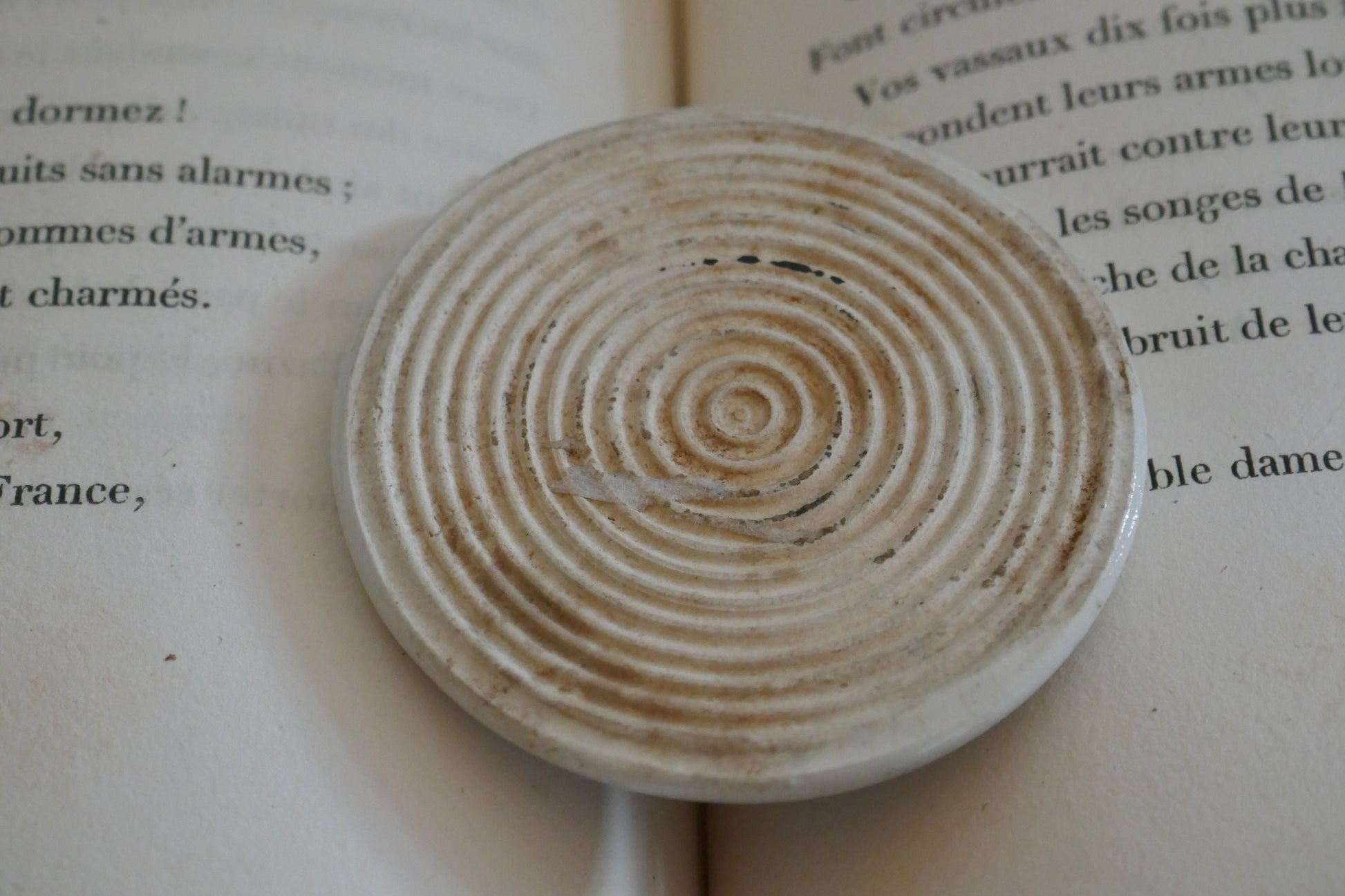 Beautiful French Ironstone circa 1890s advertising perfume potlid.