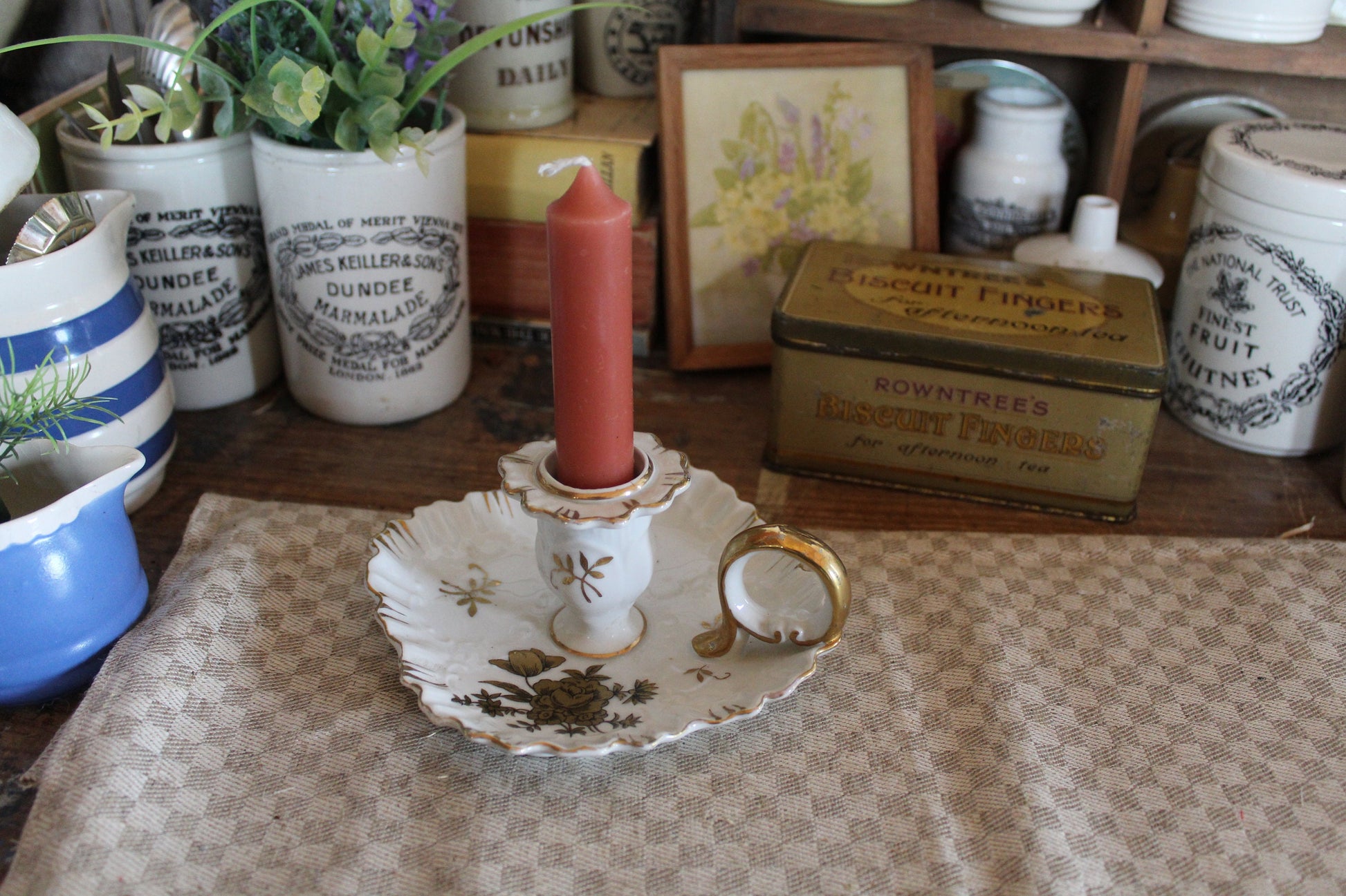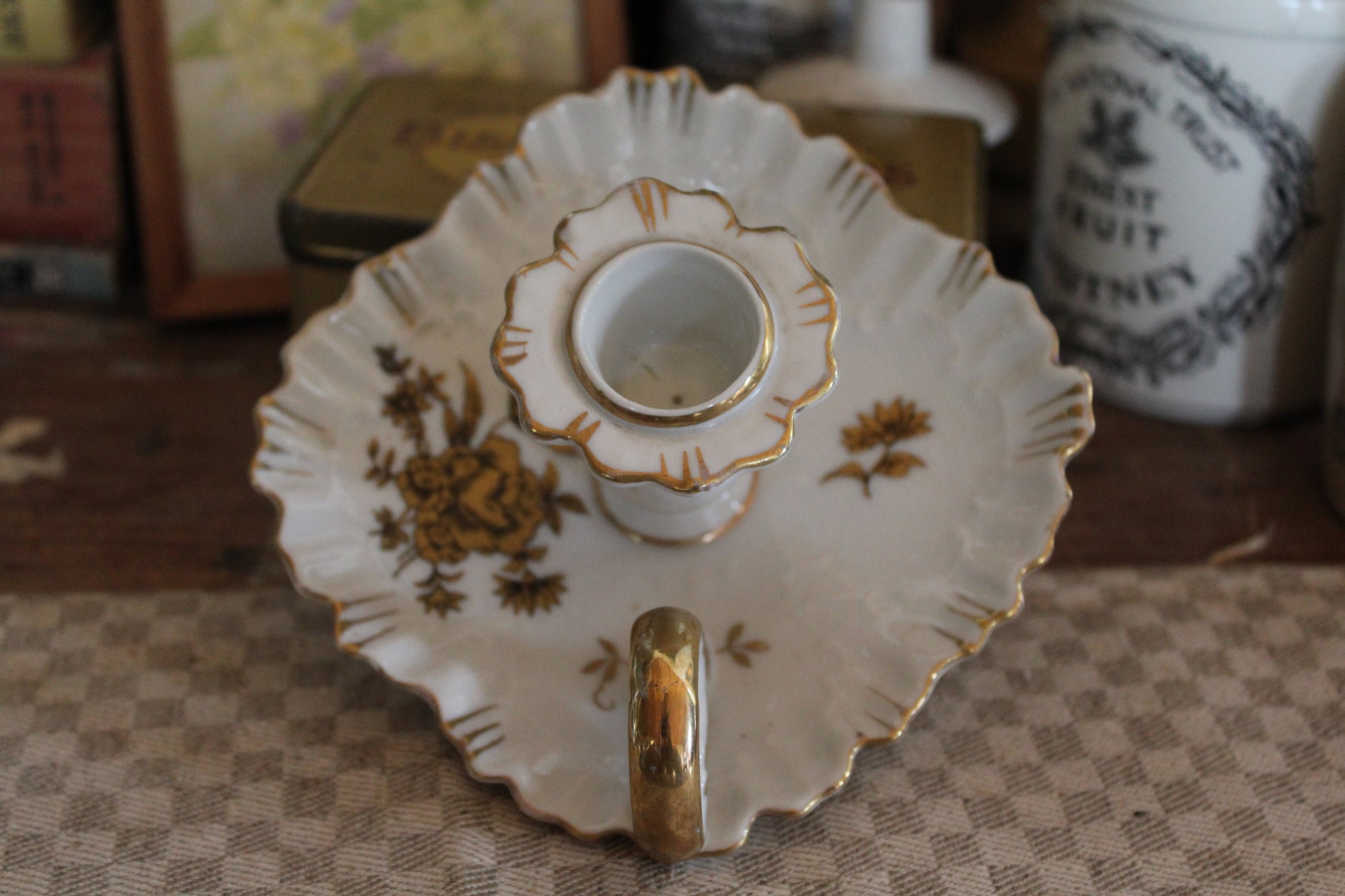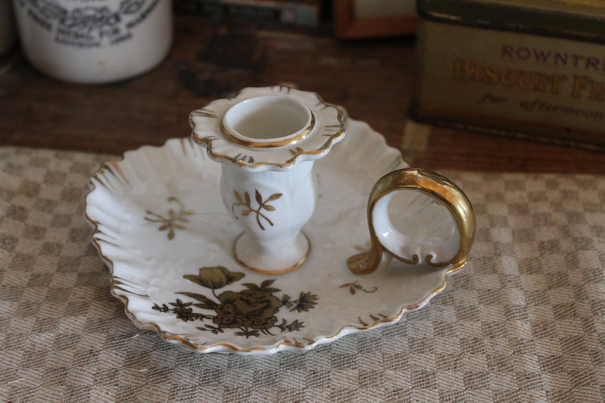 A wonderfully nostalgic antique French circa 1890s era white and gold ceramic chamber stick candle holder.