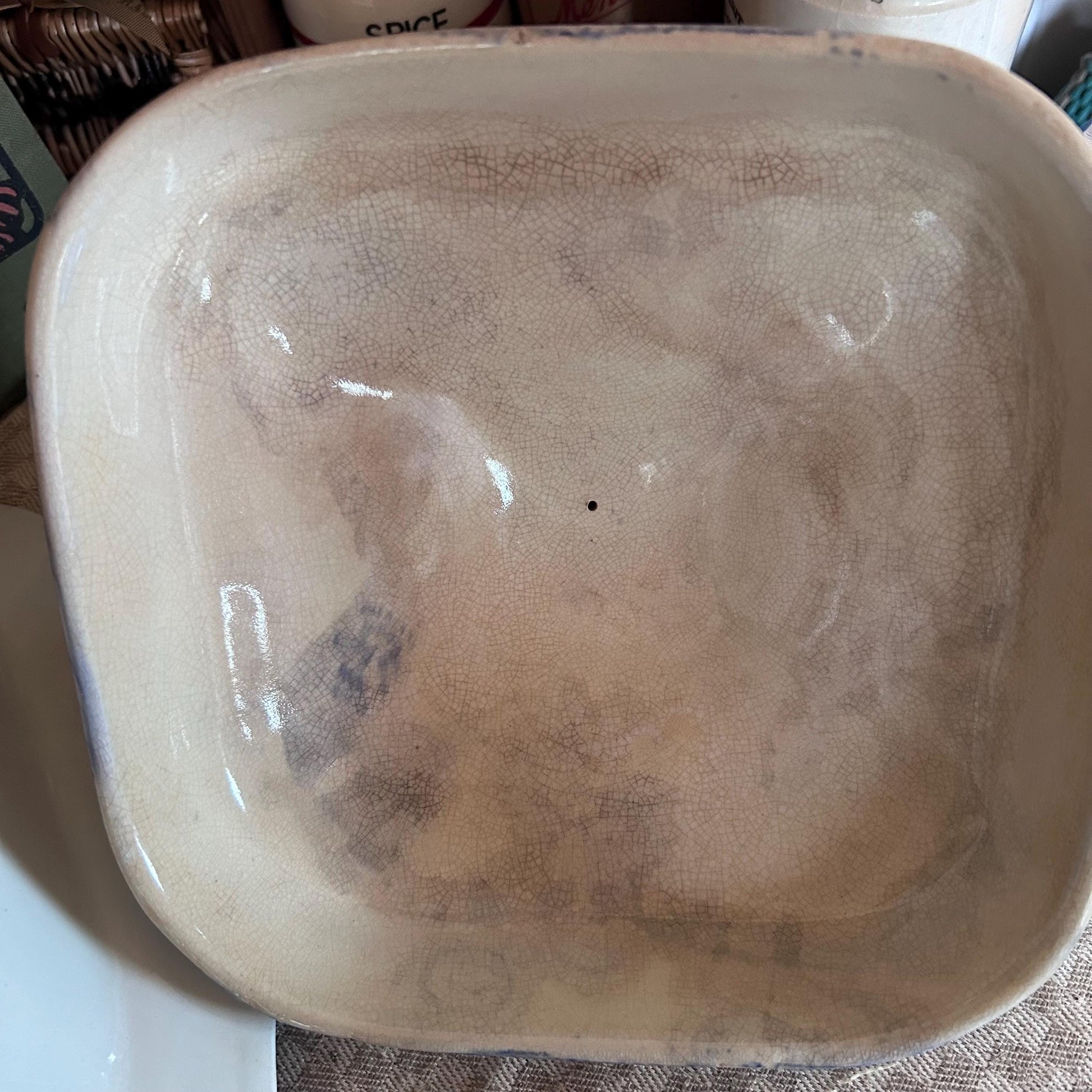 In good condition. Some wear and crazing and sand spots in the glaze that is very typical of this era of pottery, some slight staining one insignificant hairline but nothing too bad.