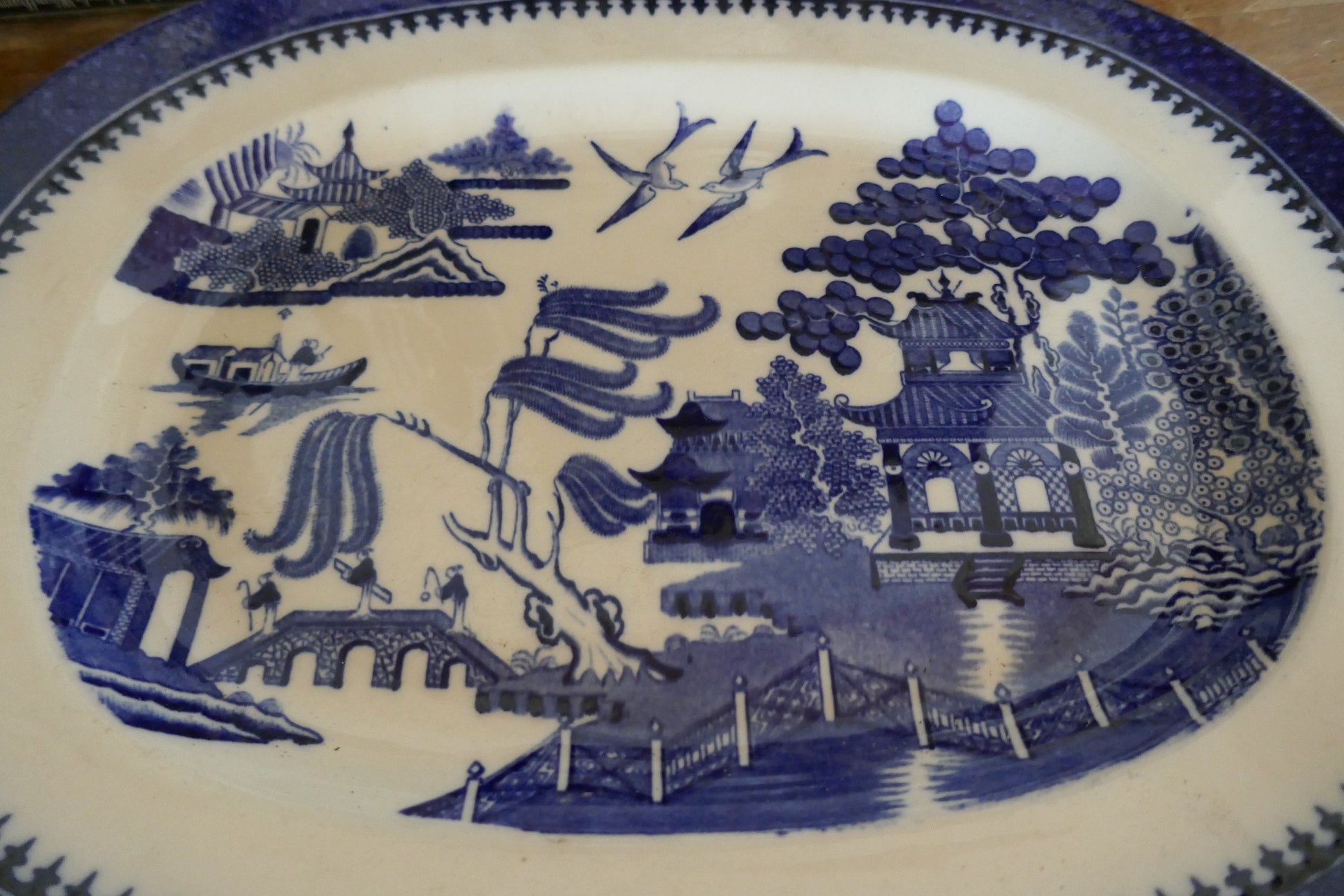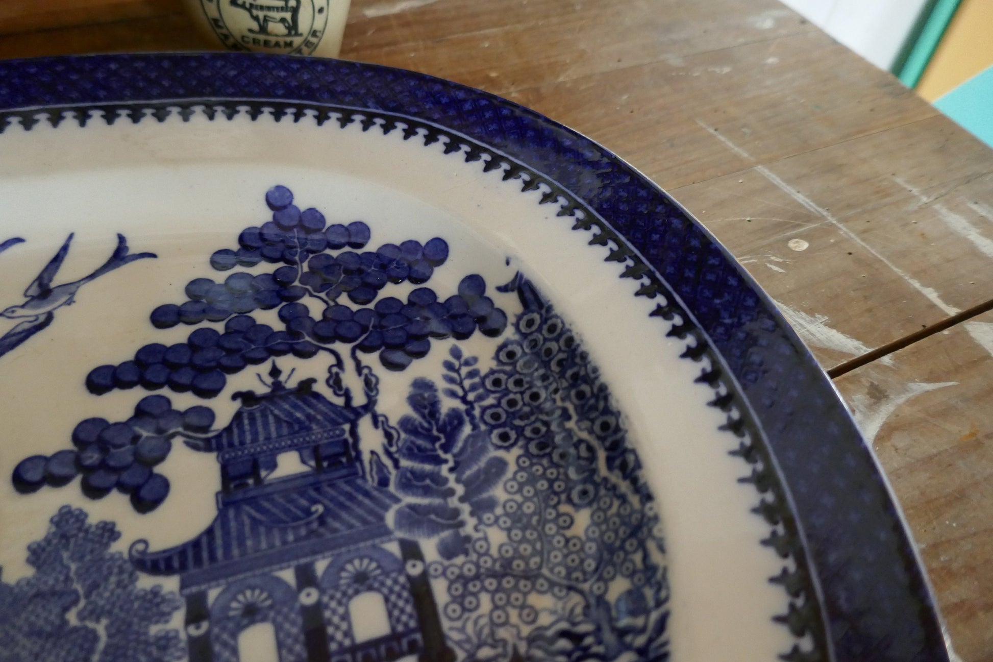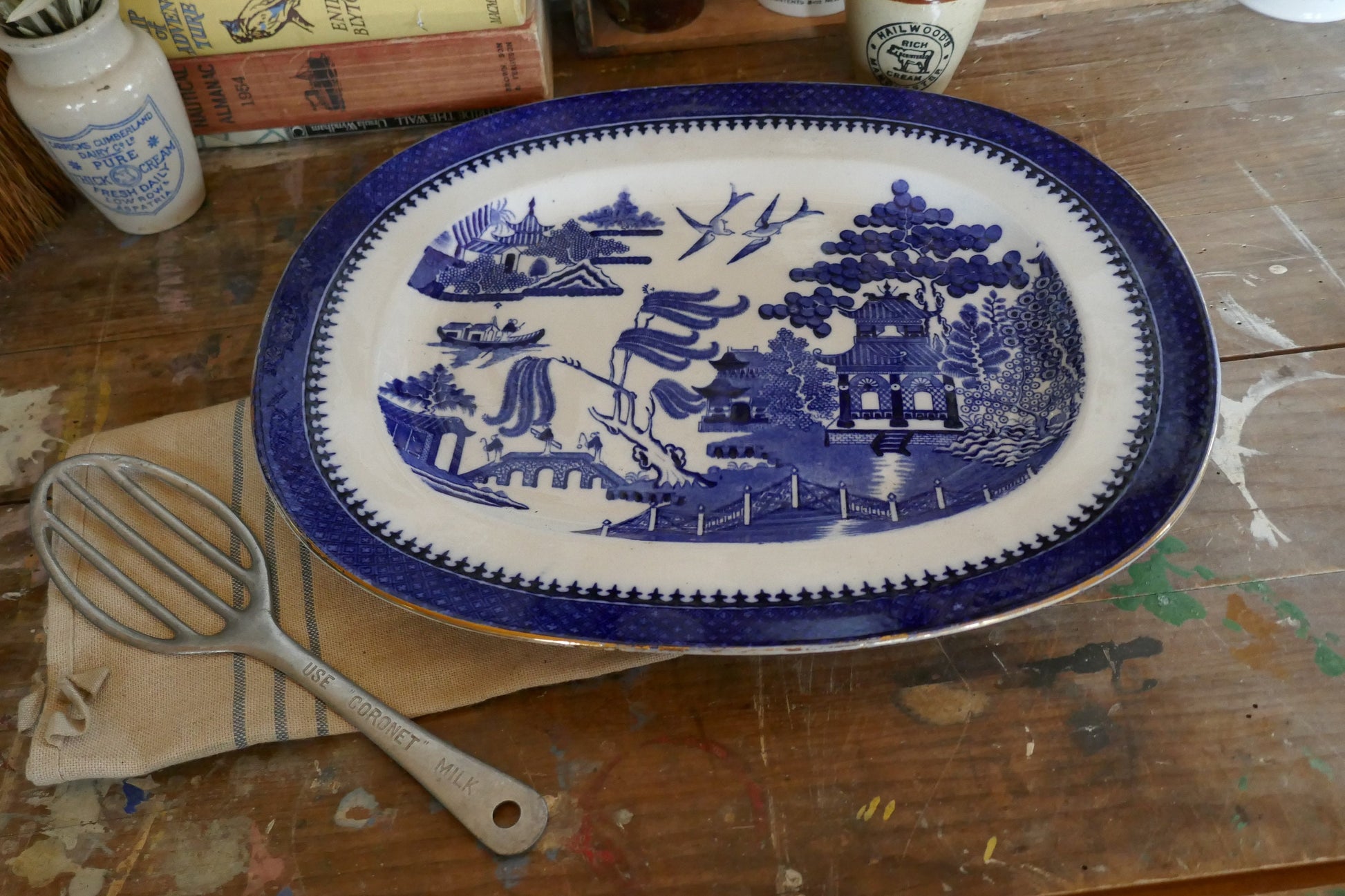 Beautiful antique ironstone blue and white platter plate in the old Willow Pattern. Dating circa 1910s