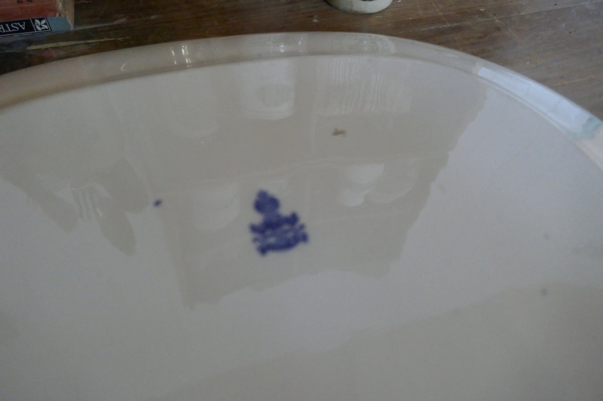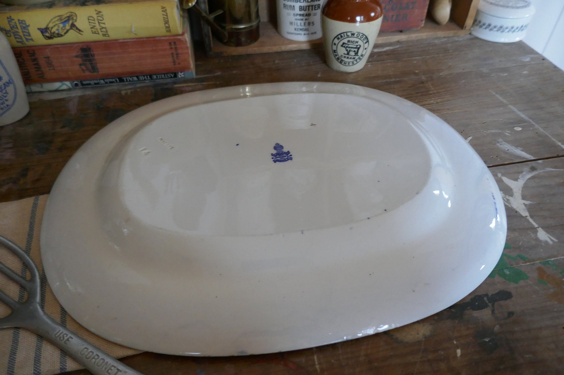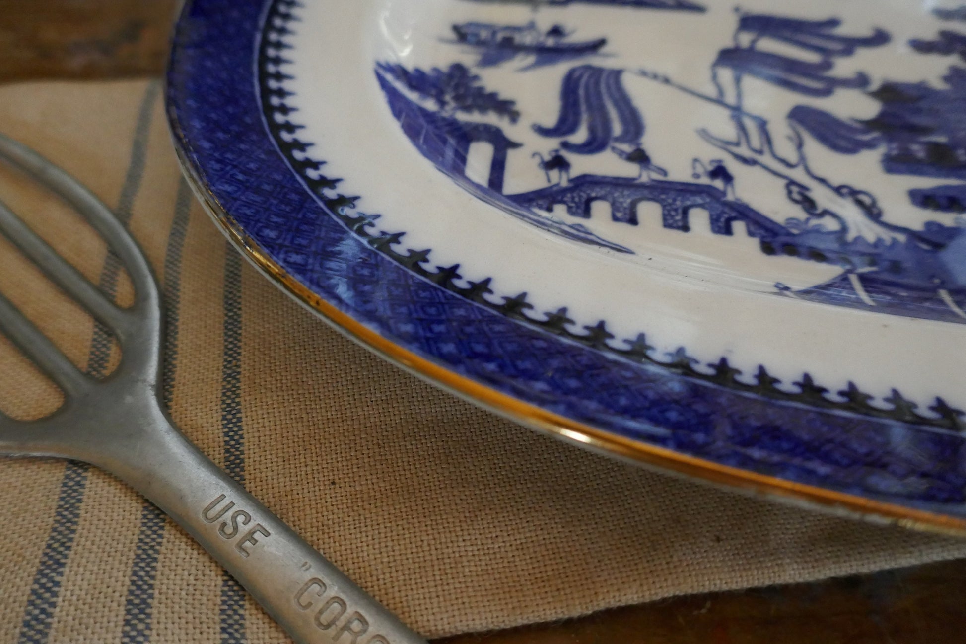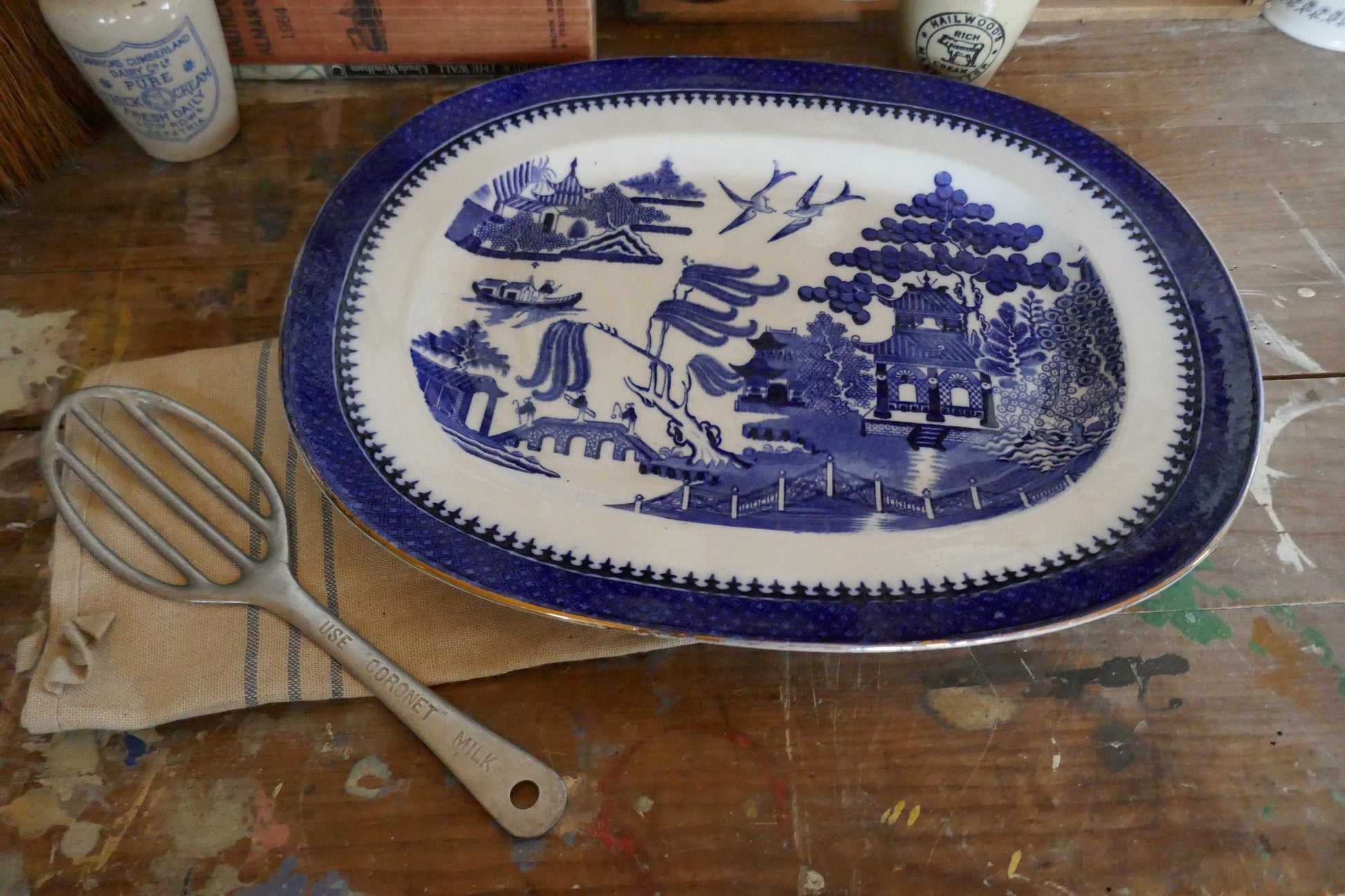 Beautiful antique ironstone blue and white platter plate in the old Willow Pattern. Dating circa 1910s