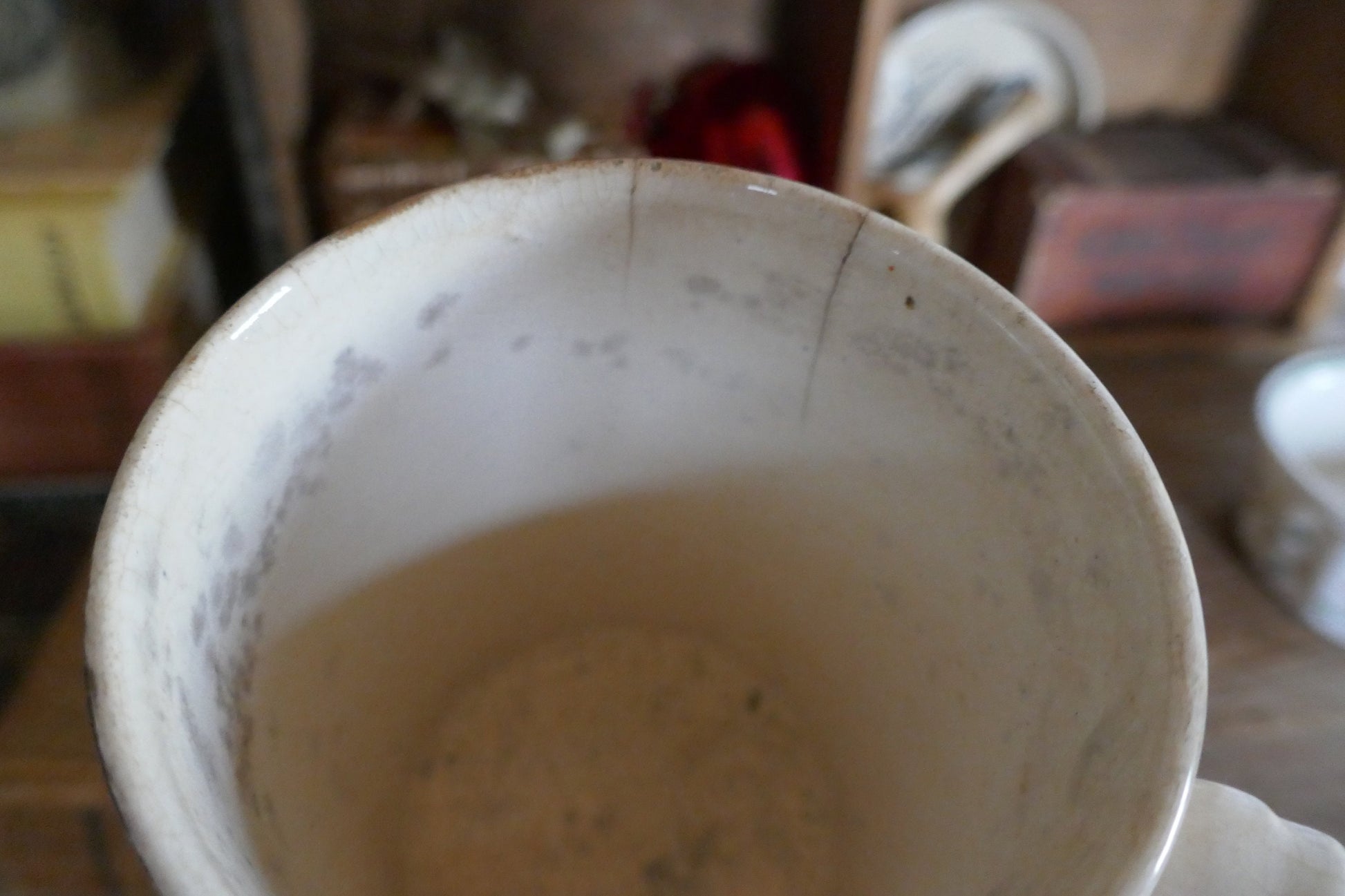 In fairly good condition for its old age, there is a few superficial hairlines and some crazing and staining across the mug.