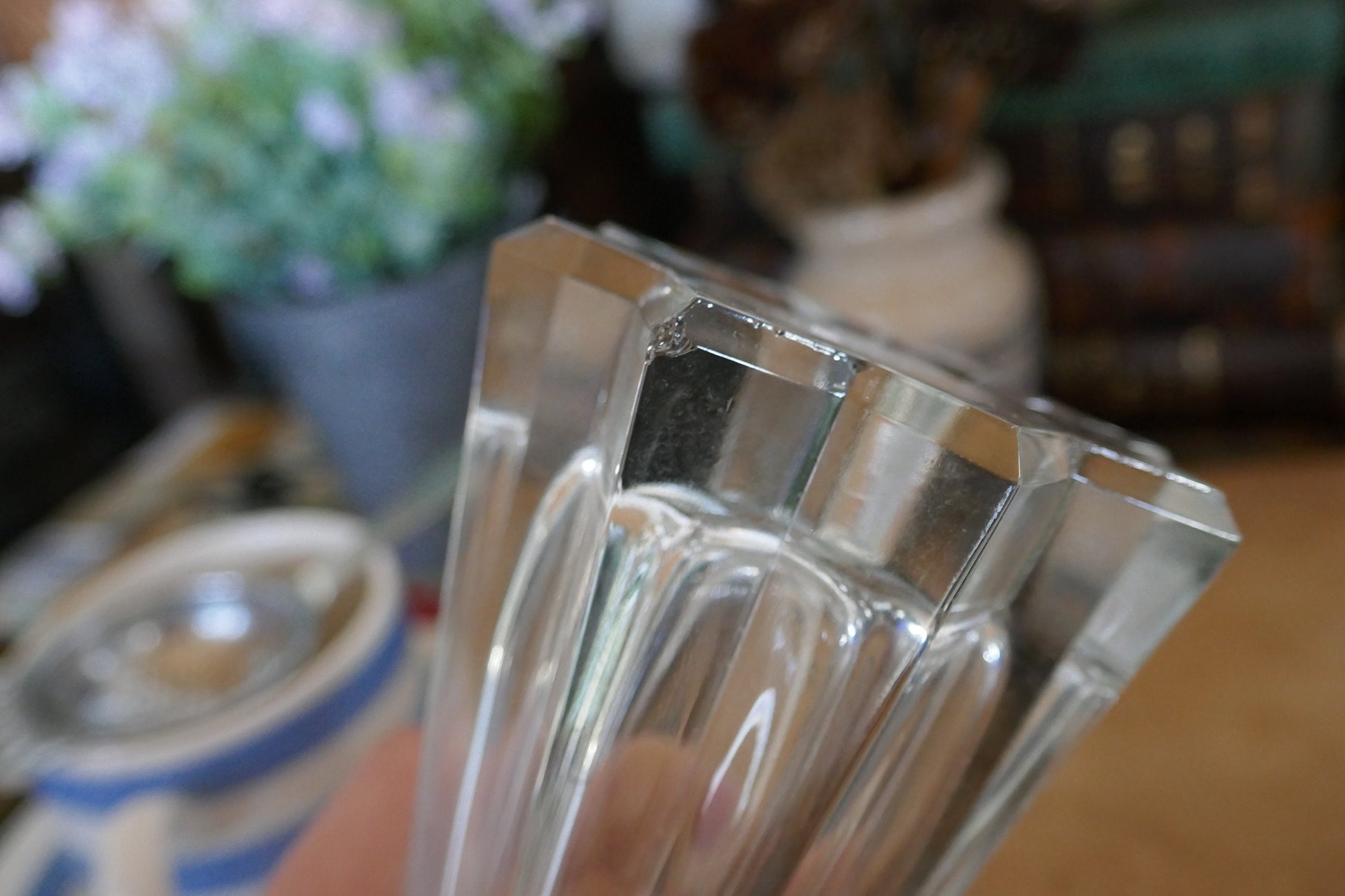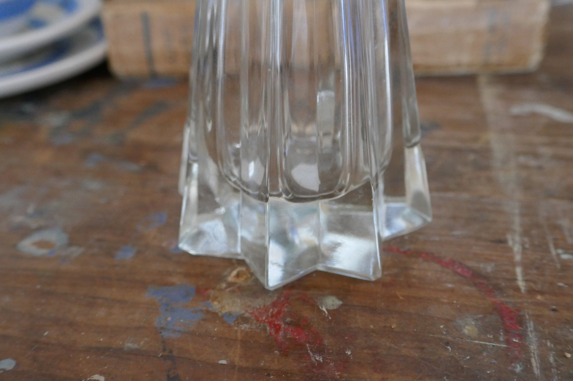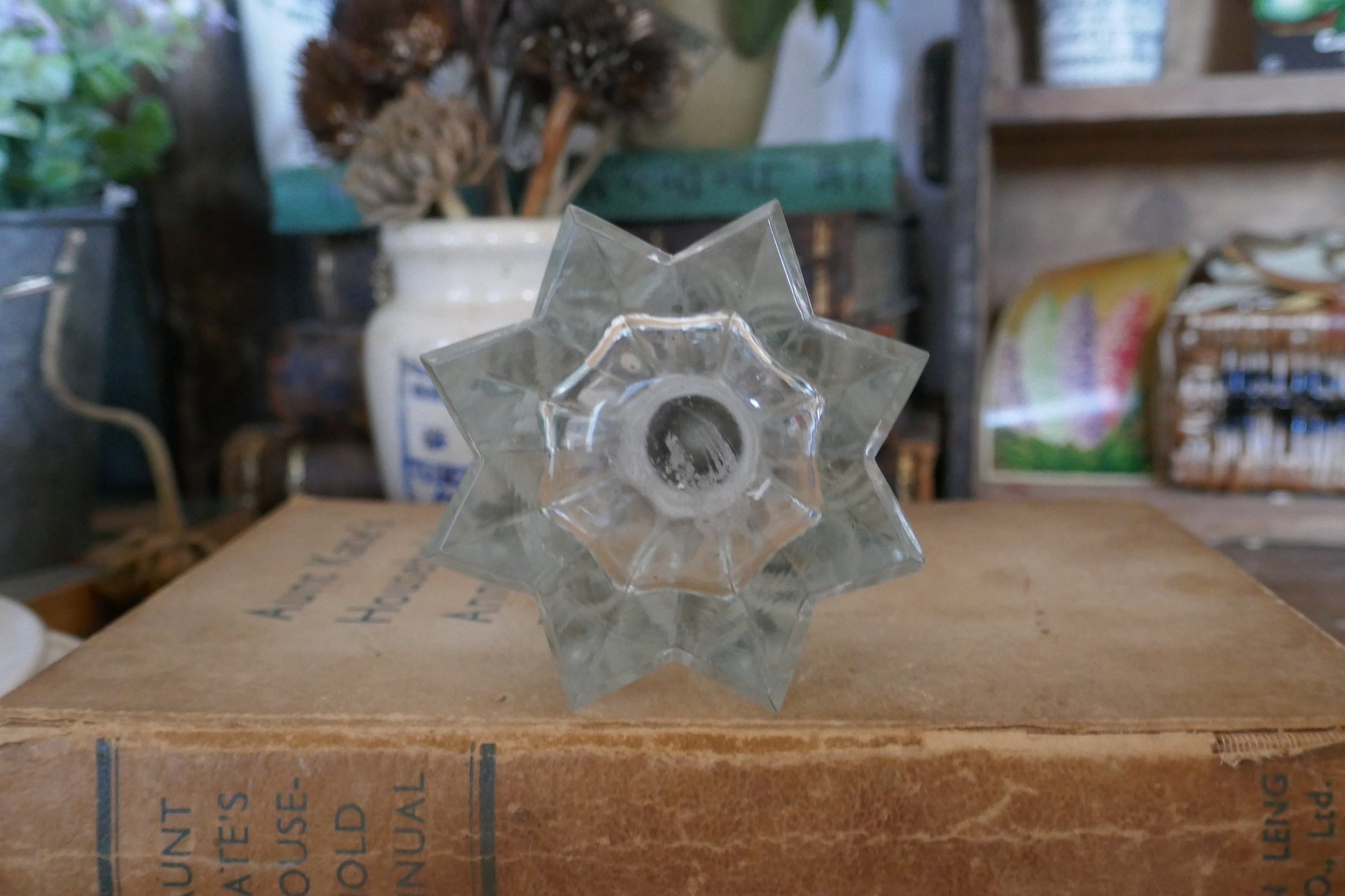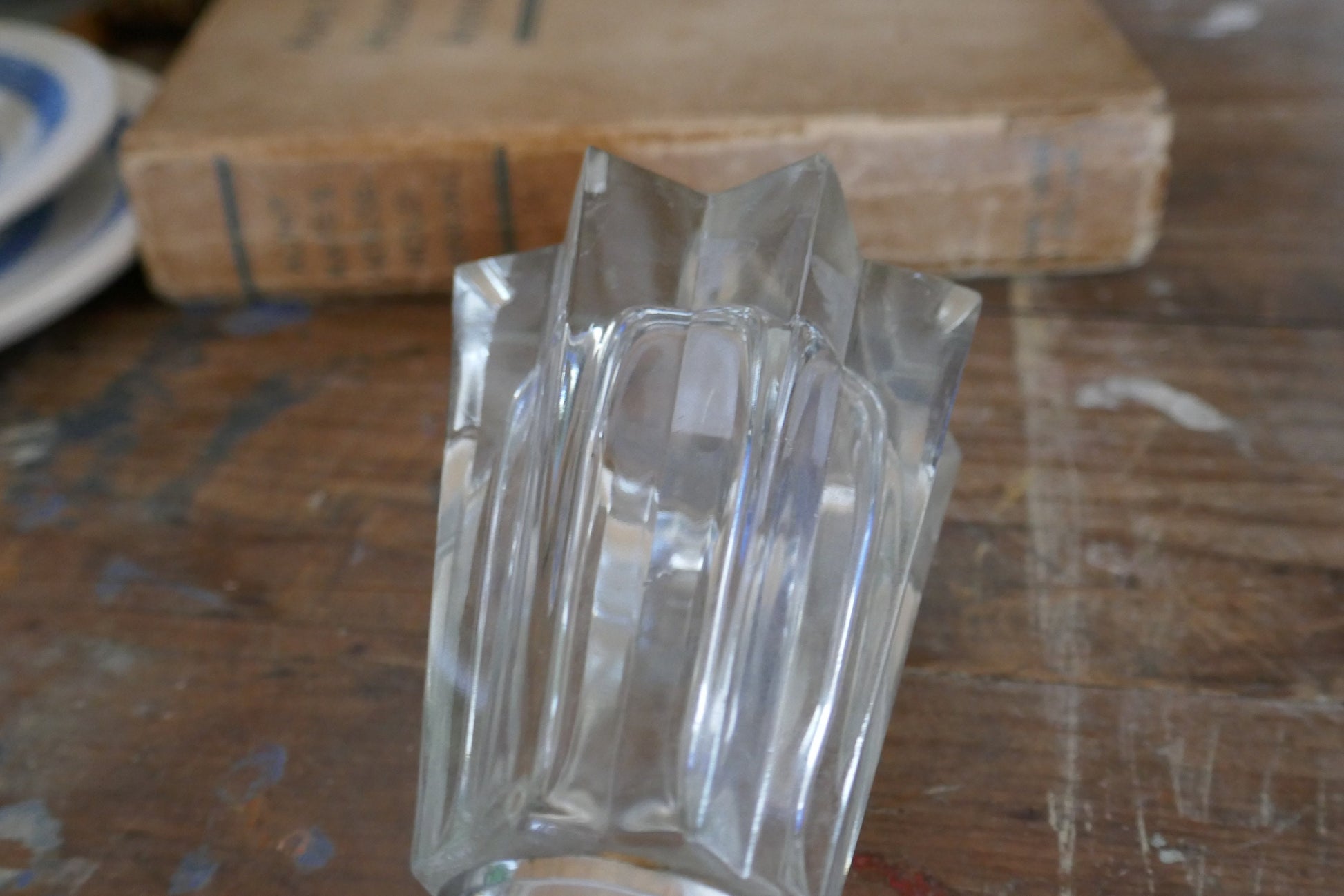 Lovely star shaped clear heavy glass shaker, one tiny nibble to the corner of one point on the bottom but you have to search for it, no cracks, great condition for its age. Some tarnishing to the silver plate, just through age.
