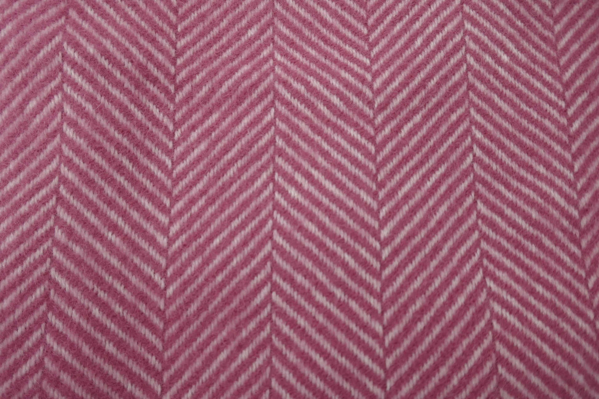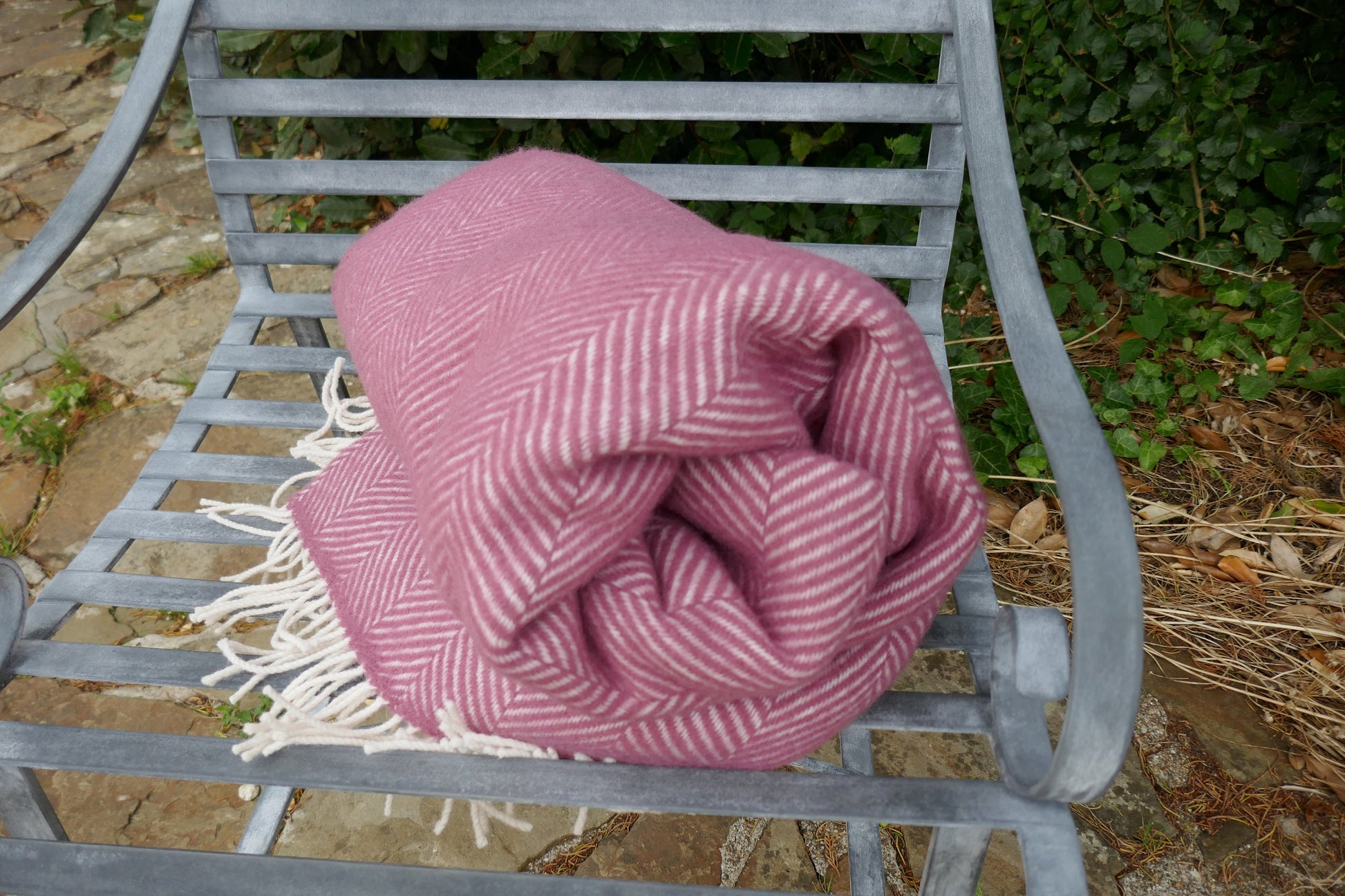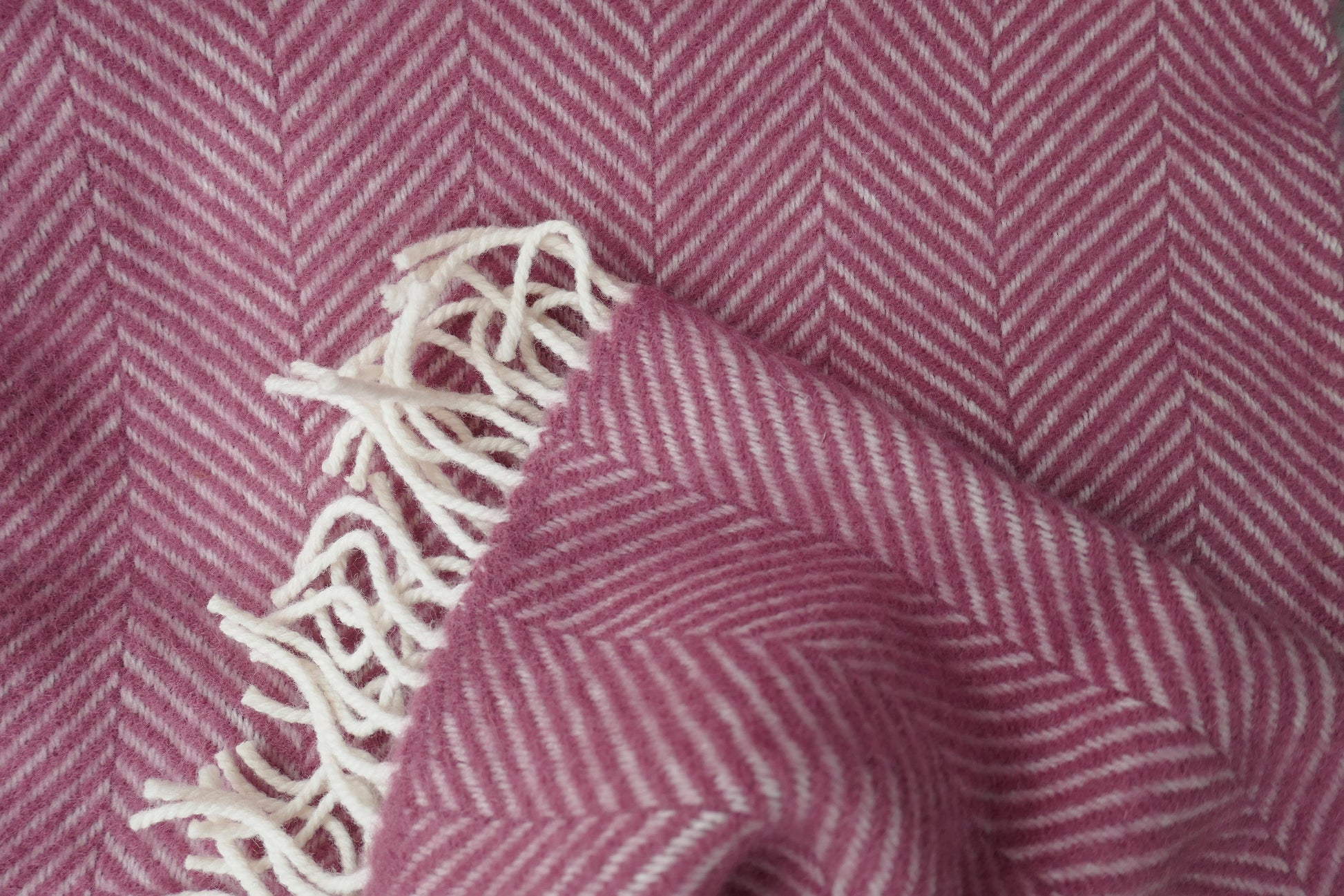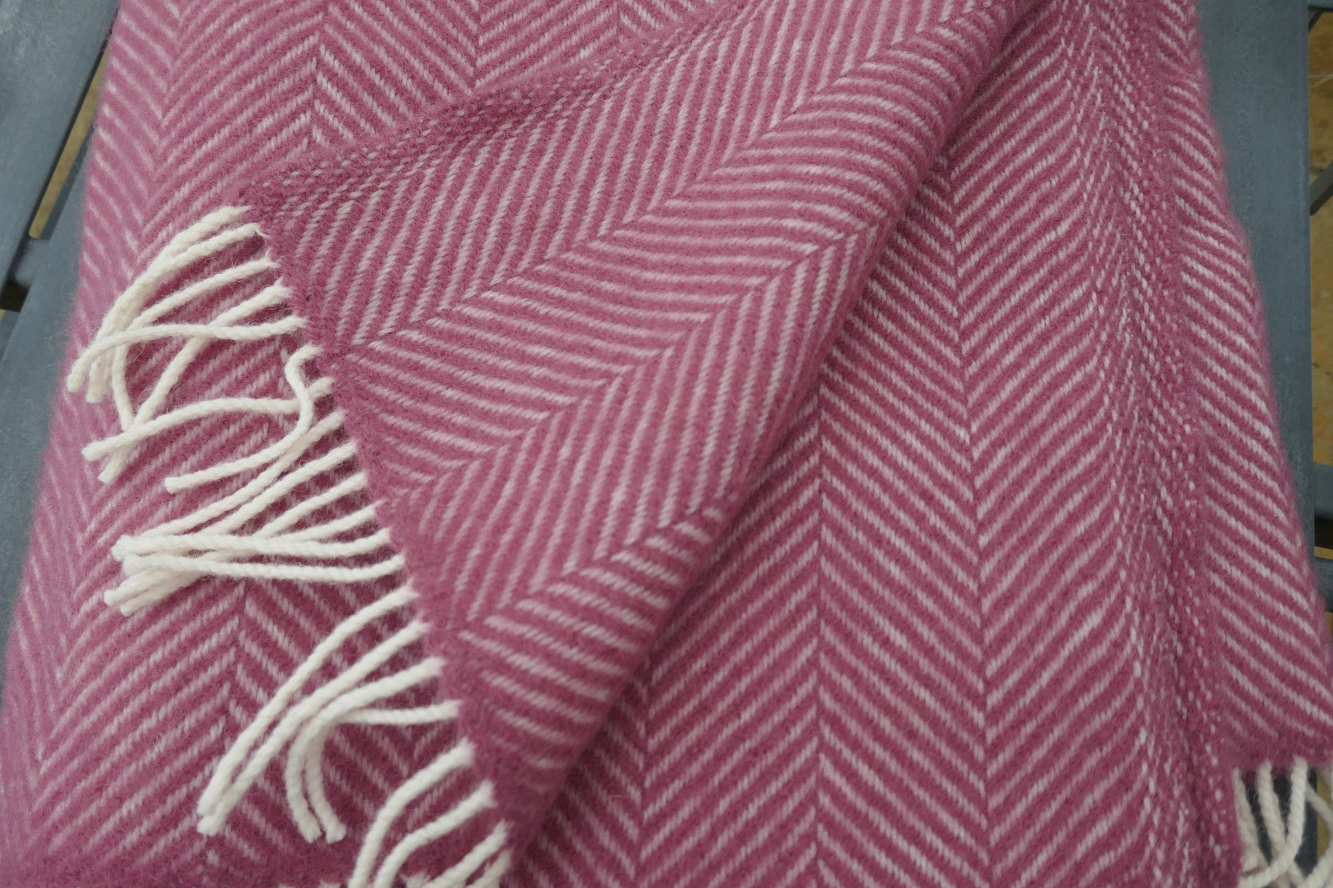 In a wonderful pale dusty pink and white herringbone stripe with a fringed edge.