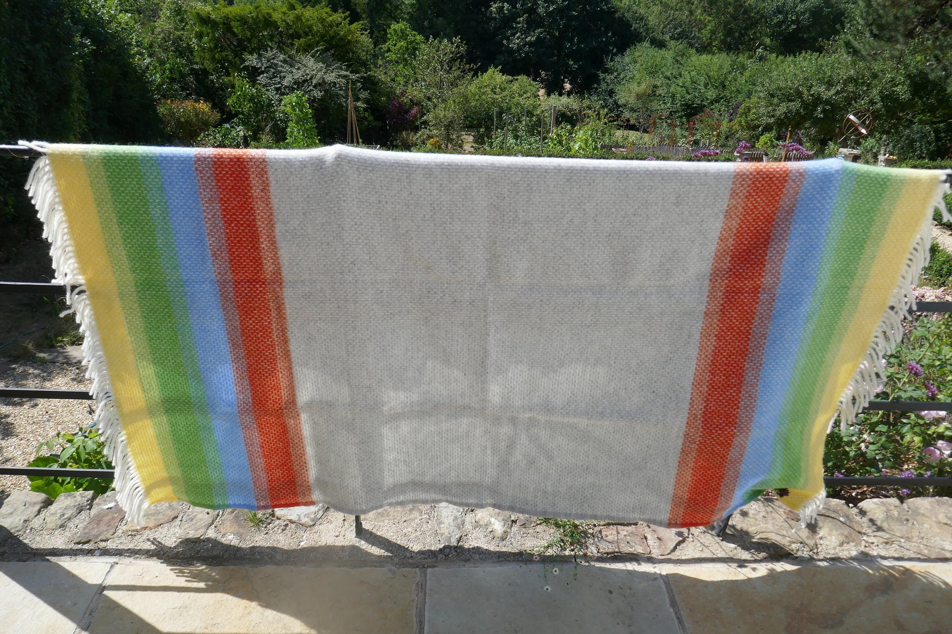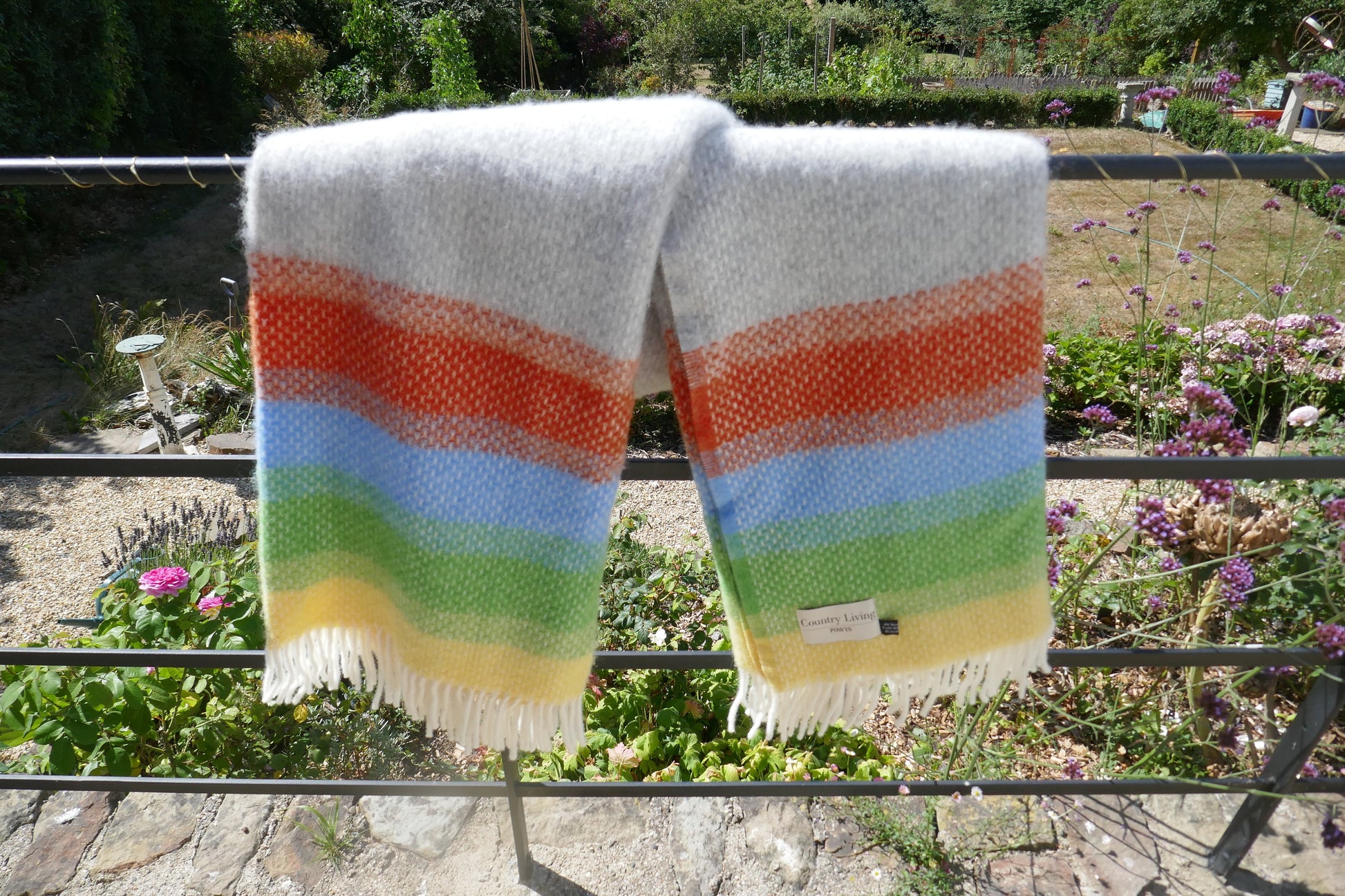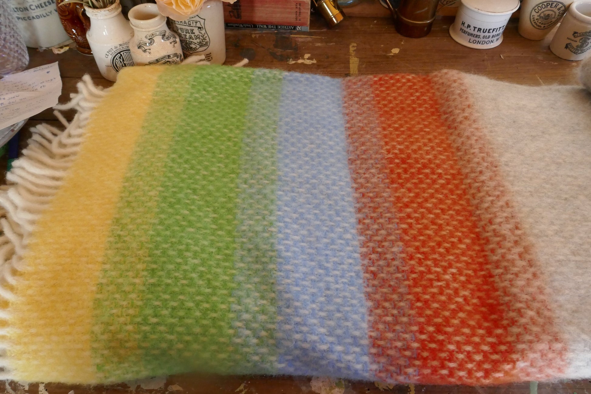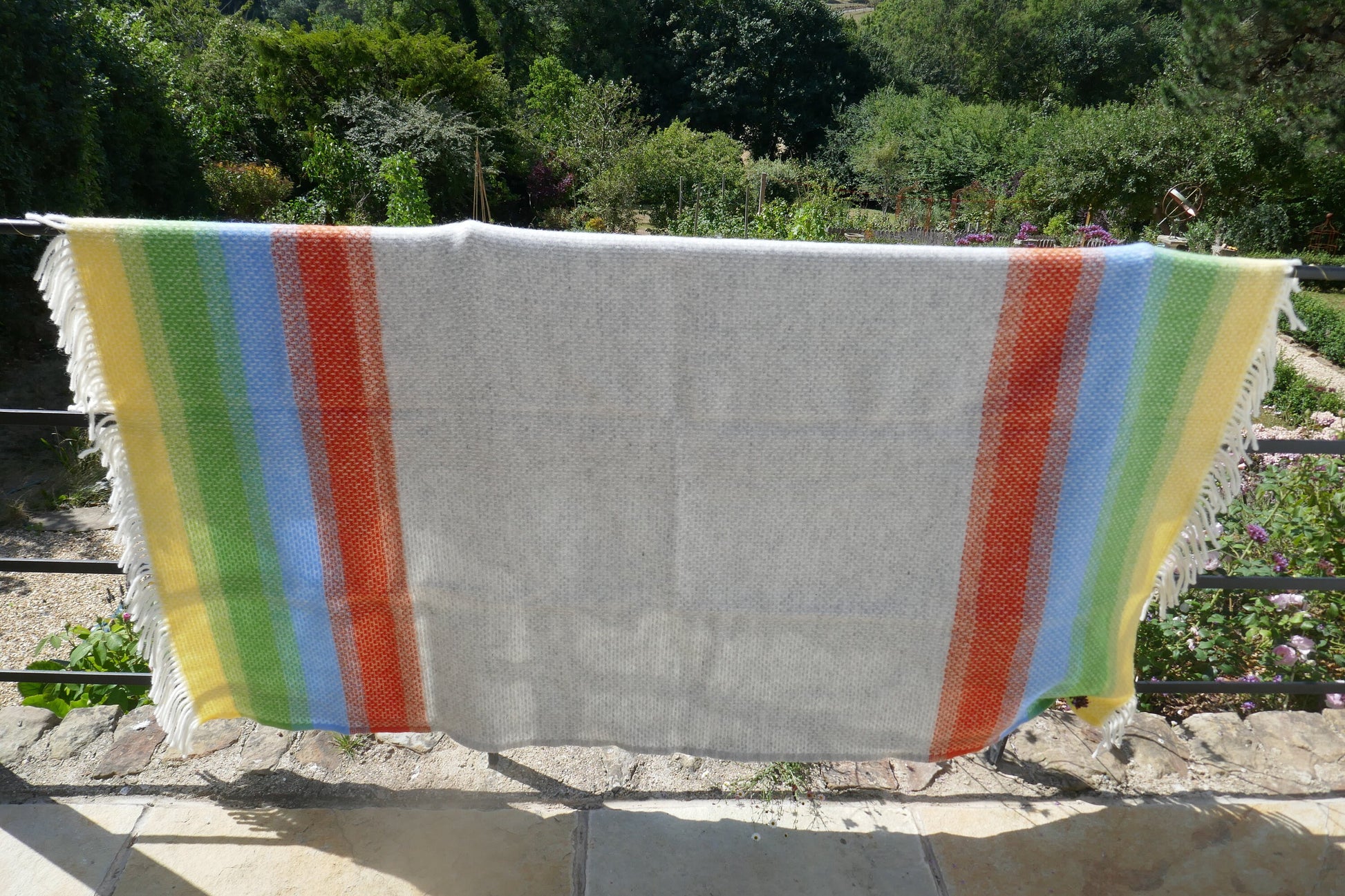 In a wonderful pale blue, green, yellow and orange herringbone stripe with a fringed edge.