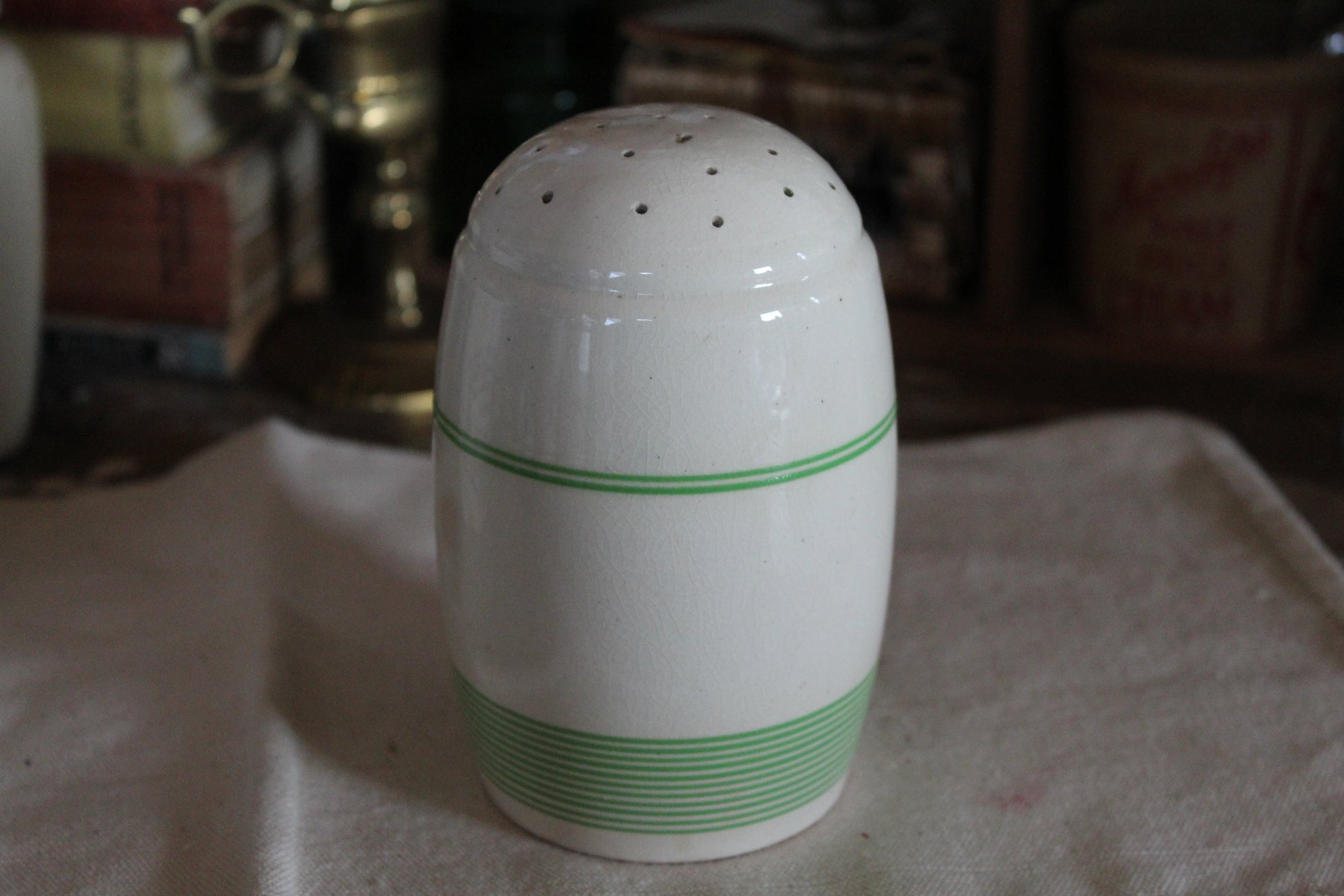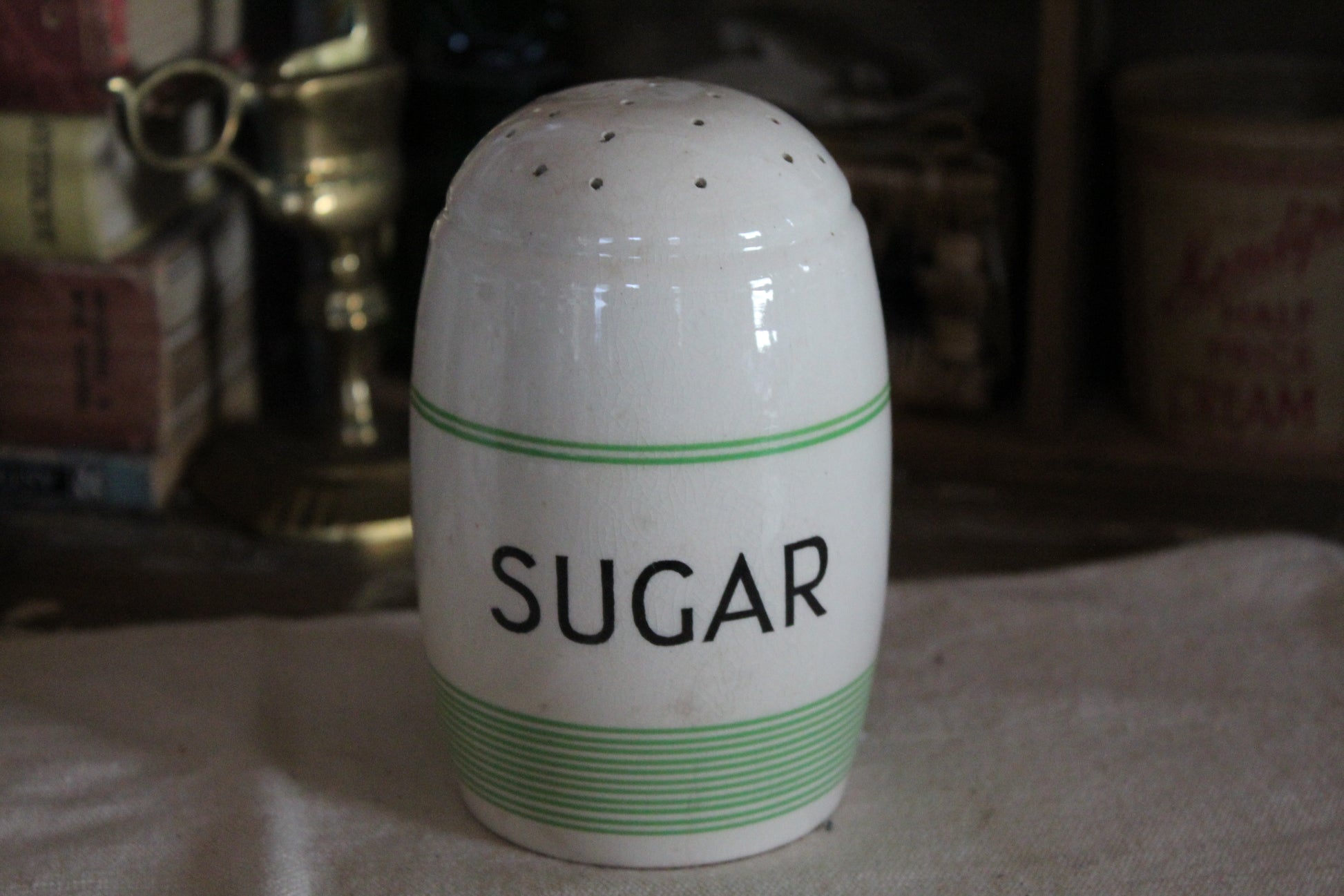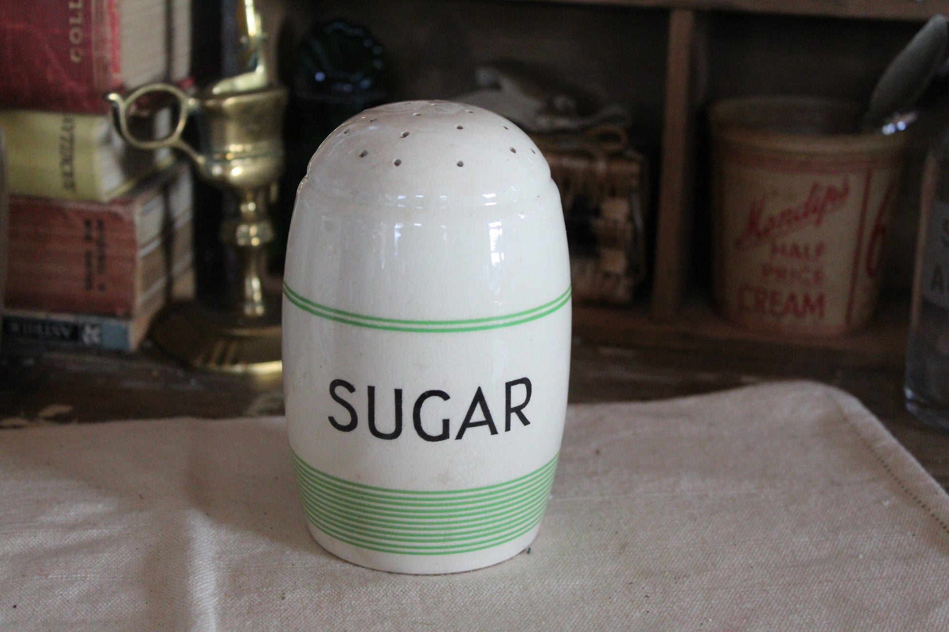 Lovely Kleen Kitchen brand green and white sugar shaker made in England circa 1930s.