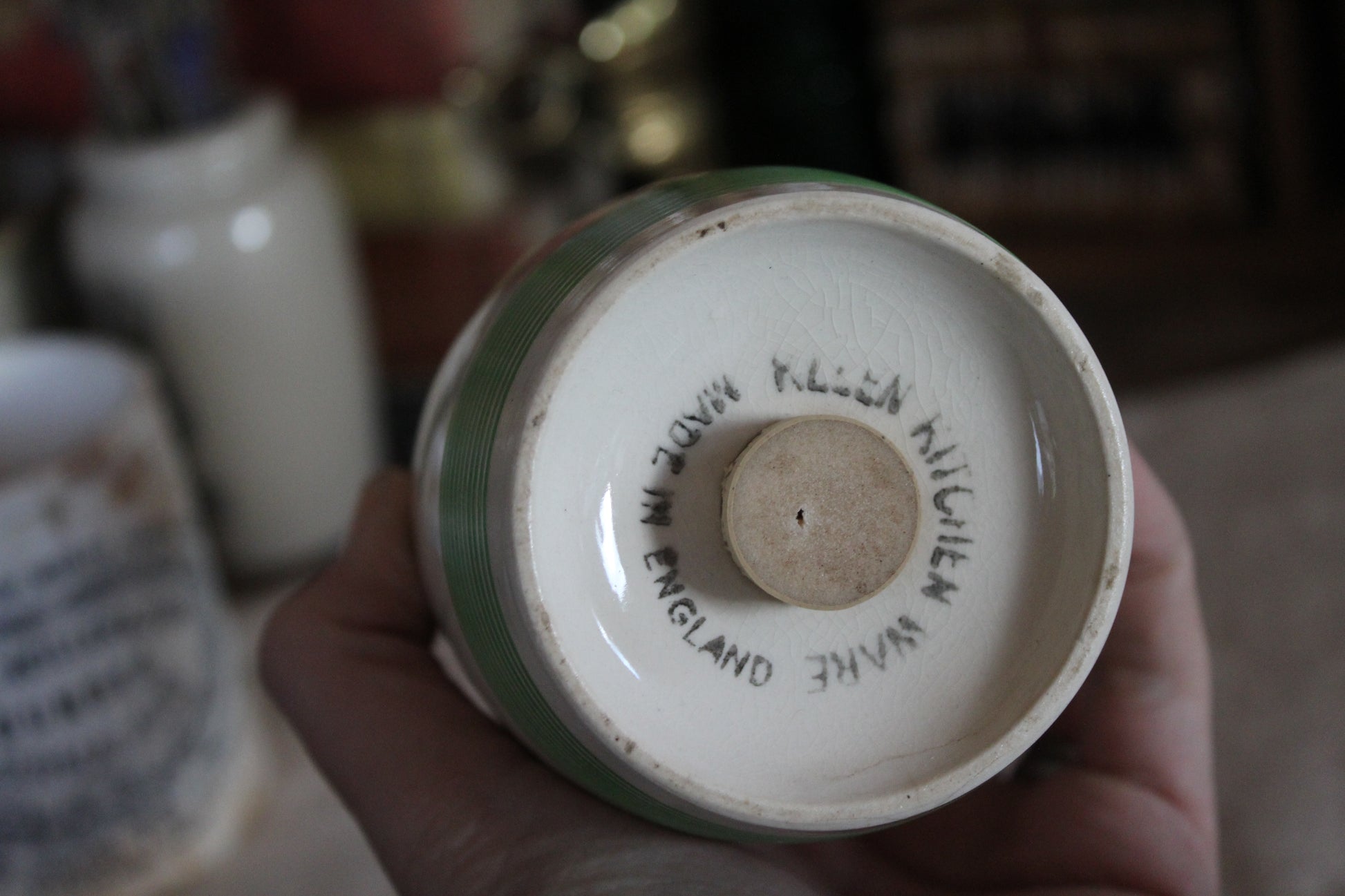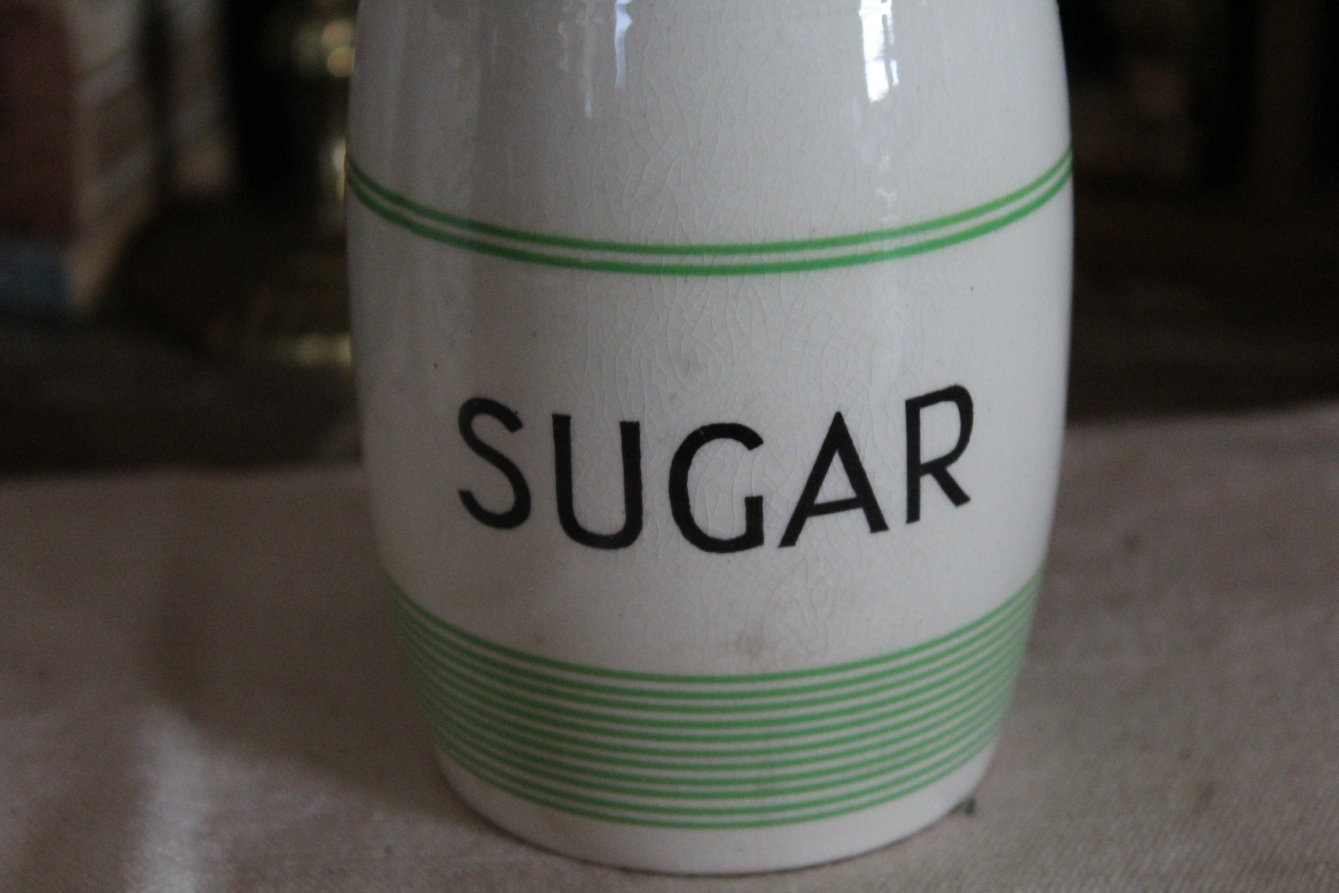 Lovely green and white shaker with black Sugar label to the front. No chips or cracks some crazing but great condition for its age. Has its original stopper.