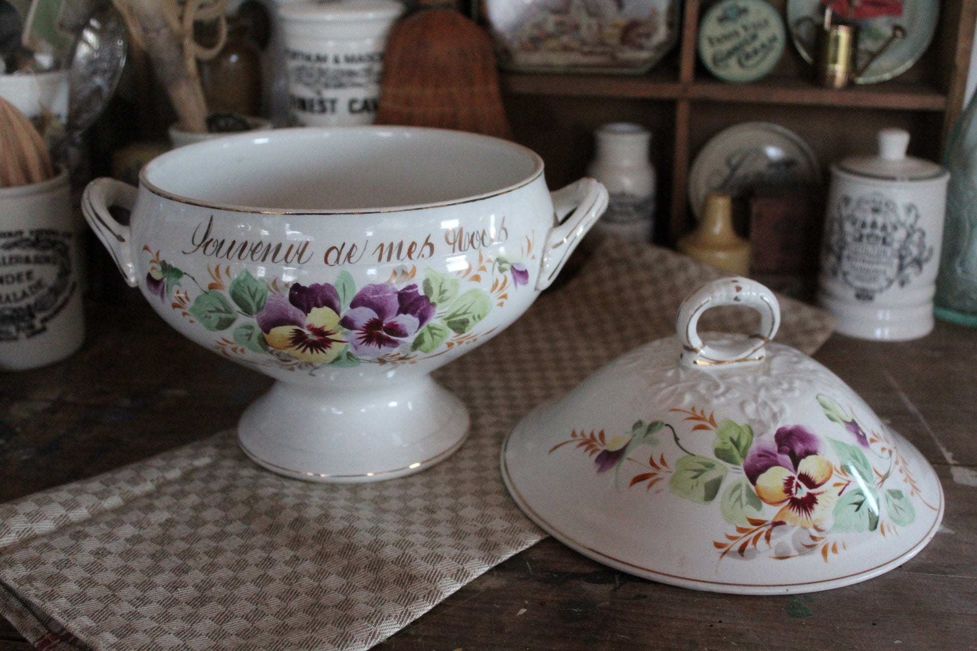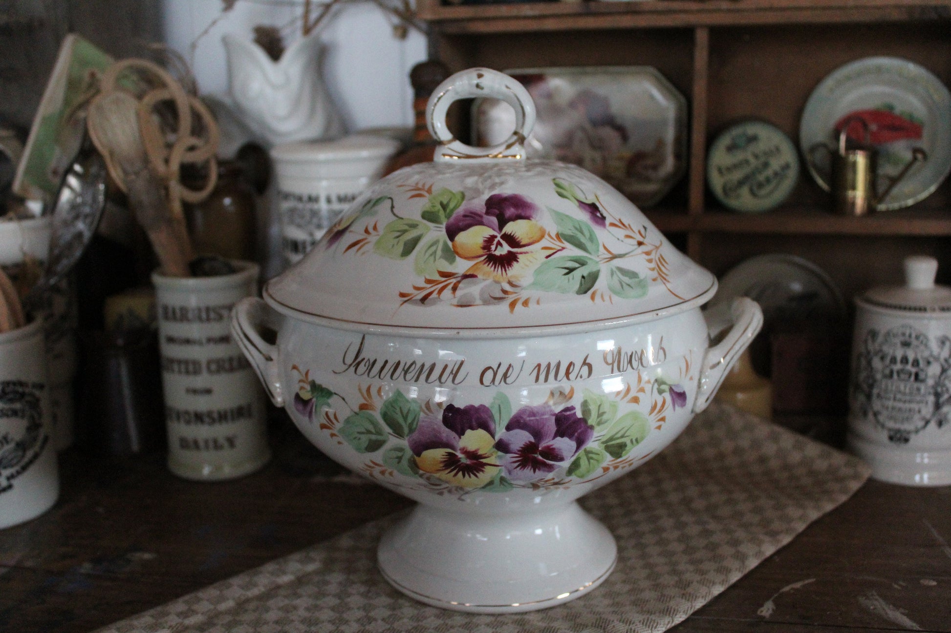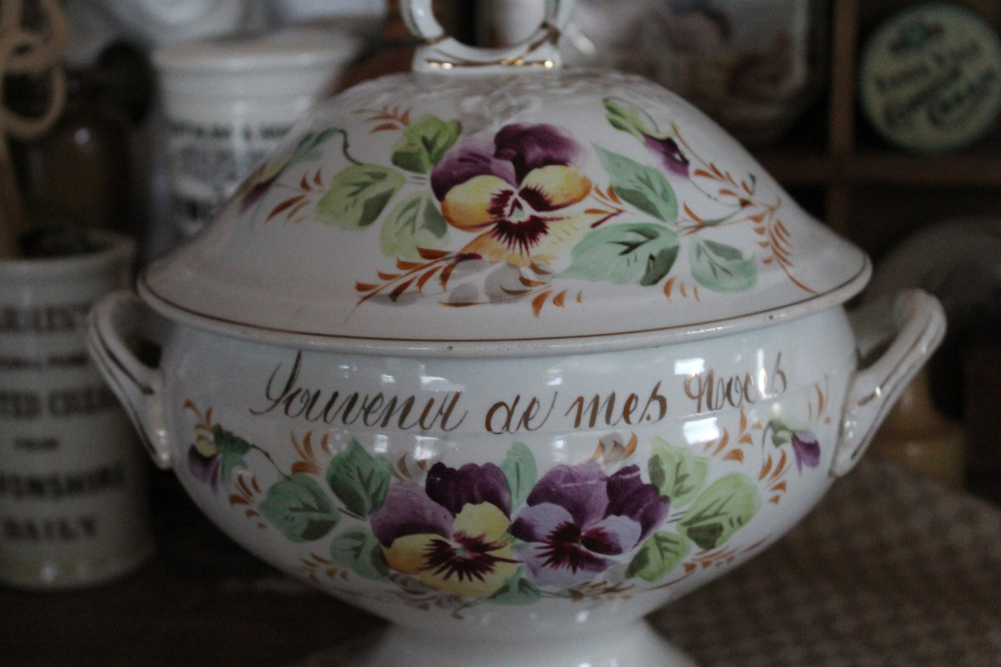 Beautiful rare tureen that was made to celebrate a marriage and would have been given as a wedding gift. French Ironstone with beautiful hand painted pansy detailing. Pansy flowers were used in ancient times as a symbol of love, which is a very touching addition in the design. It translates into ' Memory of my wedding'. It would have been given as a gift for the bride to use in her new married life. So precious!