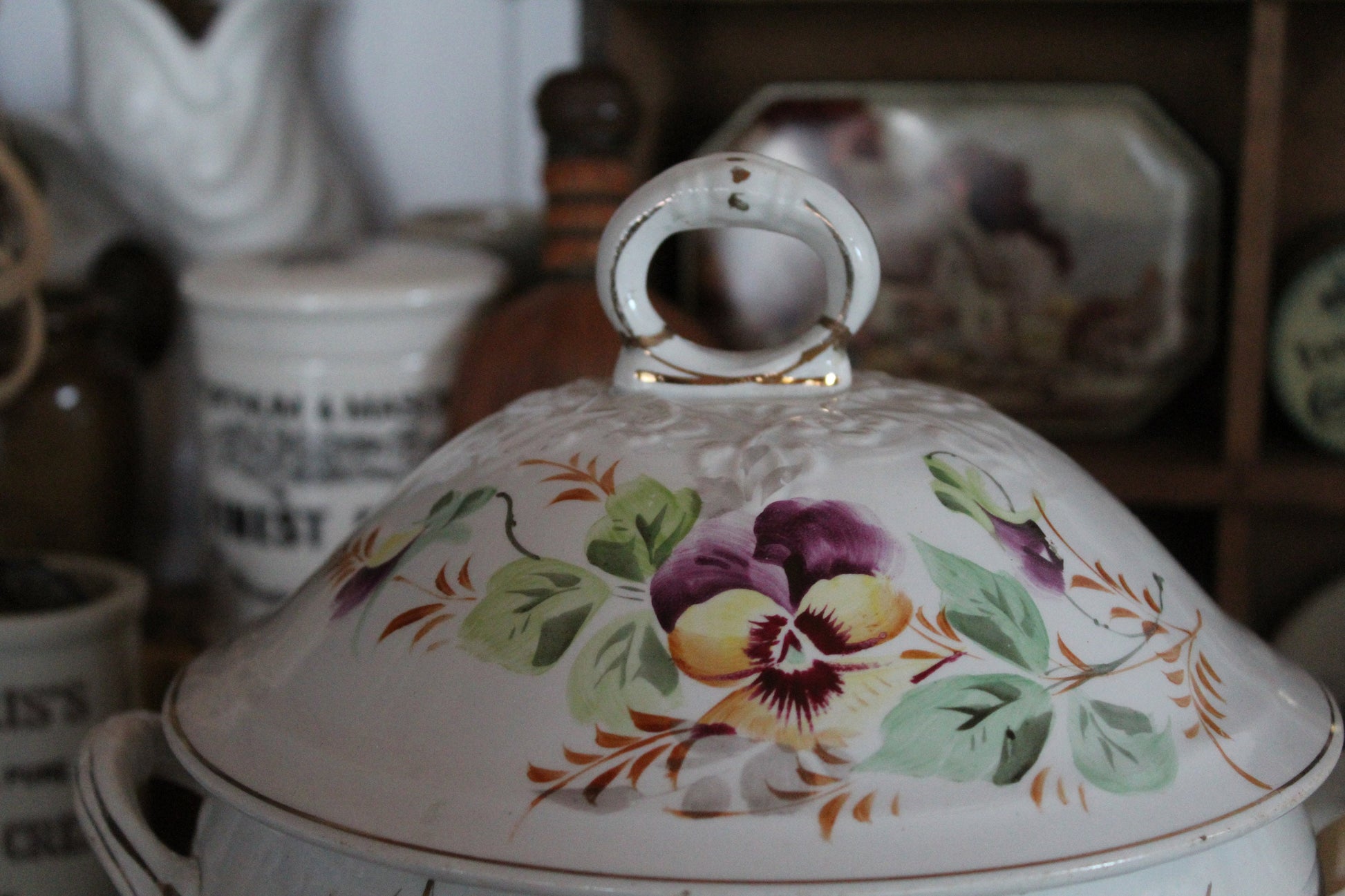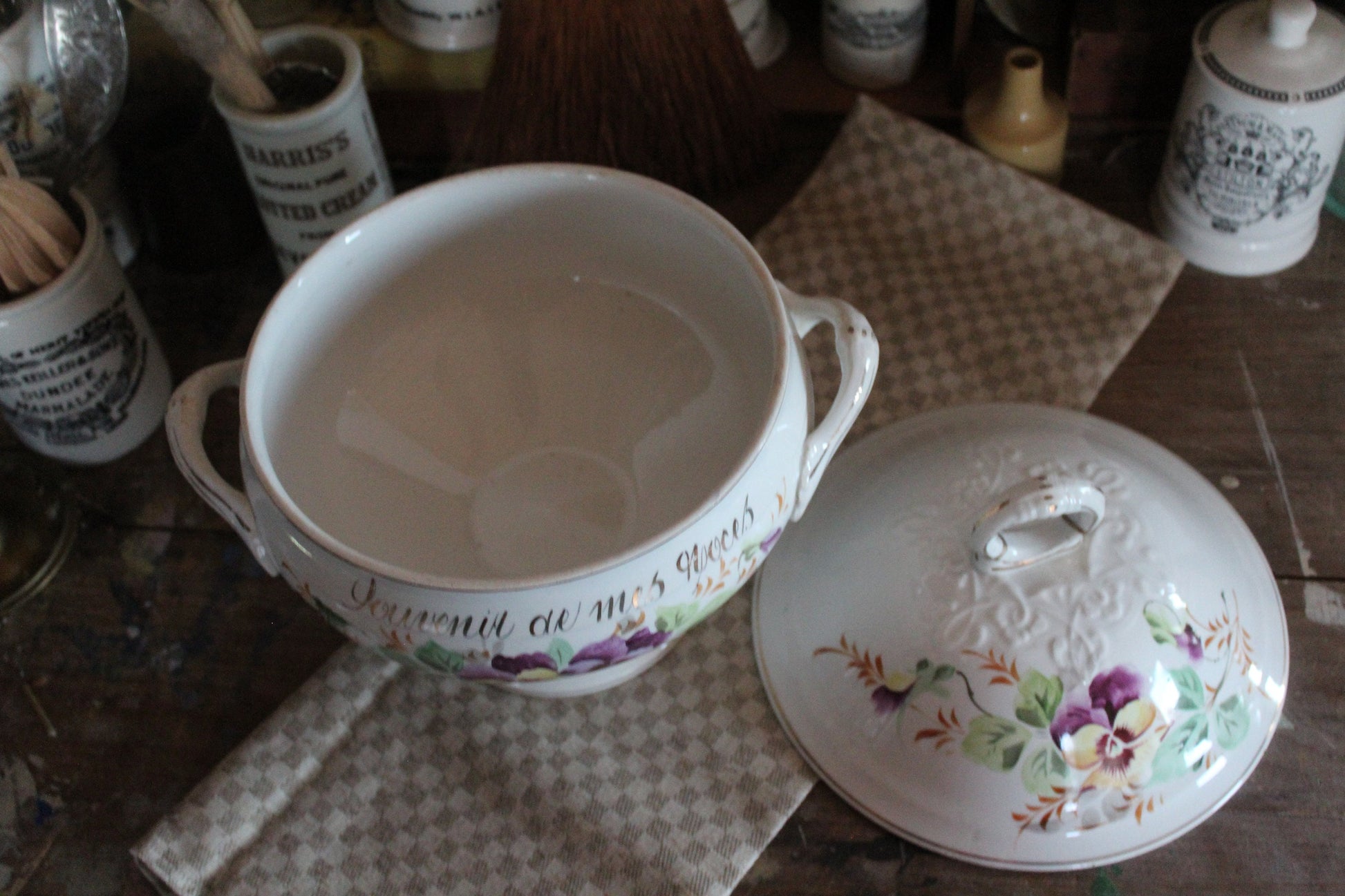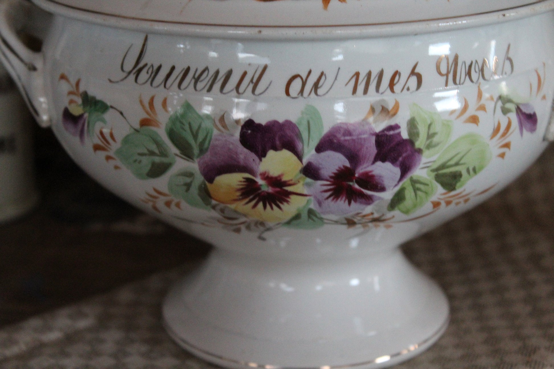 Beautiful rare tureen that was made to celebrate a marriage and would have been given as a wedding gift. French Ironstone with beautiful hand painted pansy detailing. Pansy flowers were used in ancient times as a symbol of love, which is a very touching addition in the design. It translates into ' Memory of my wedding'. It would have been given as a gift for the bride to use in her new married life. So precious!