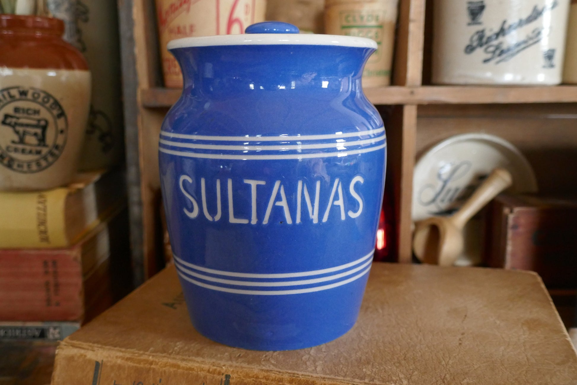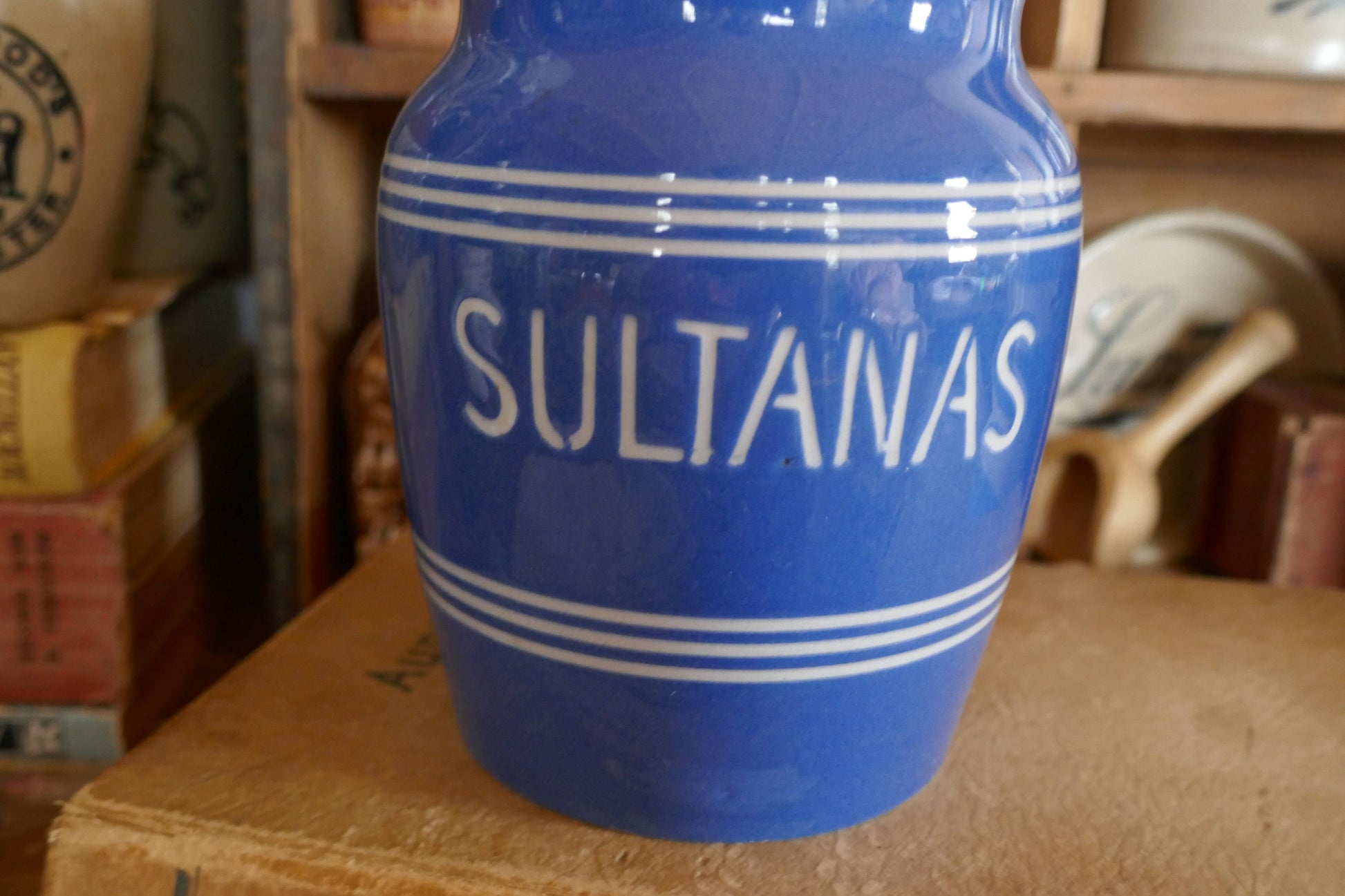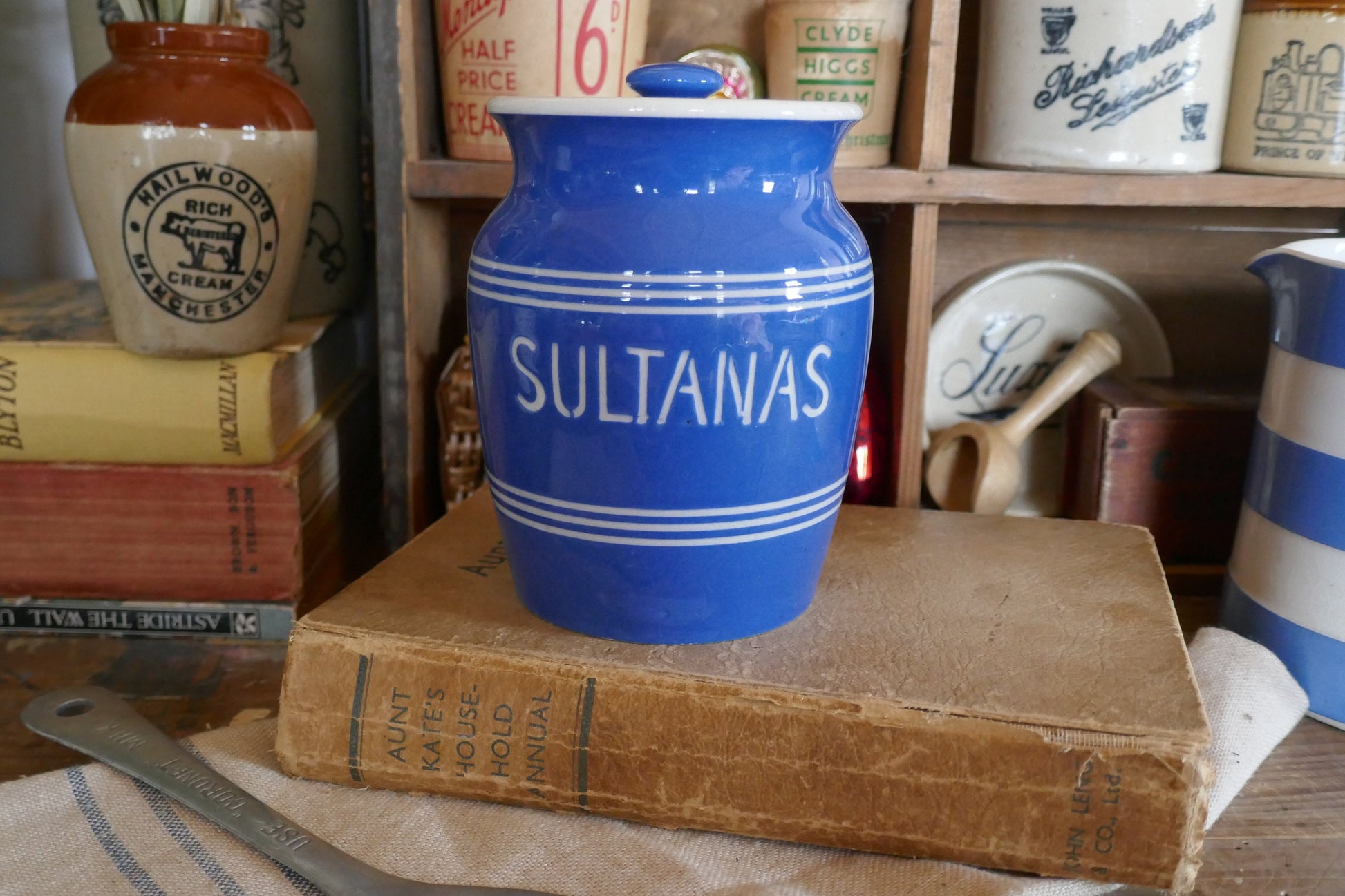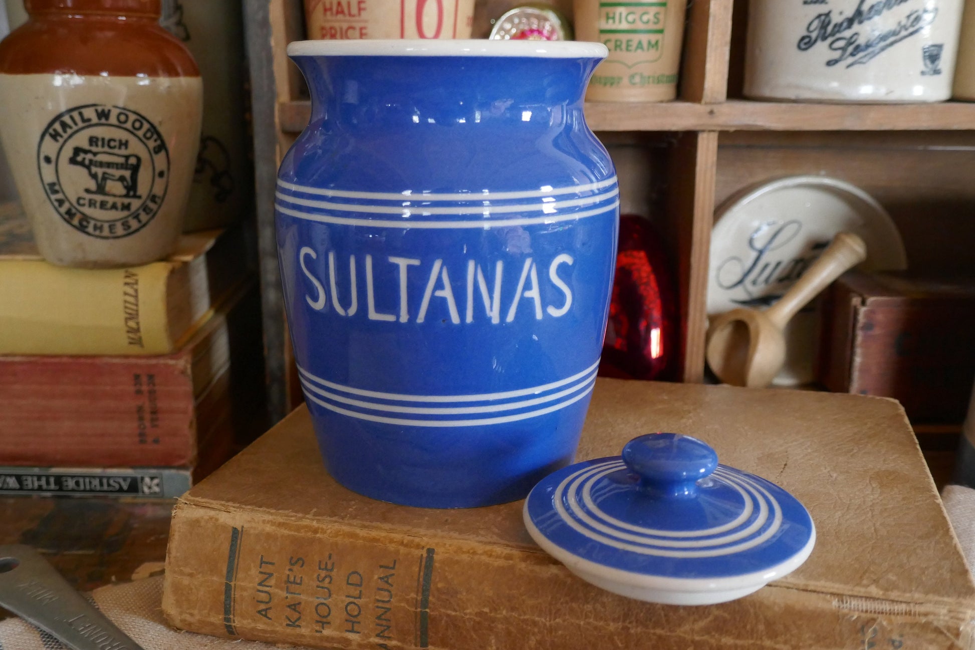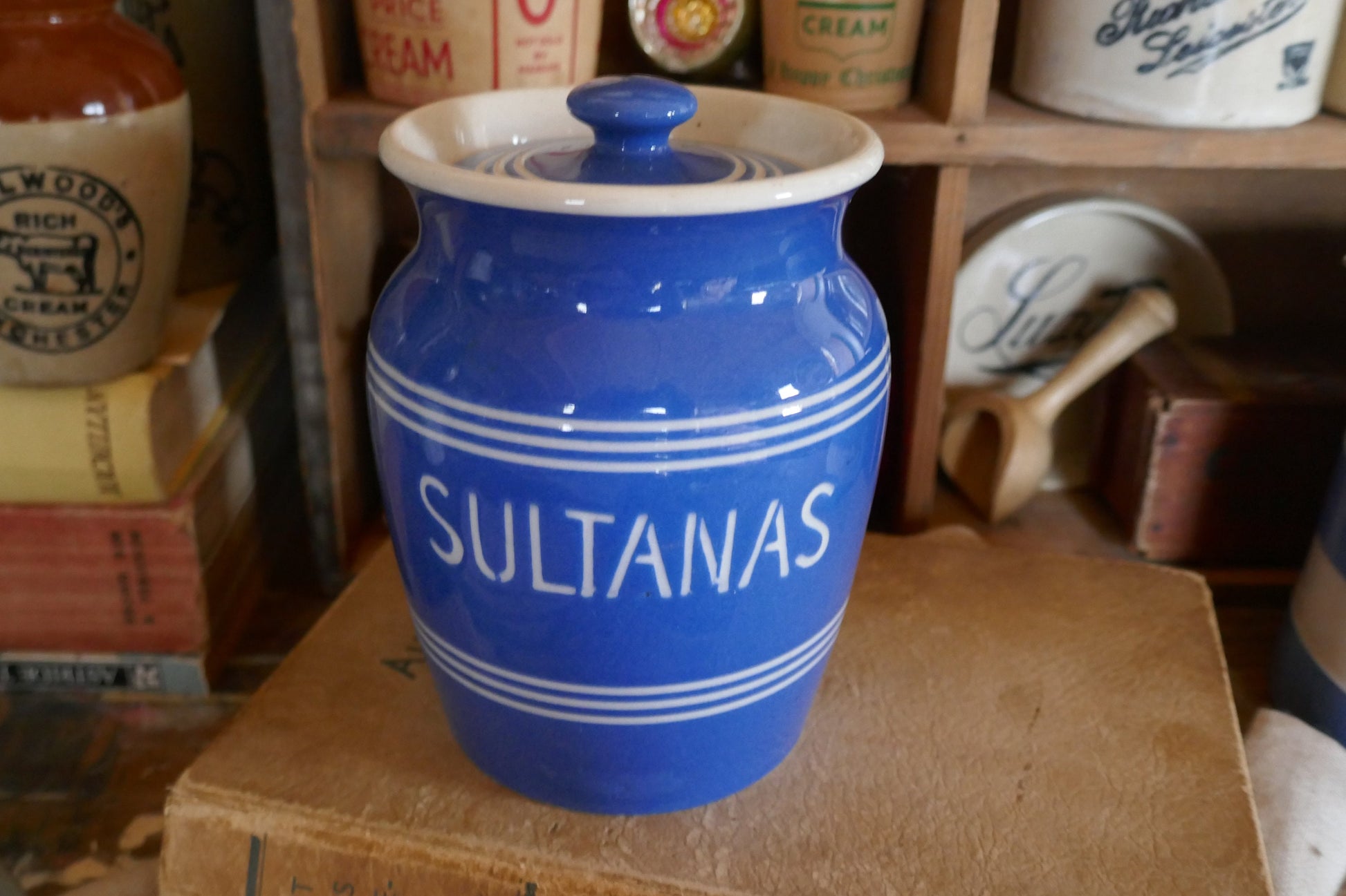 Very rare unusual 1930s Bretby 'Kitchen Kupboard' Ware 'Sultanas' storage jar.