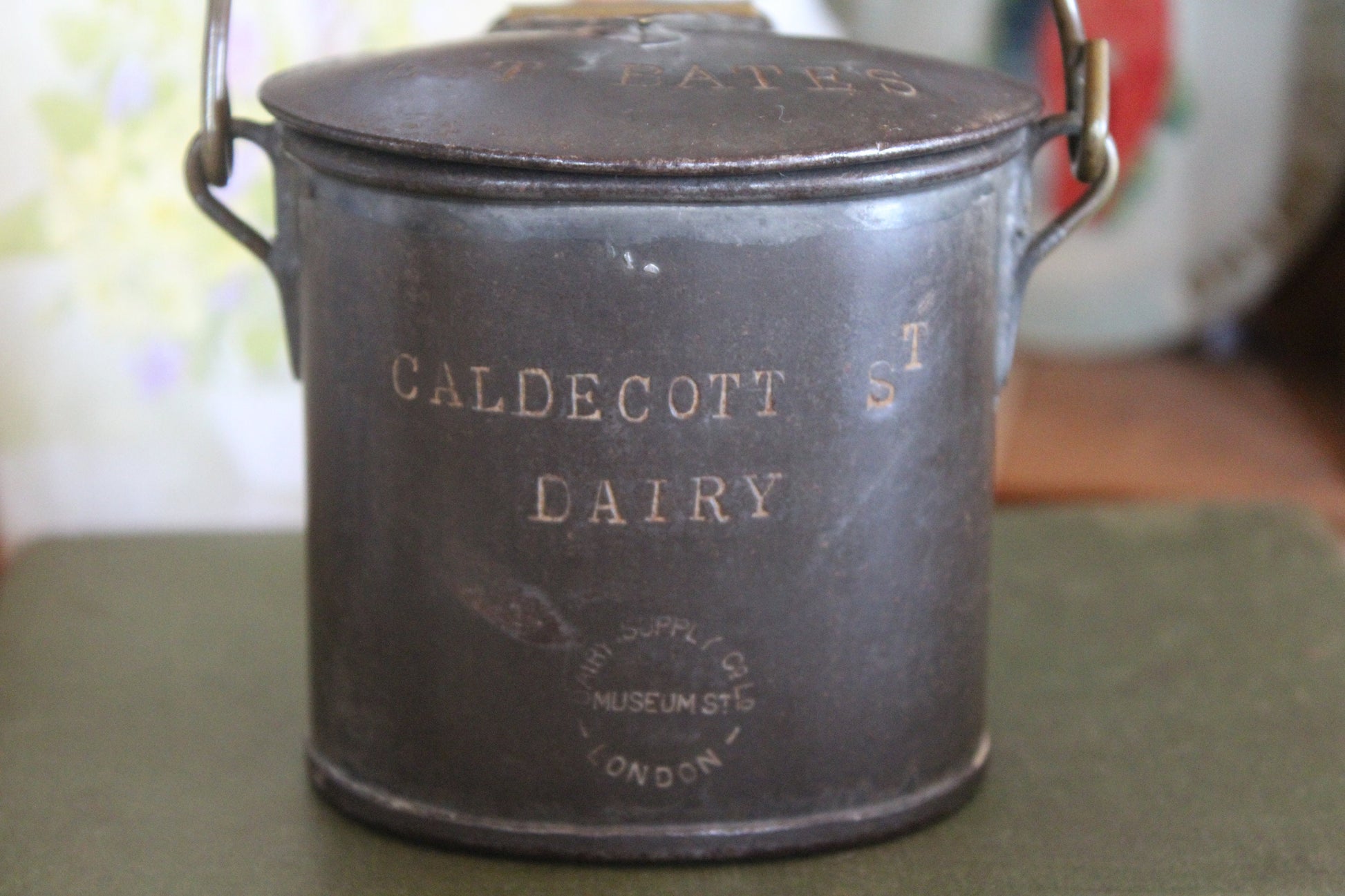 To the top it has a makers mark to the brass hinge, the top is engraved with E T Bates, who we believe to possibly be the milk seller. To the front it has Caldecott St Dairy engraved and then the makers mark of the tin, 'Dairy Supply Company, Museum Street, London.