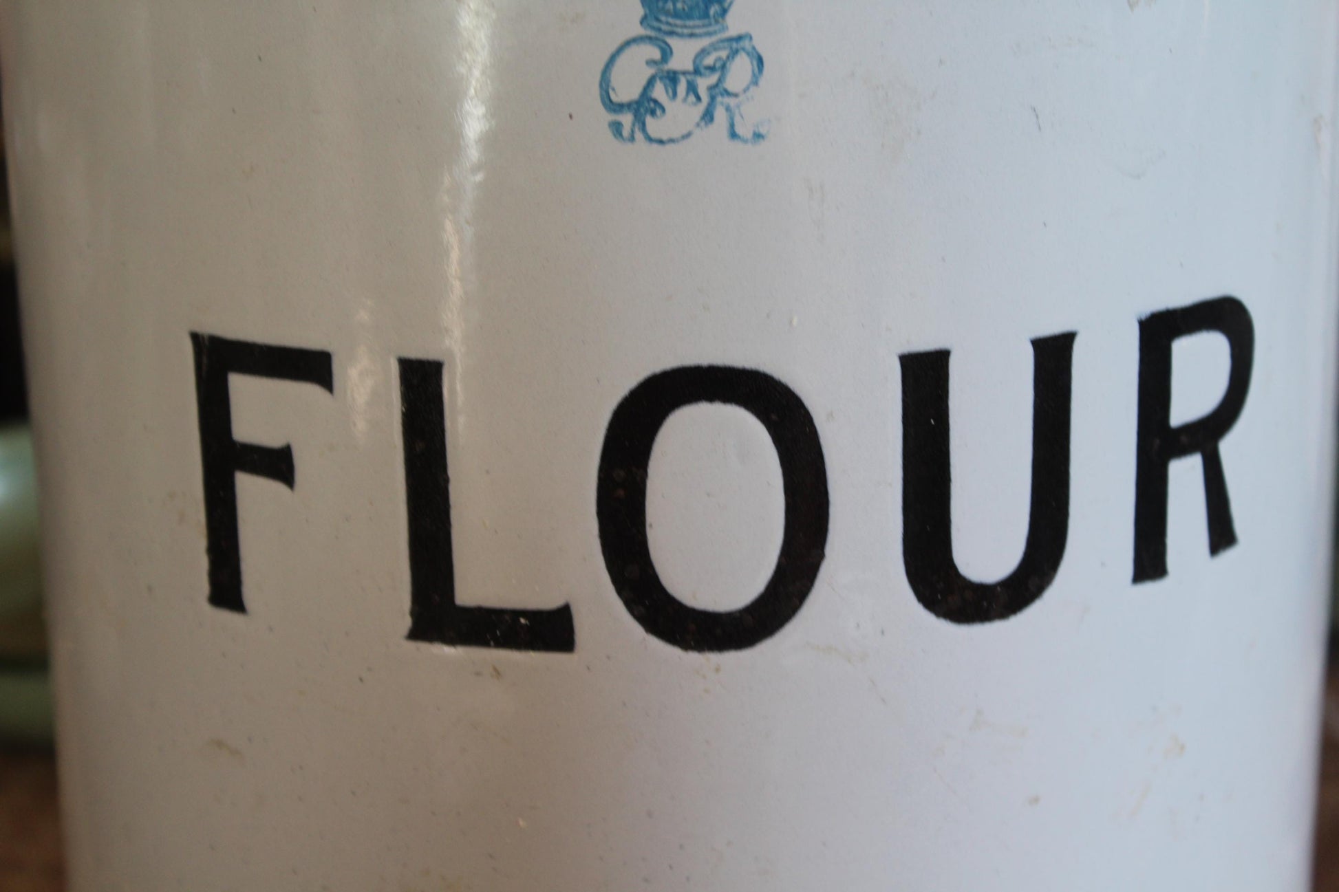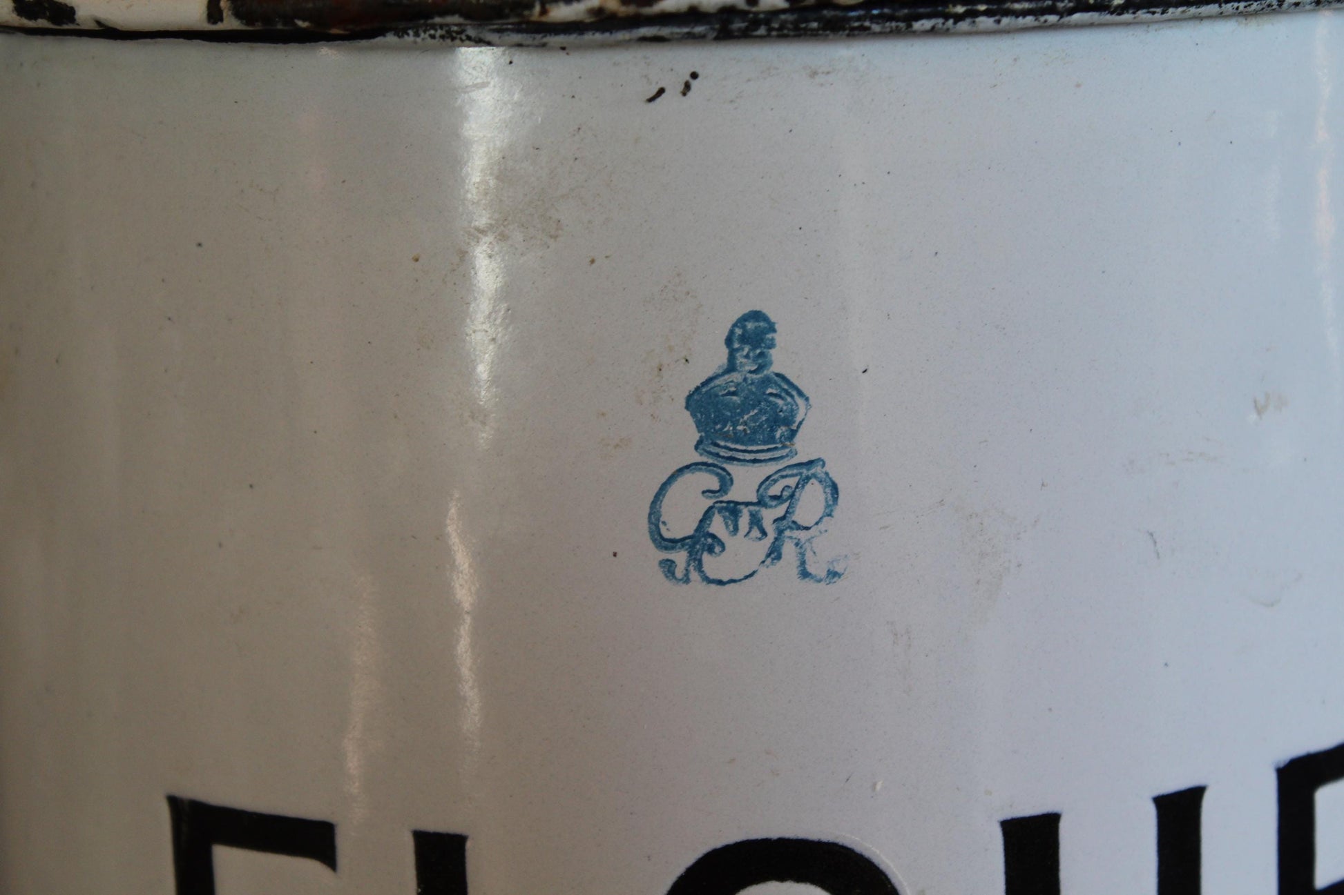 Rare enamel flour bin stamped with the late King George monogram, dating it to the 1930s.