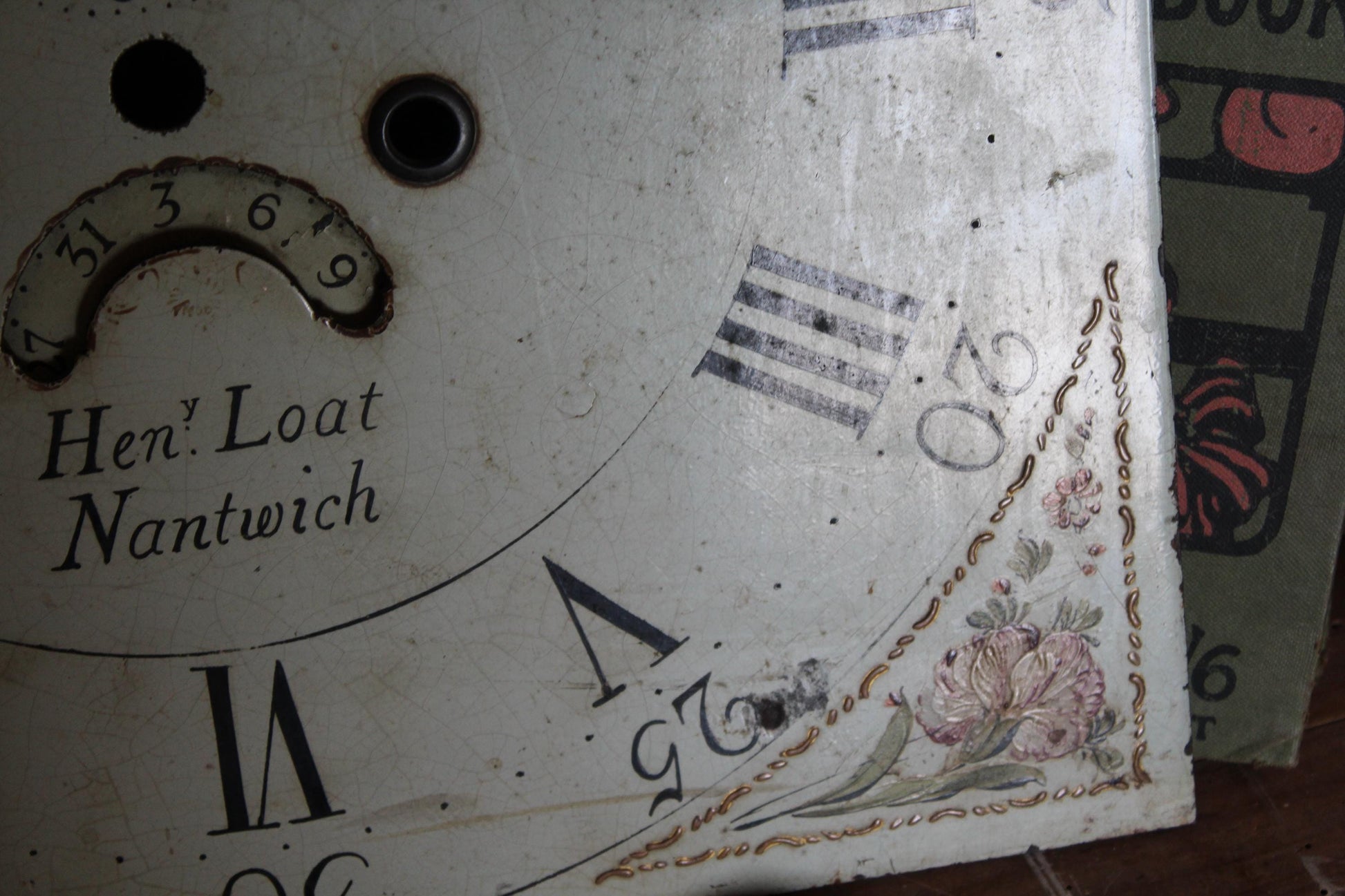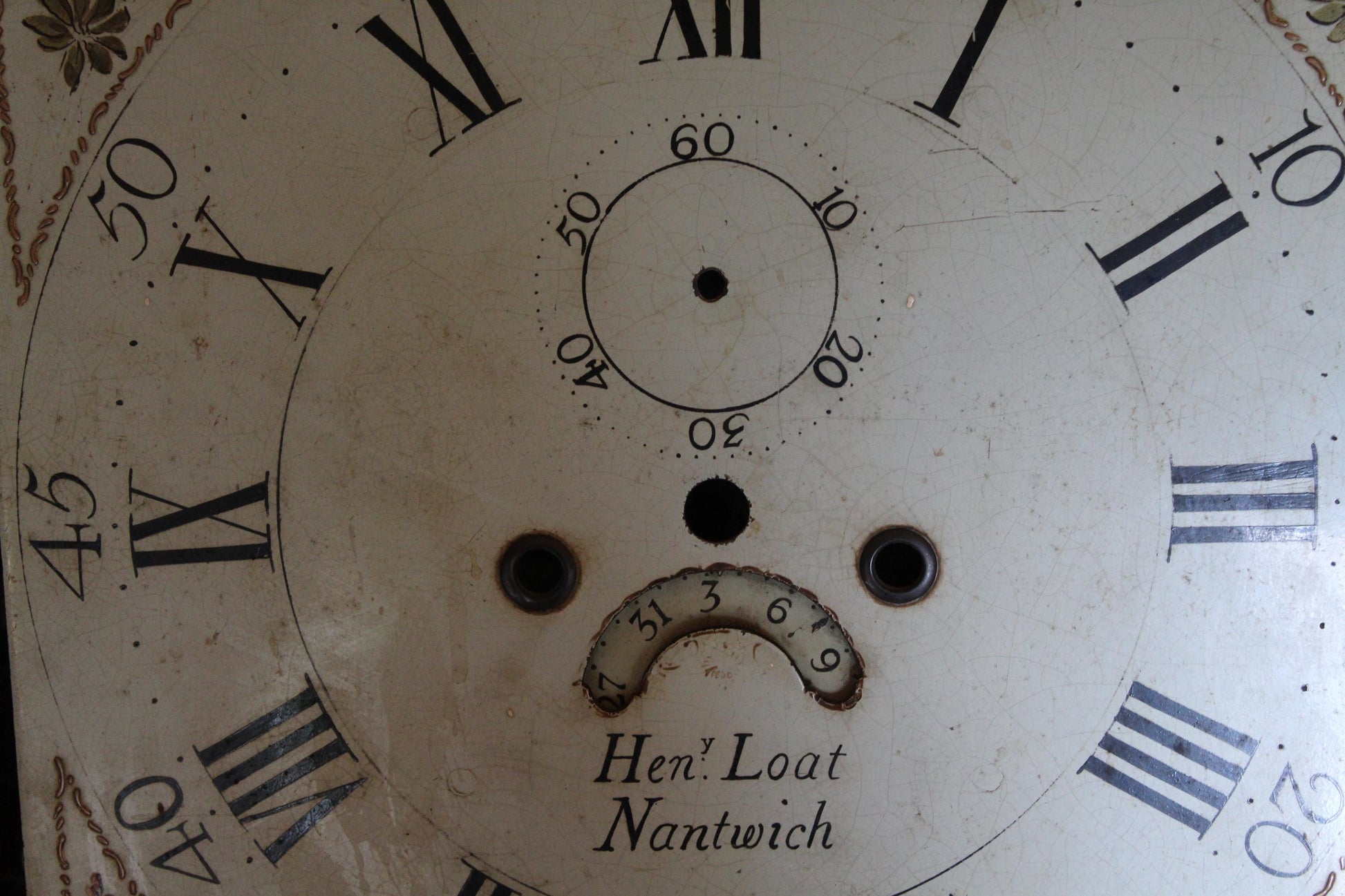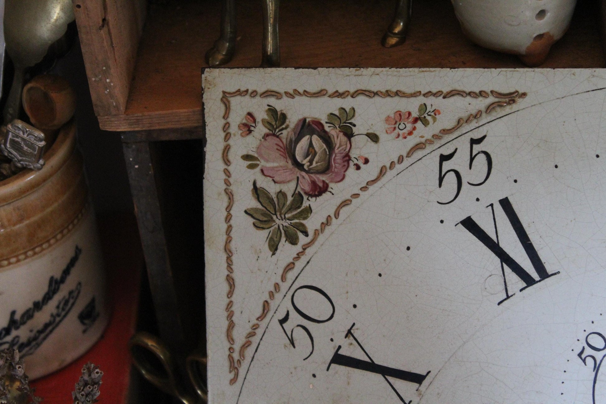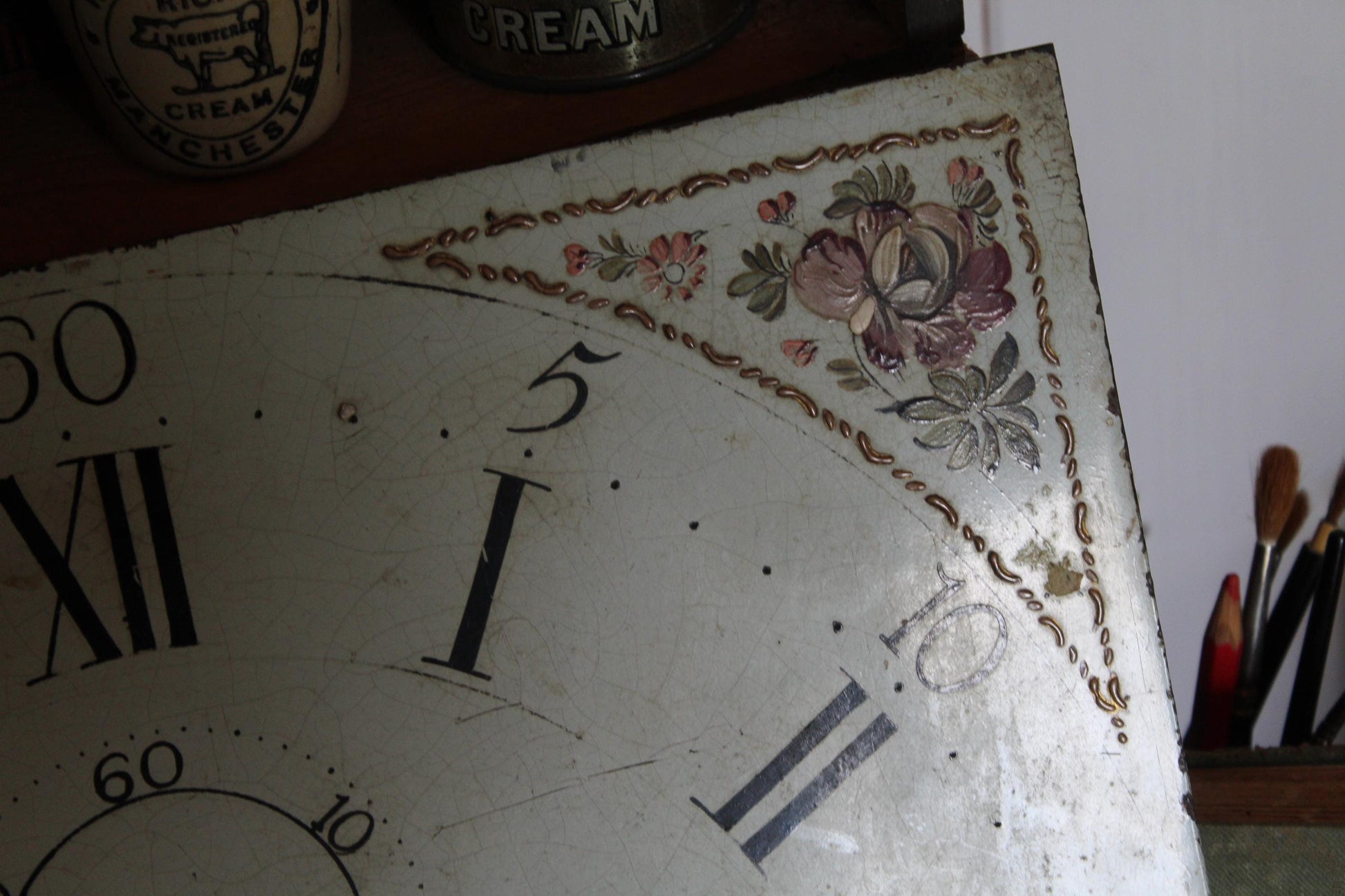 Beautiful antique salvaged grandfather clock face with hand painted face with stunning gold and floral detailing.