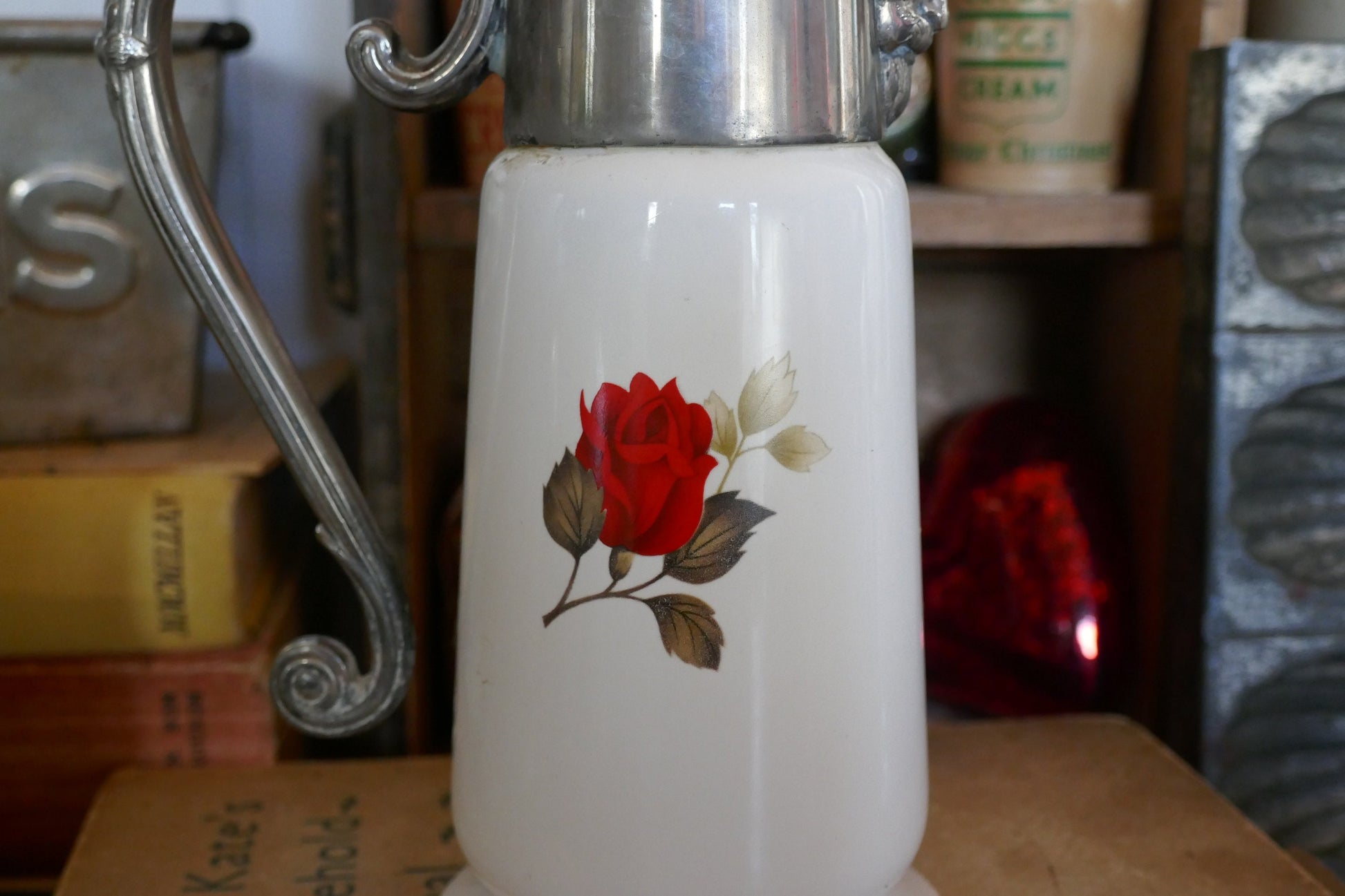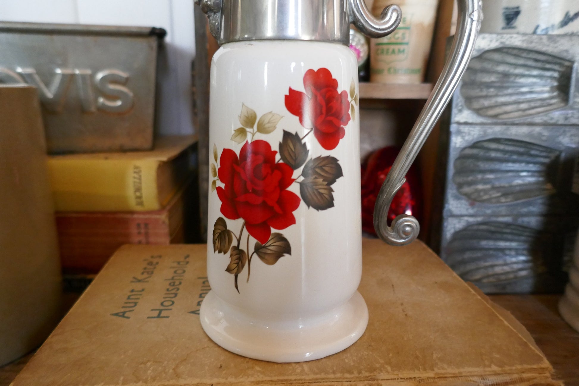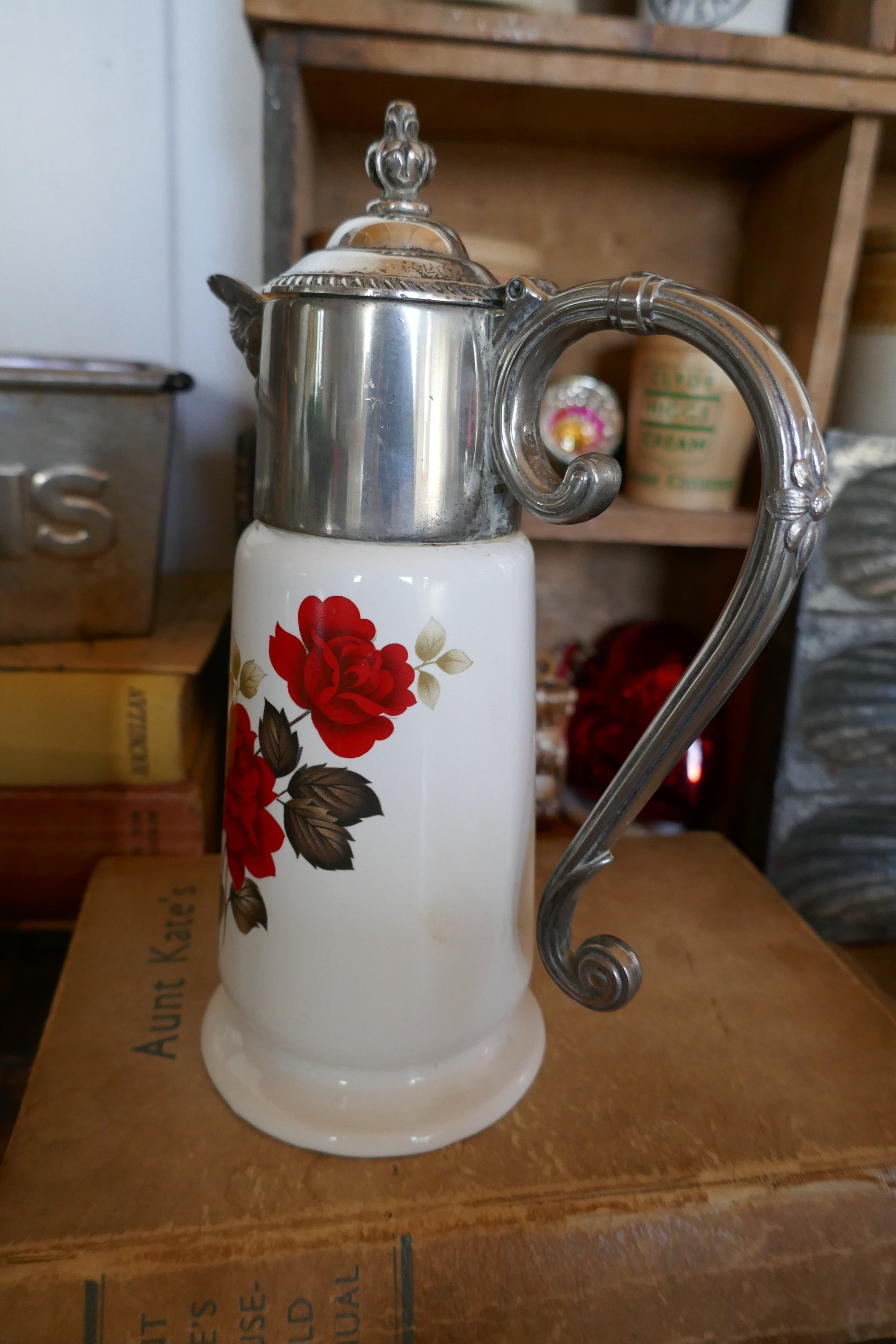 Vintage claret jug with lovely red rose detailing.