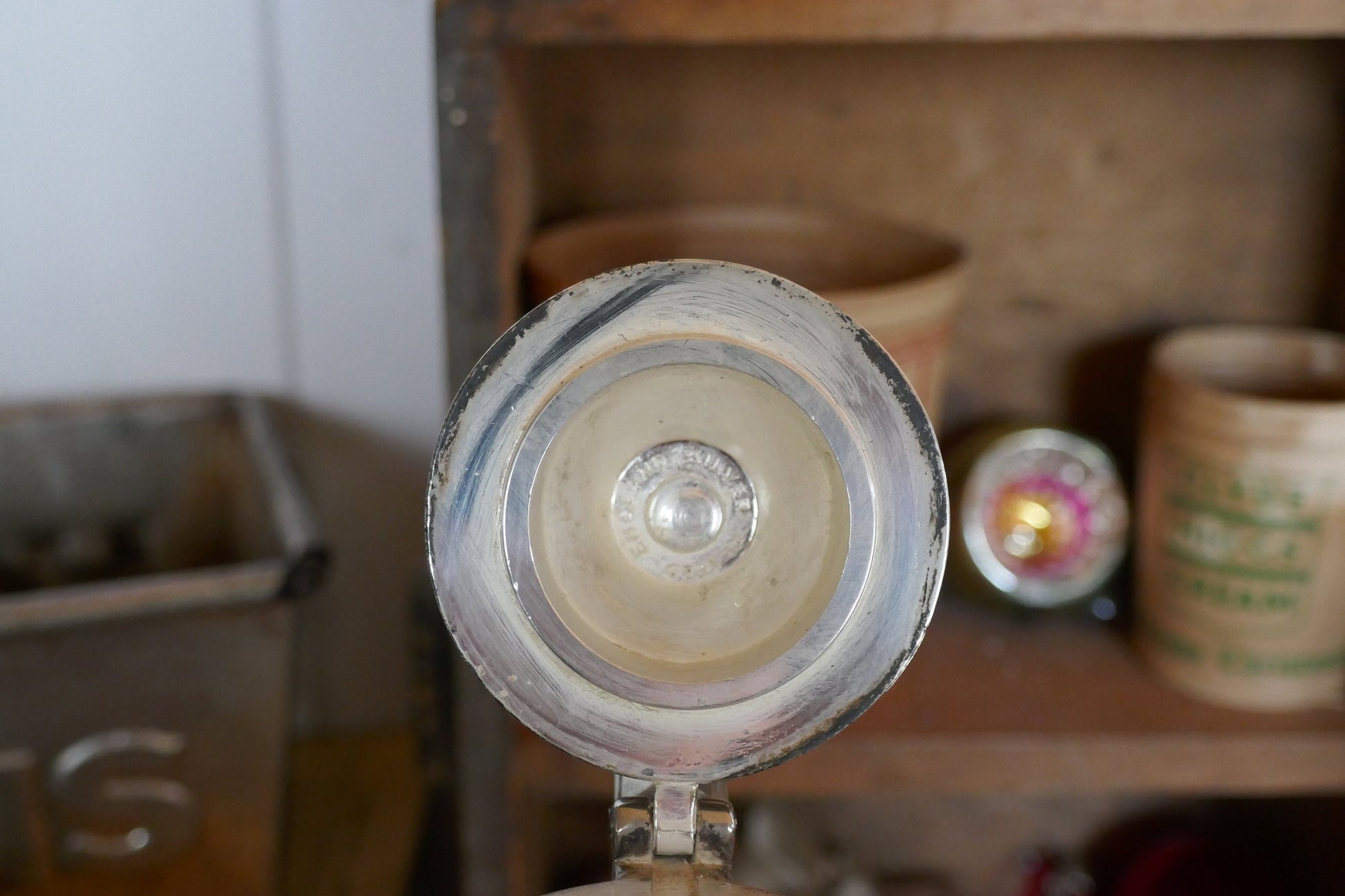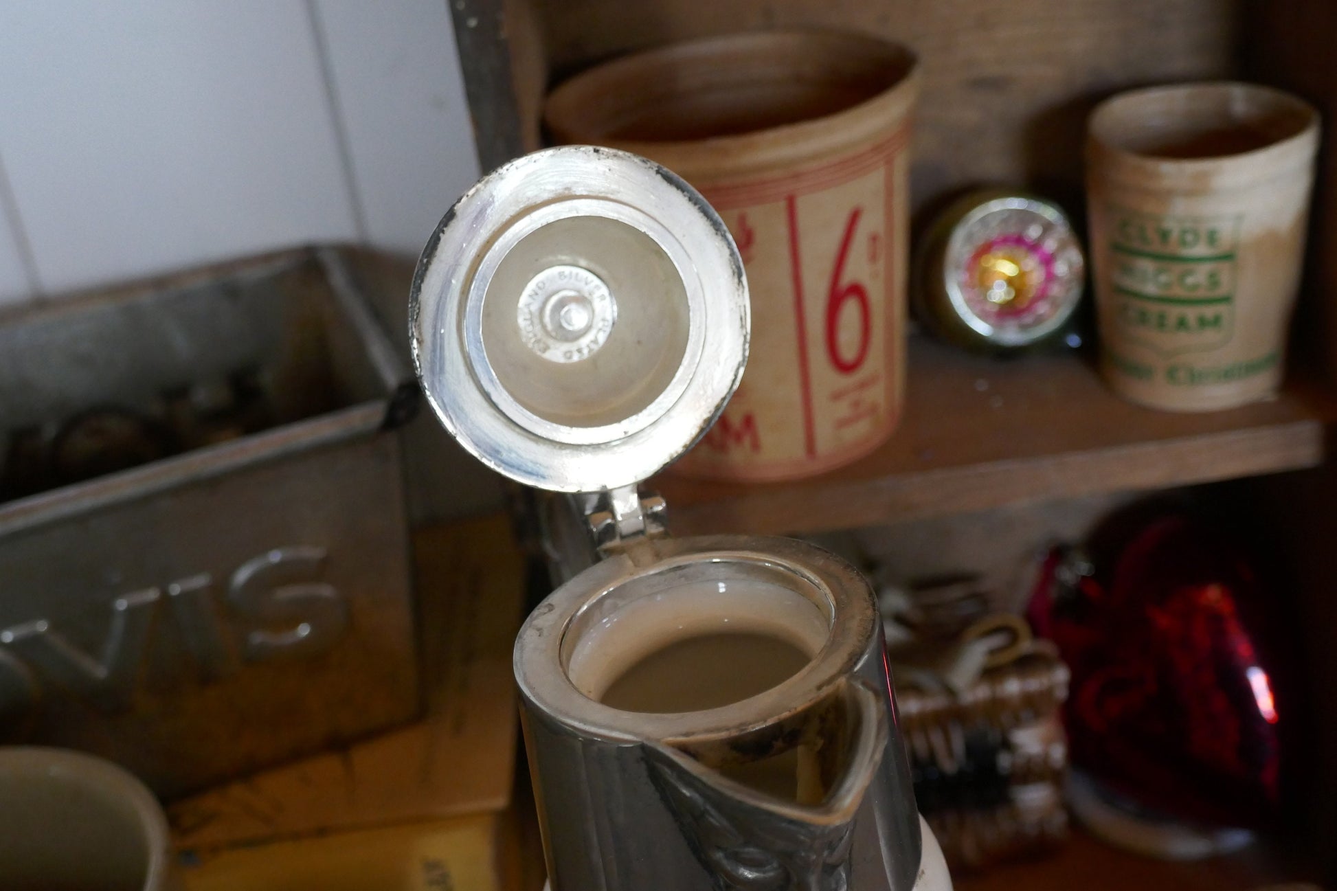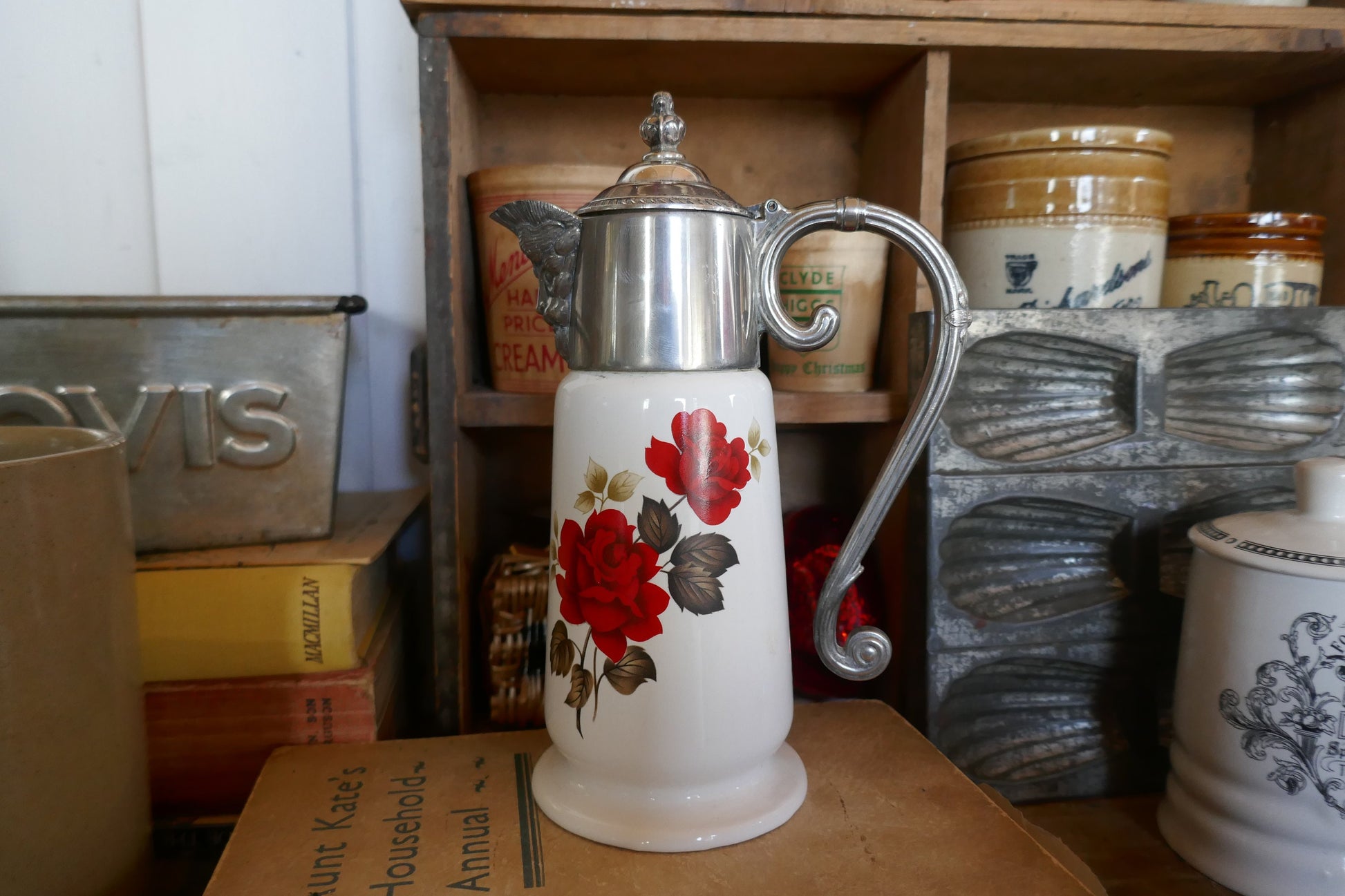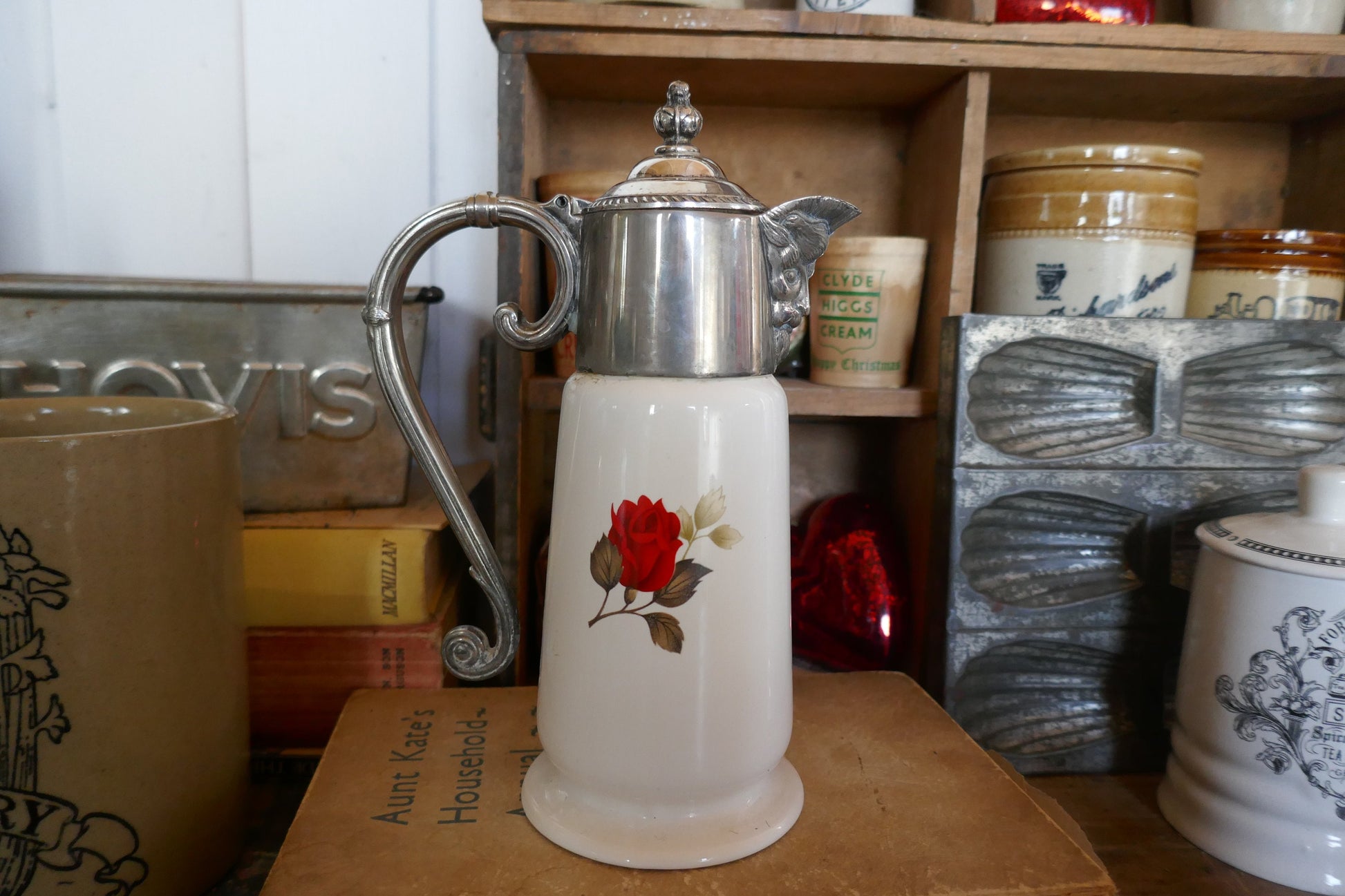 This jug is in good vintage condition, no chips or cracks, minimal rubbing and tarnishing to the silver metal, nothing too bad and just adds to the patina of the jug. Still usable. Stamped Made In England under the lid.