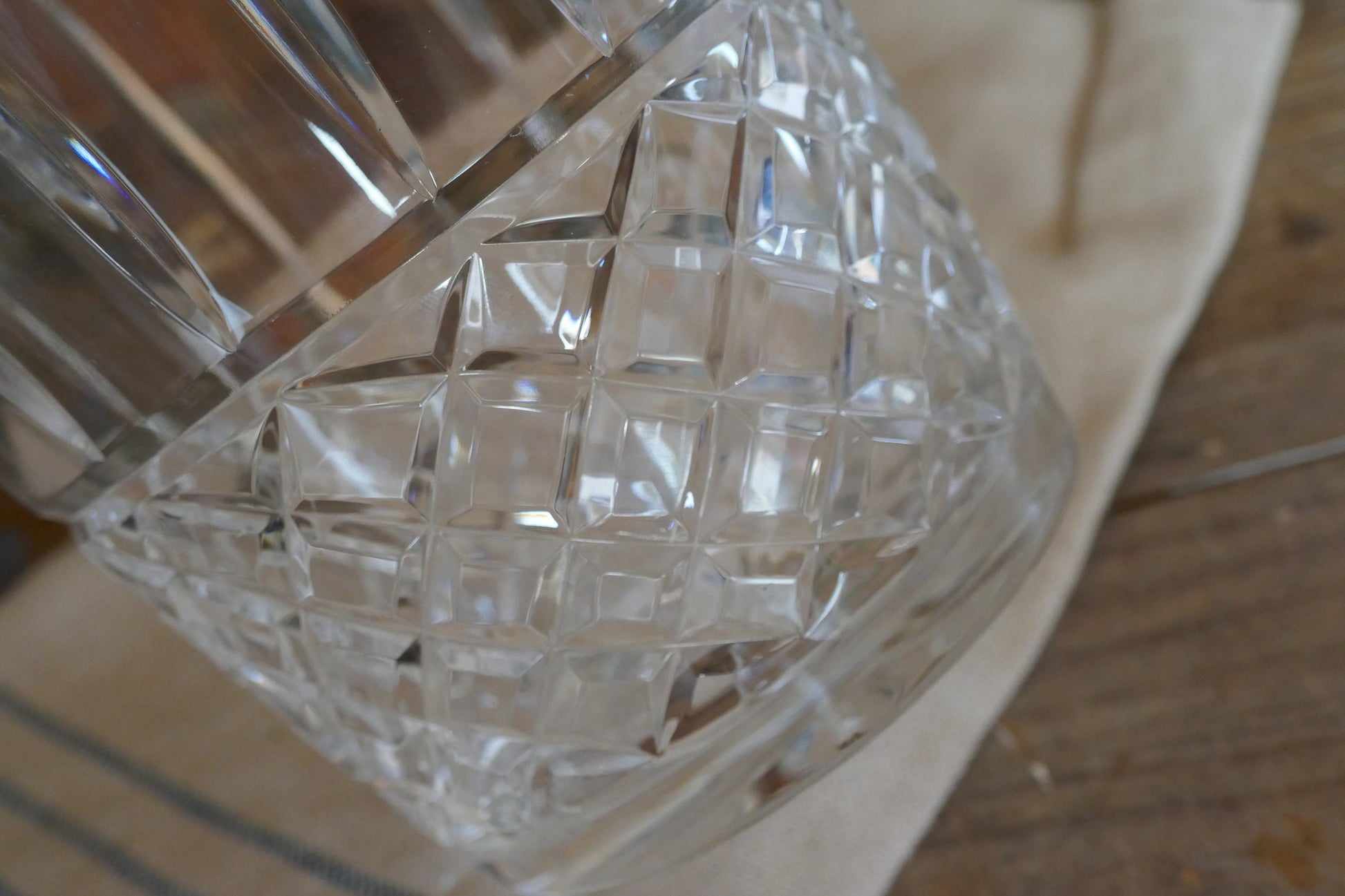 A pretty bucket that is made of heavy faceted cut glass and has the original label on it.