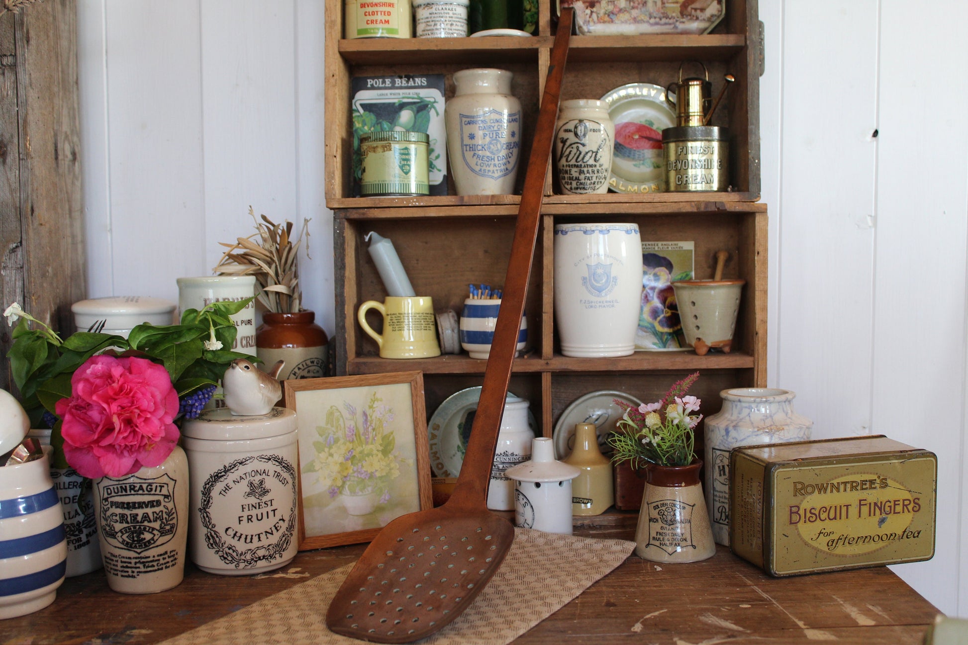 This Strainer utensil is completely usable and would look great hung from a kitchen hook. Originally used for skimming curd off of milk in the dairy process.
