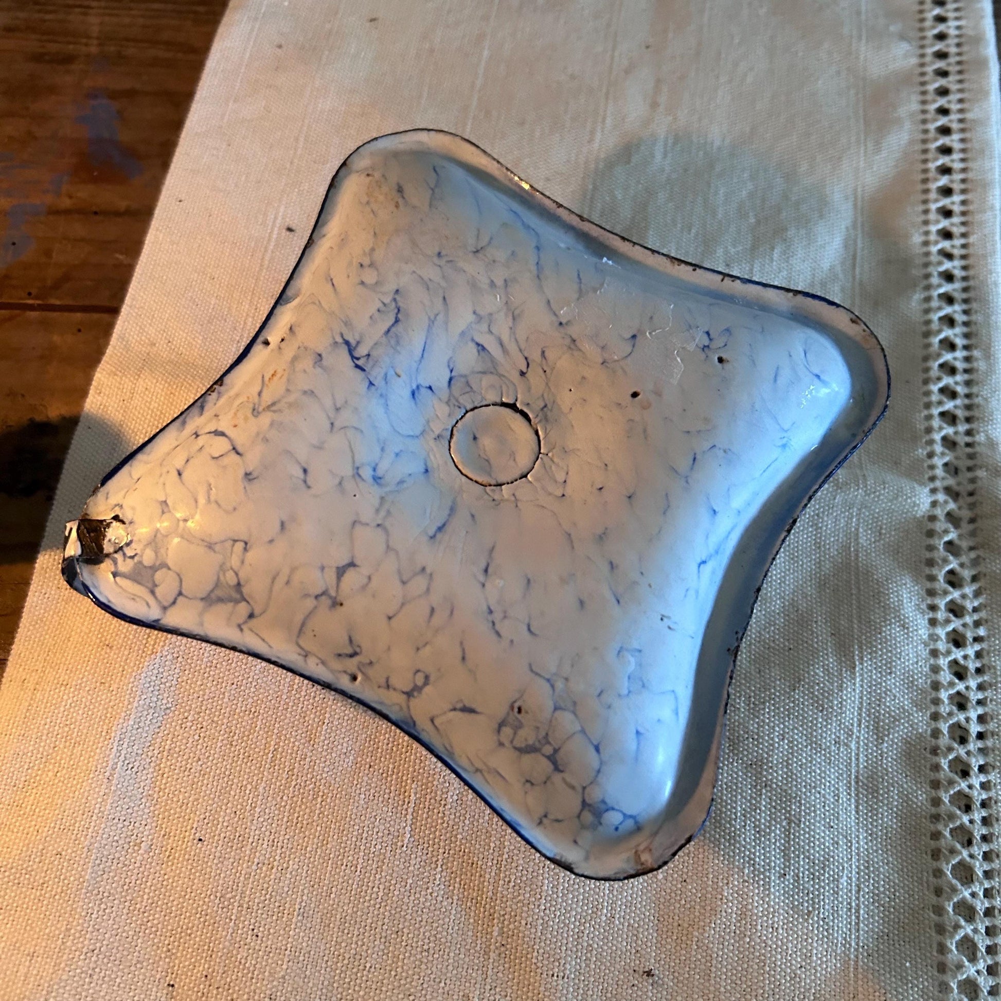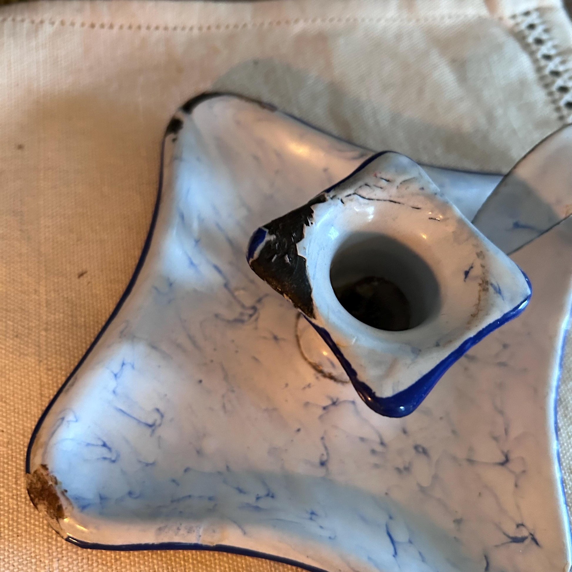 A wonderfully nostalgic hard to find french marble effect blue and white patterned vintage chippy chamber stick candle holder.