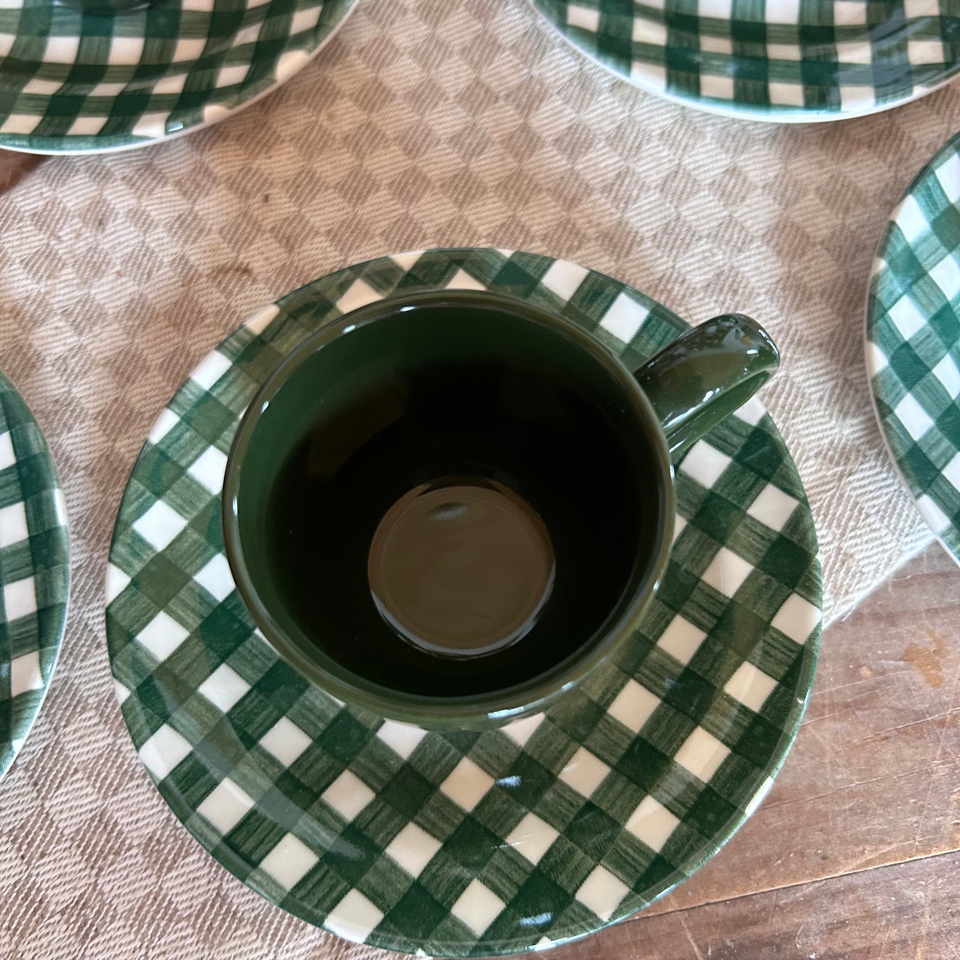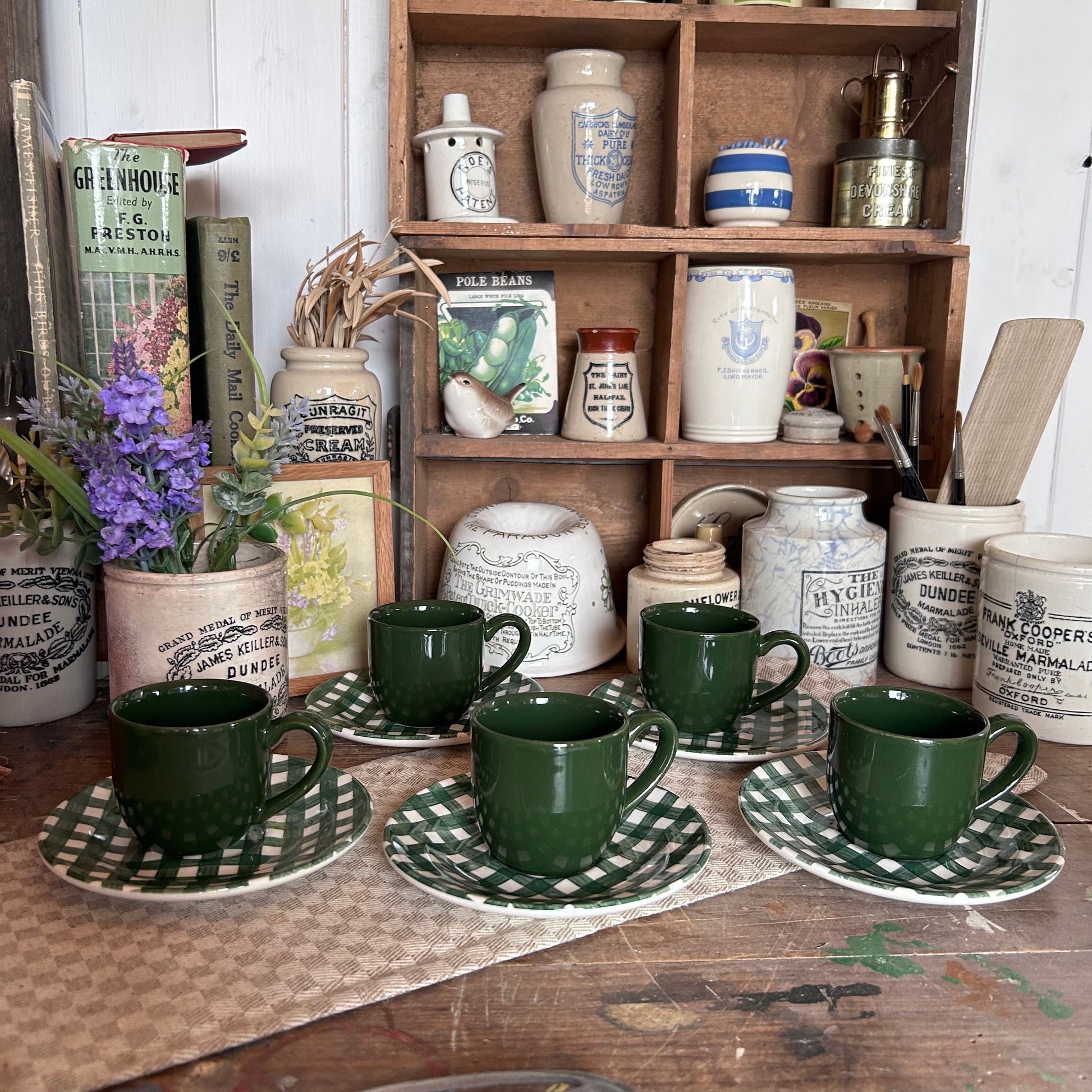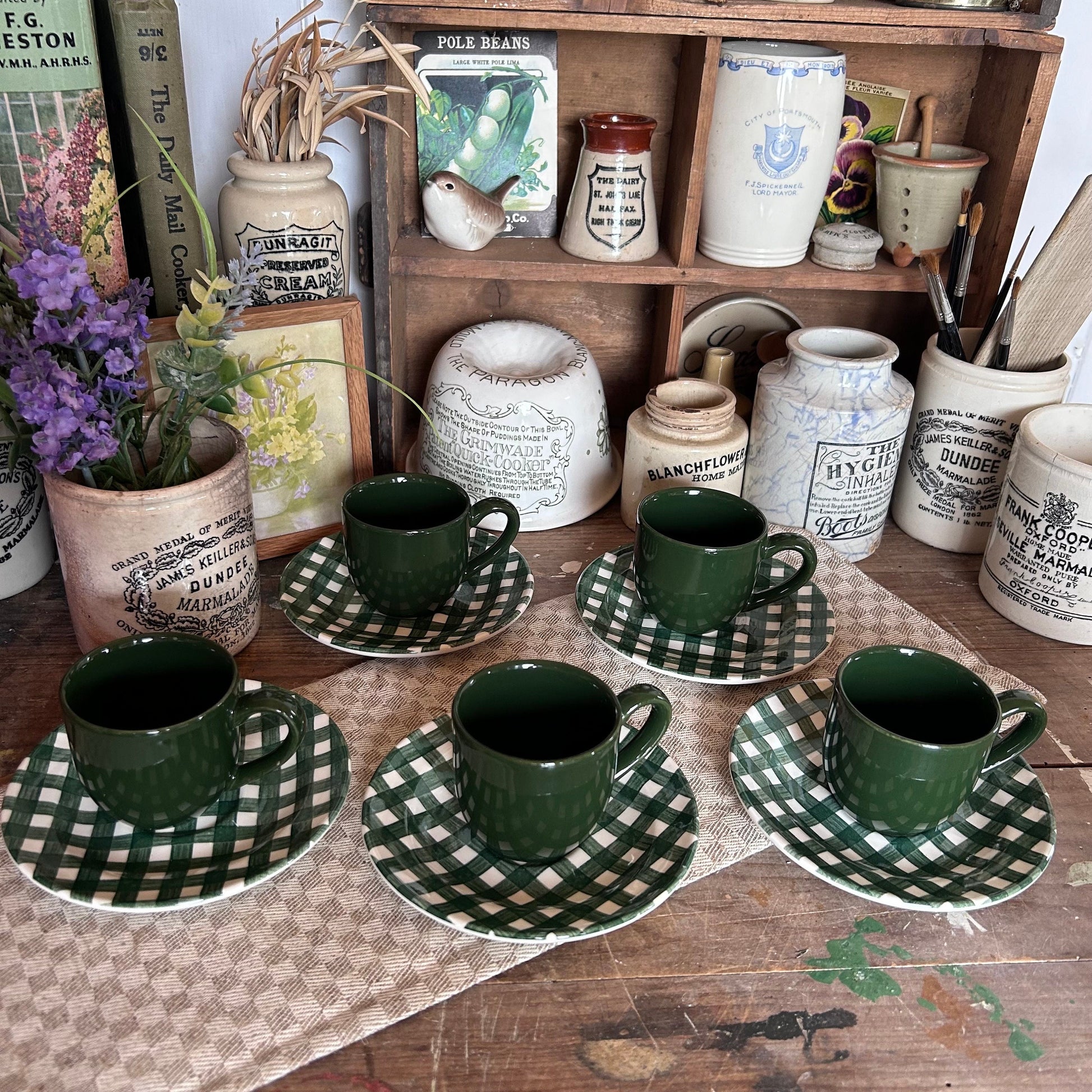 Lovely vintage set of 5 green and white gingham check tea cups and saucers.