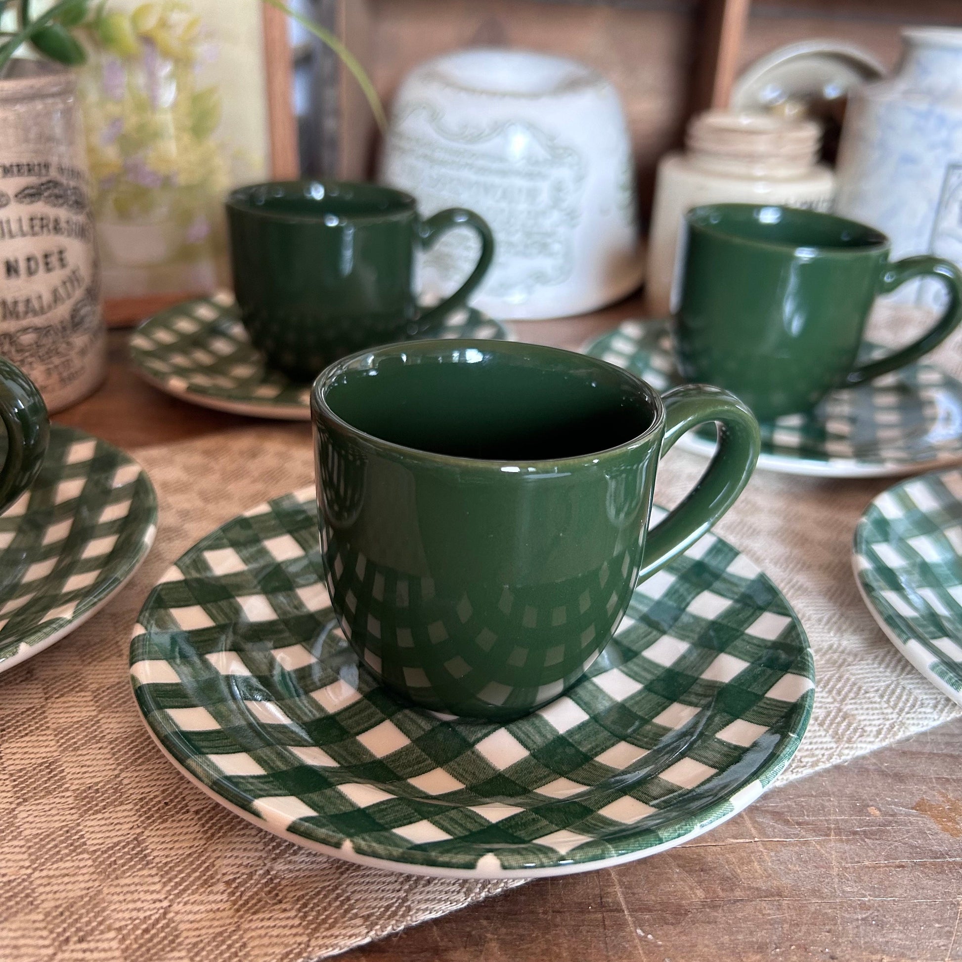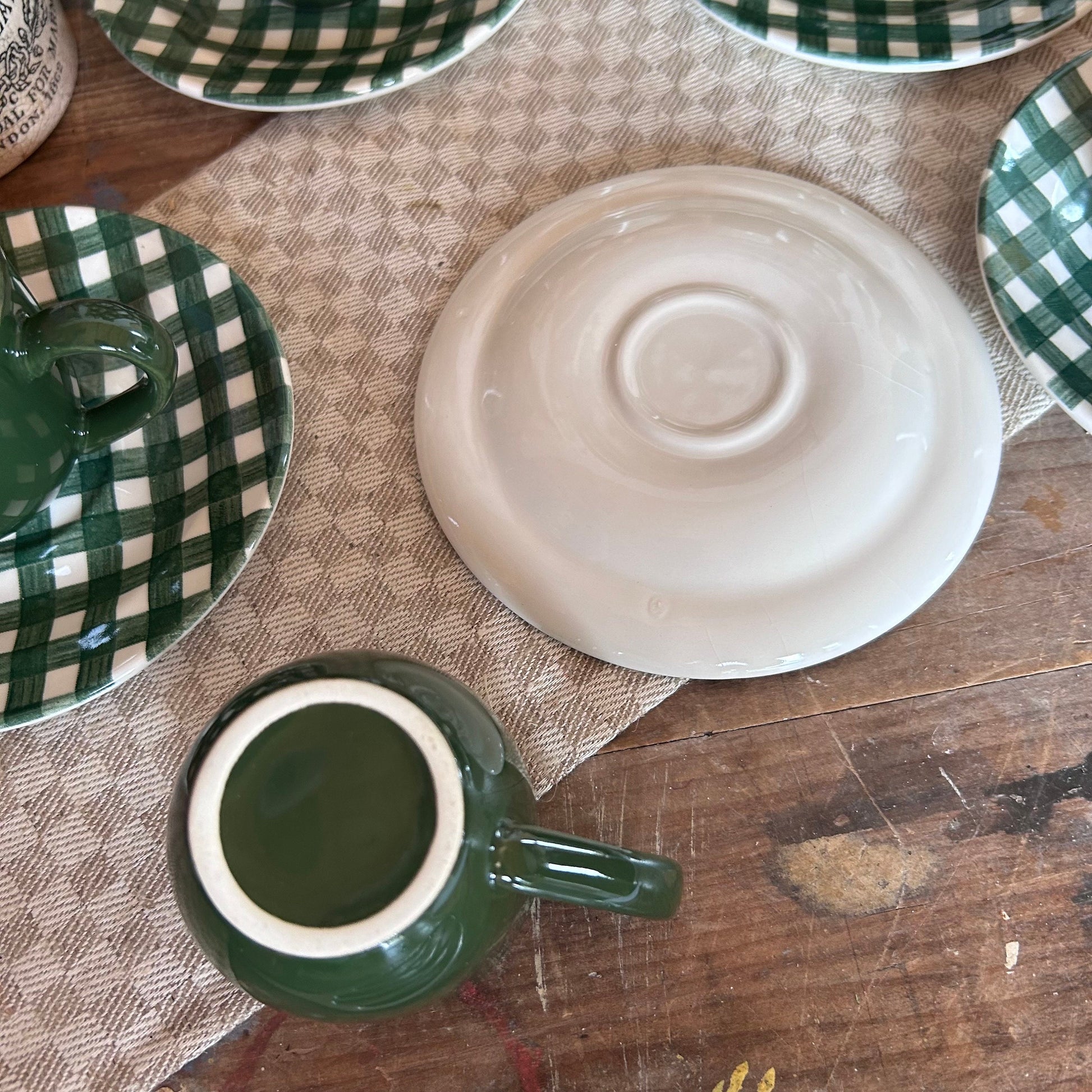 vintage green and white tea set, vintage tea set, coffee cups, vintage coffee cups, vintage teacups, gingham pattern cups, vintage cups,
