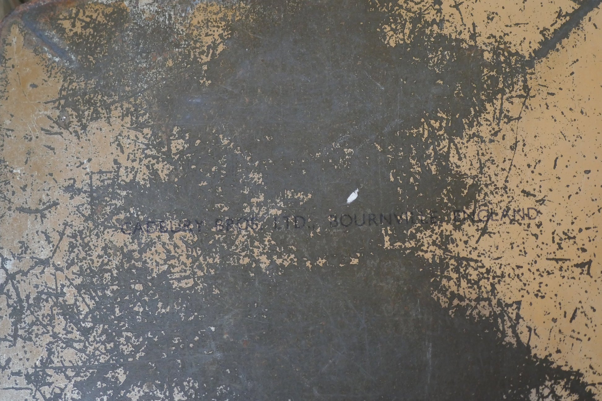 Some fading and usual age-related wear some rusting and scratches but no weakness to the metal, a good patina.