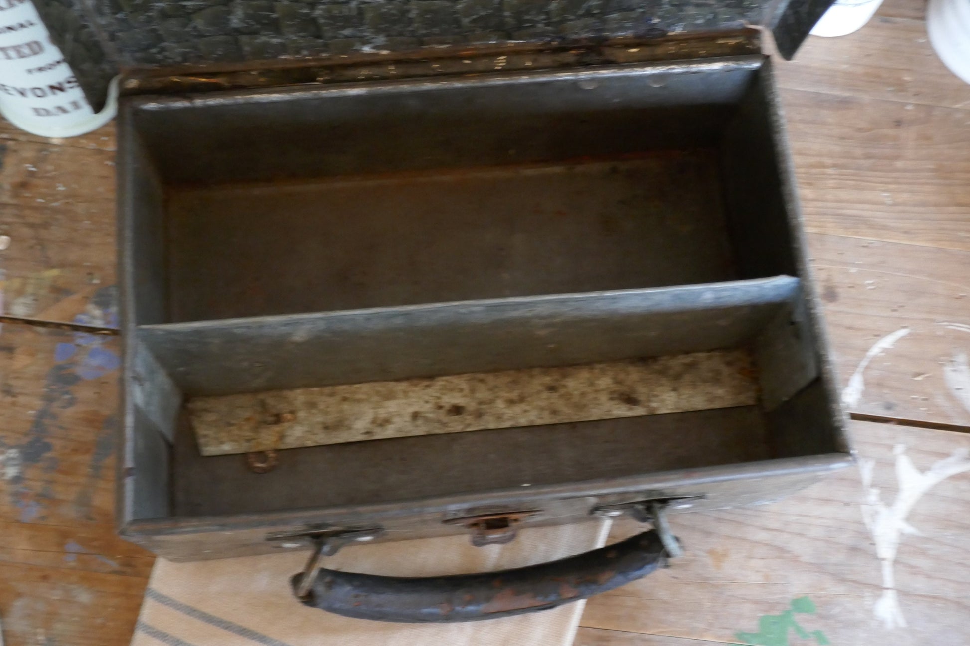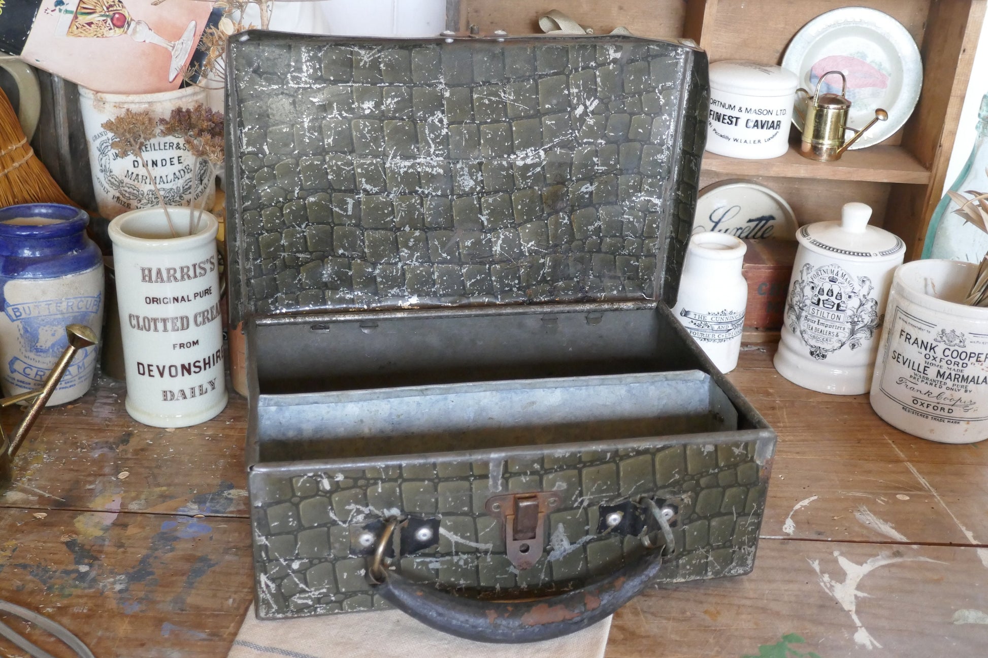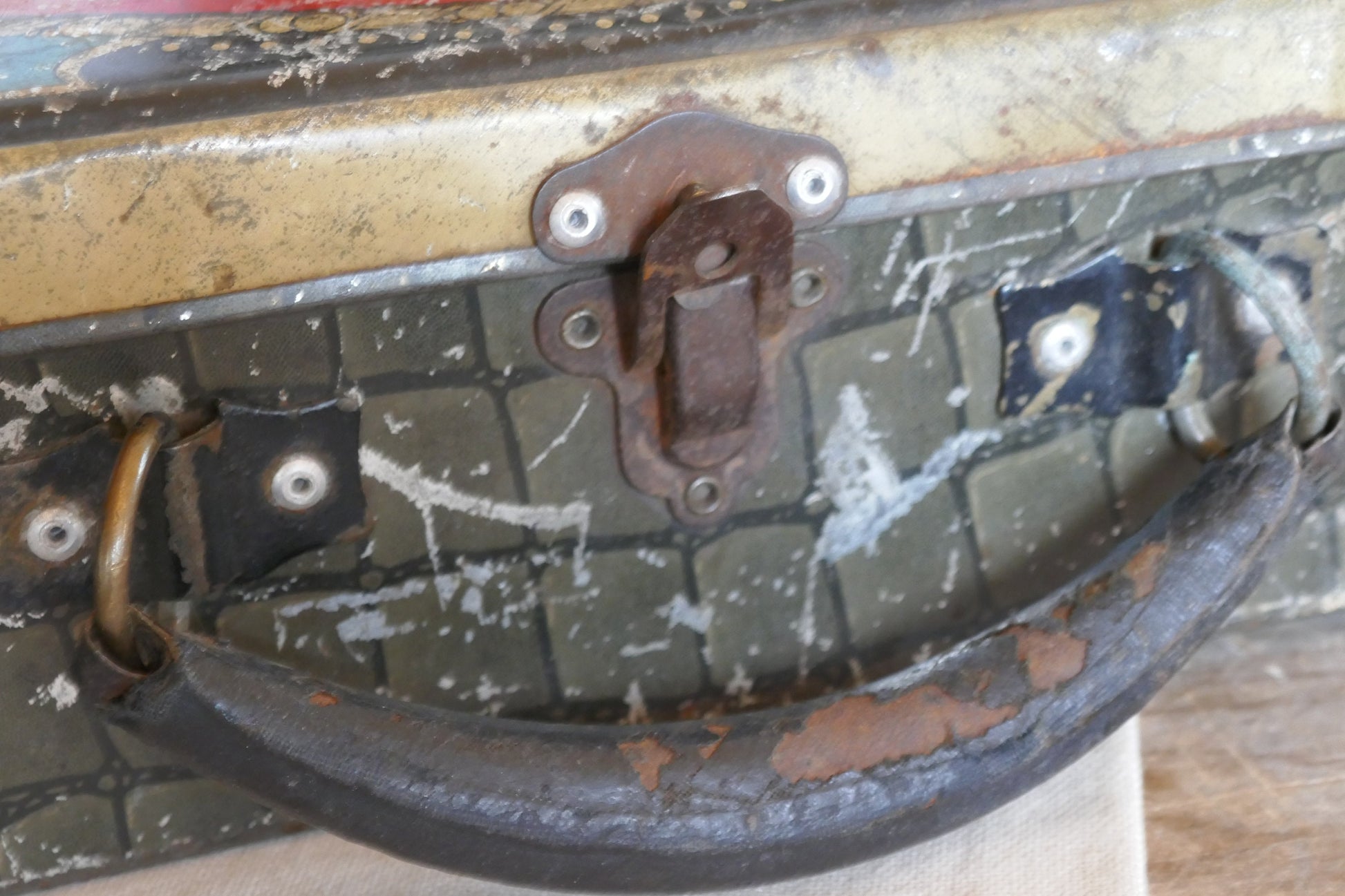 In good vintage condition the colours are still bright but there is some scratches and surface wear and a little rusty. The clasp is a little tight and the leather handle is a little worn but for its age it is in pretty good condition