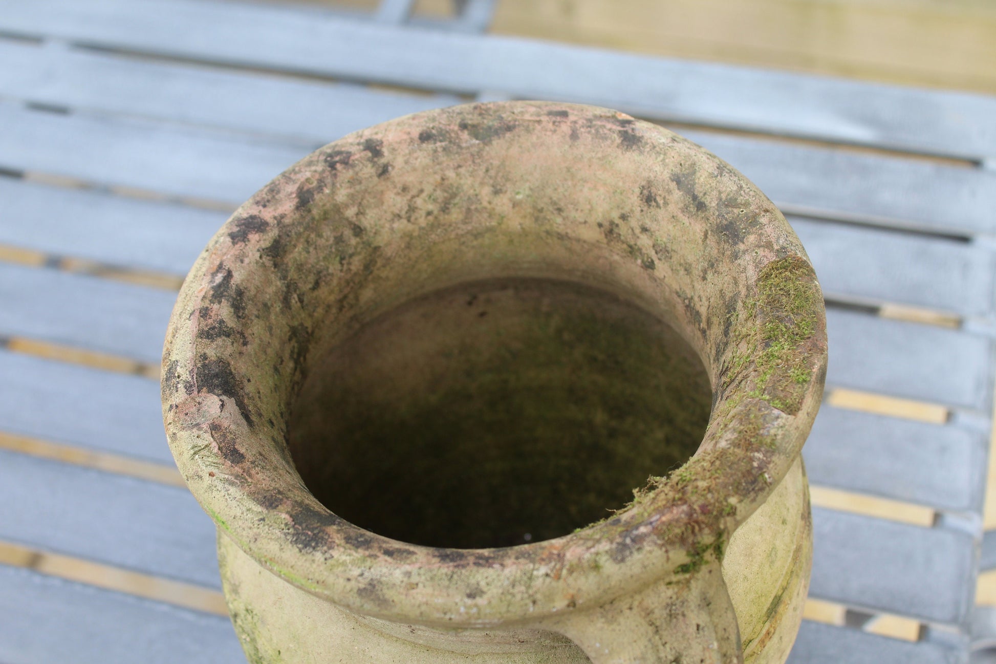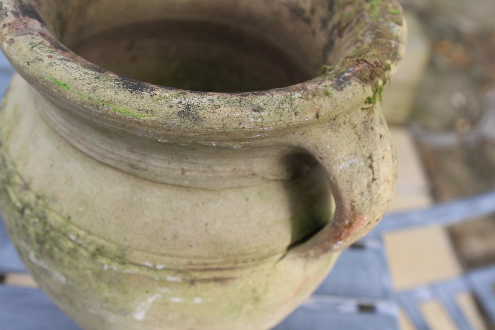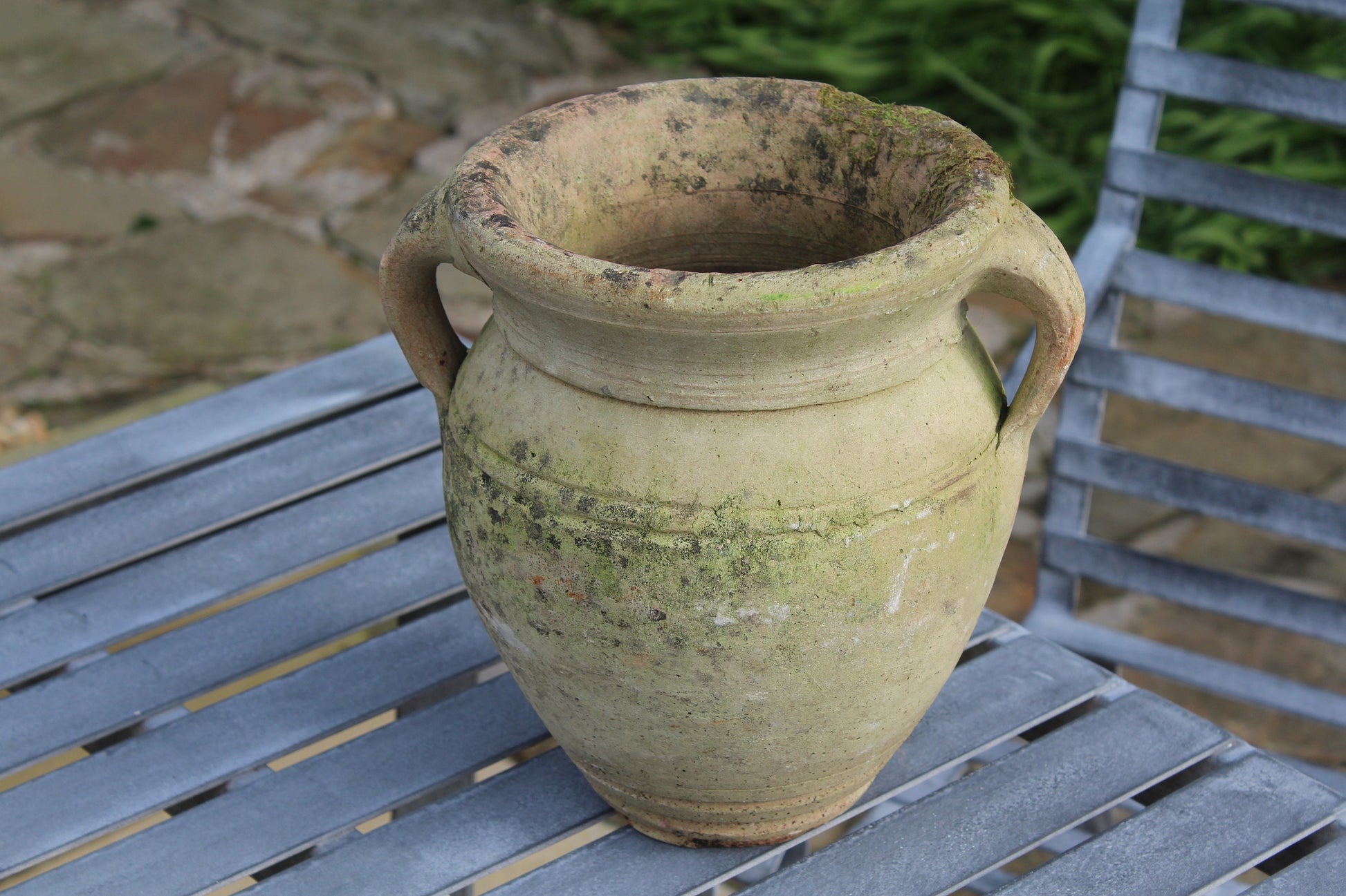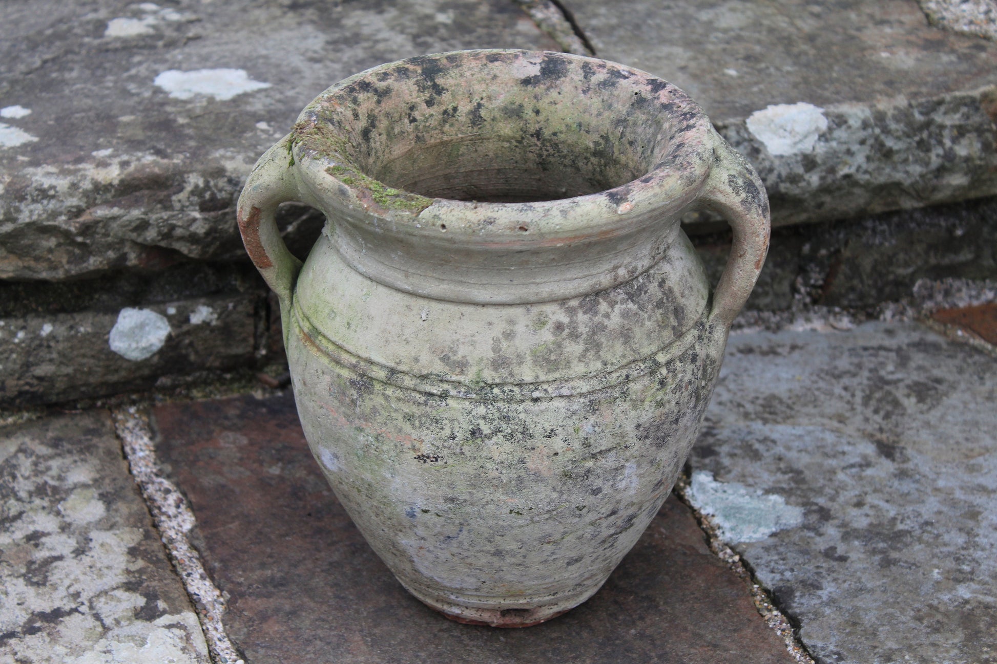 Beautiful light glazed terracotta garden urn with cup handle and gorgeous patina dating circa 1950s.