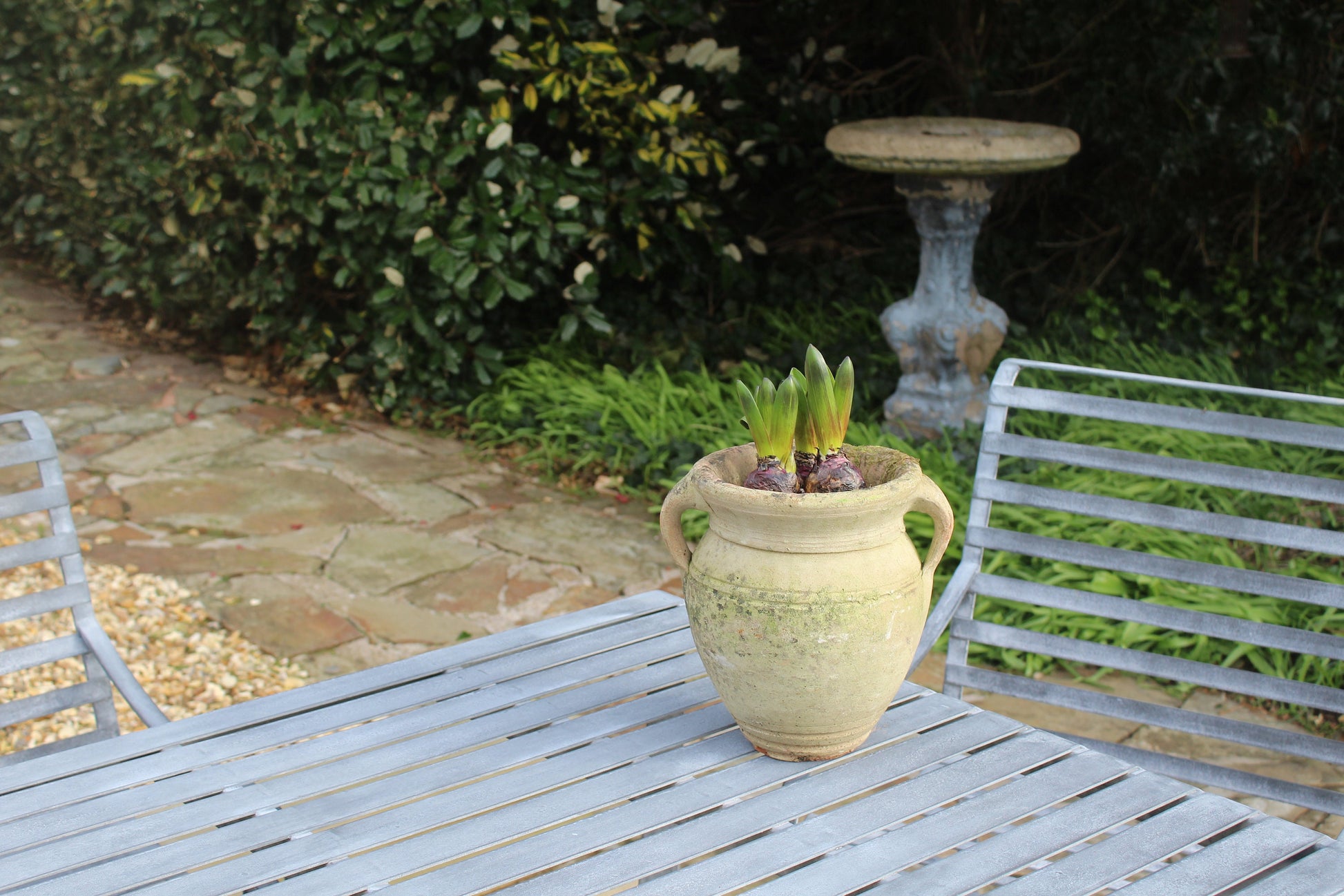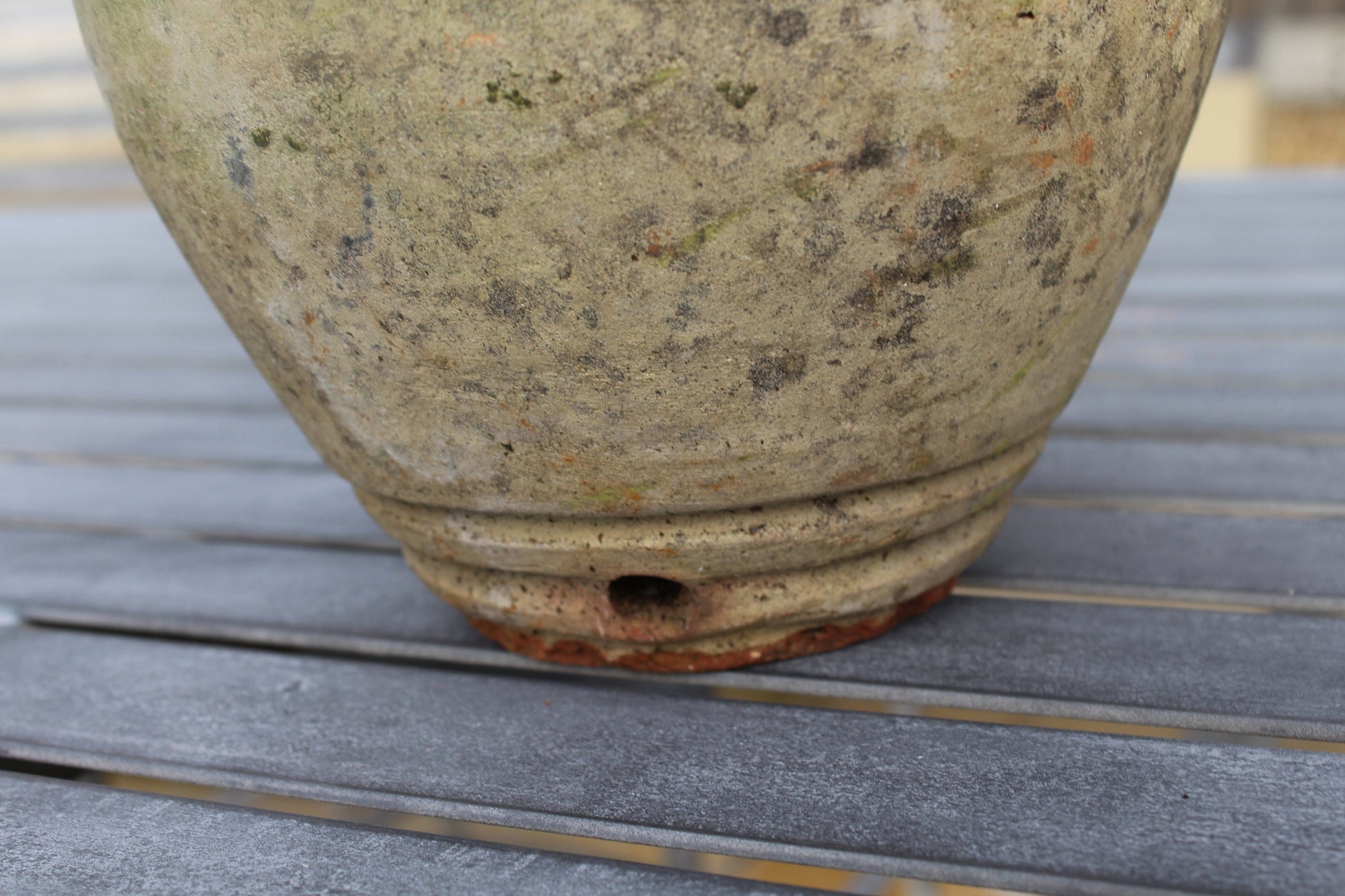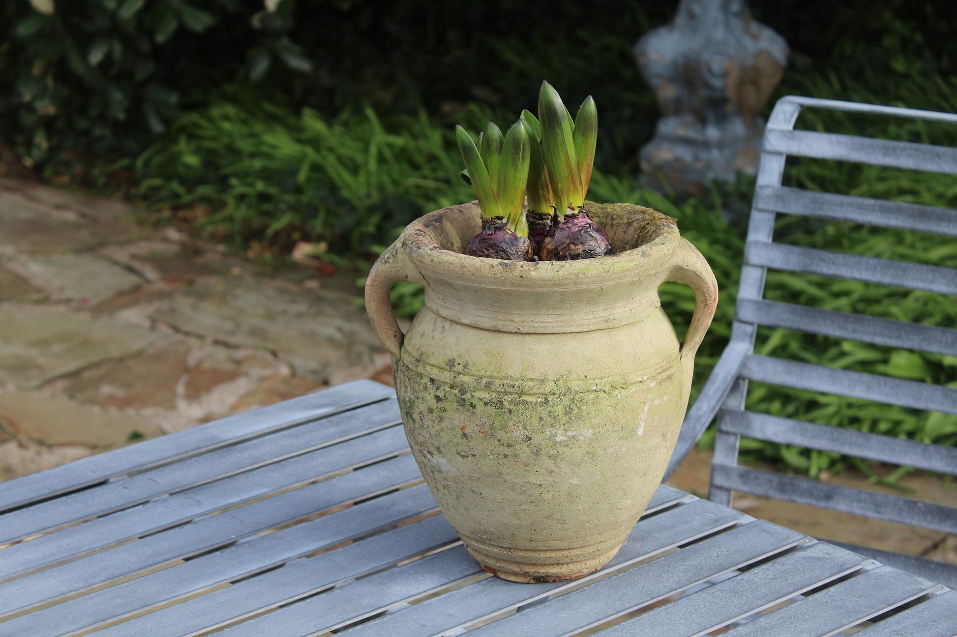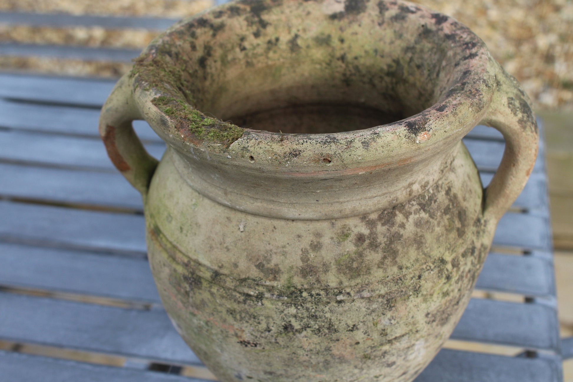 Beautiful light glazed terracotta garden urn with cup handle and gorgeous patina dating circa 1950s.