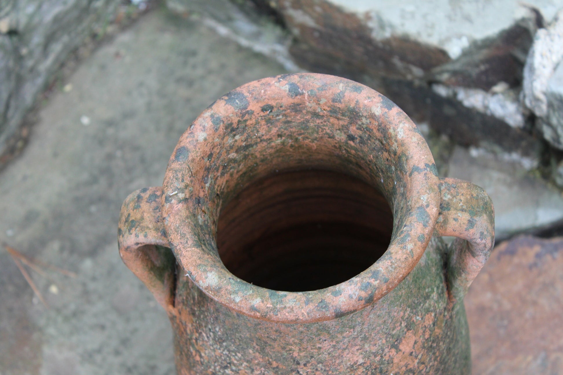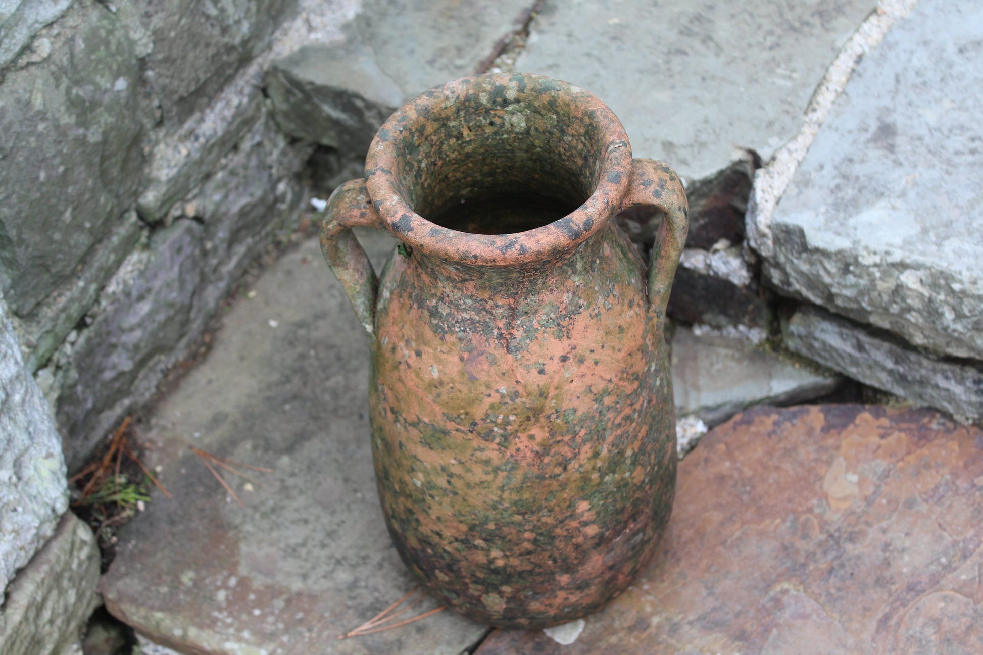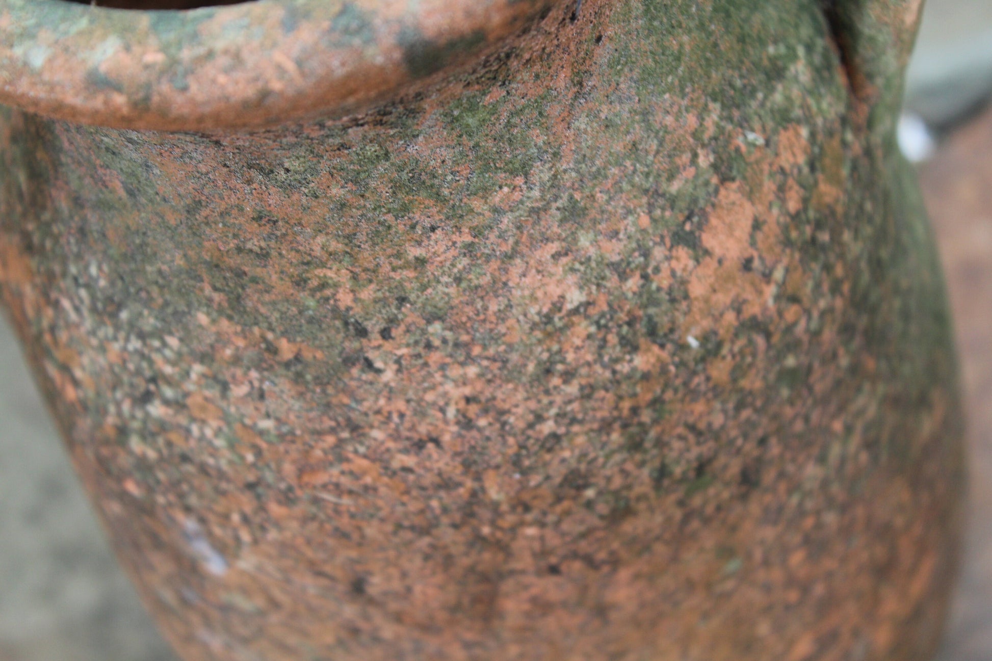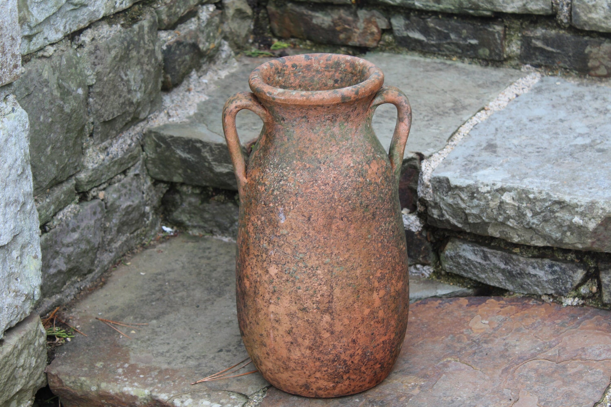 Beautiful terracotta garden urn with cup handle and gorgeous patina dating circa 1950s.