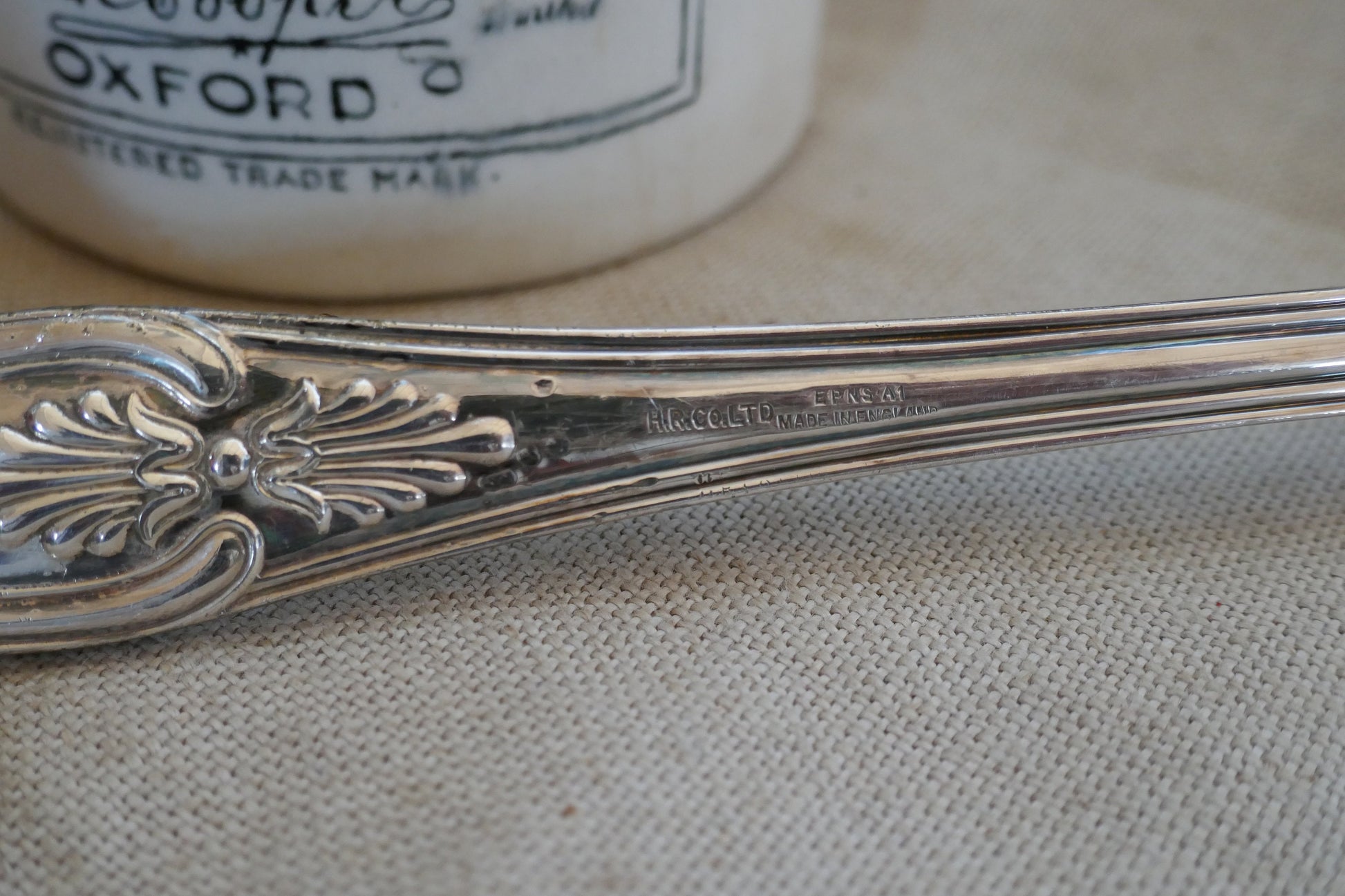 Lovely detailing this spoon is circa 1950s silver plate. It has some age-related light scratches and tarnishing to spoon but silver detailing still clear and lovely!