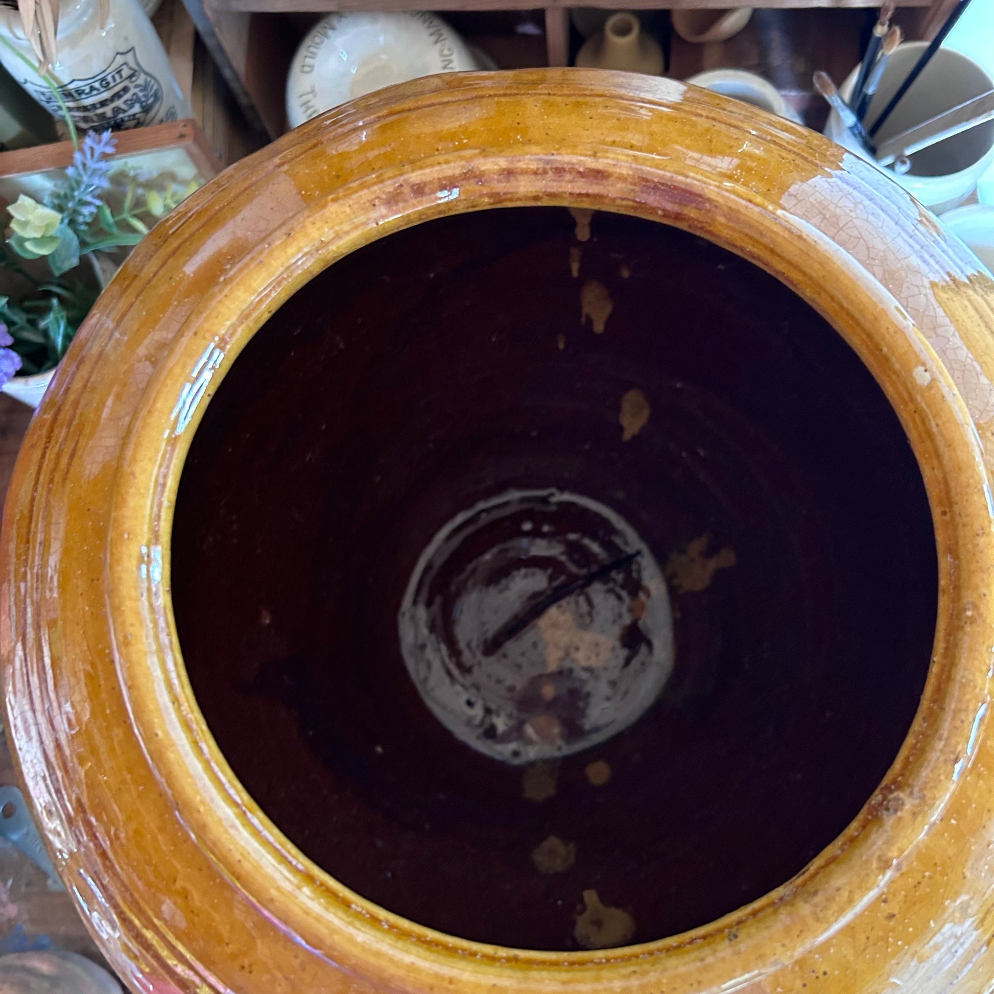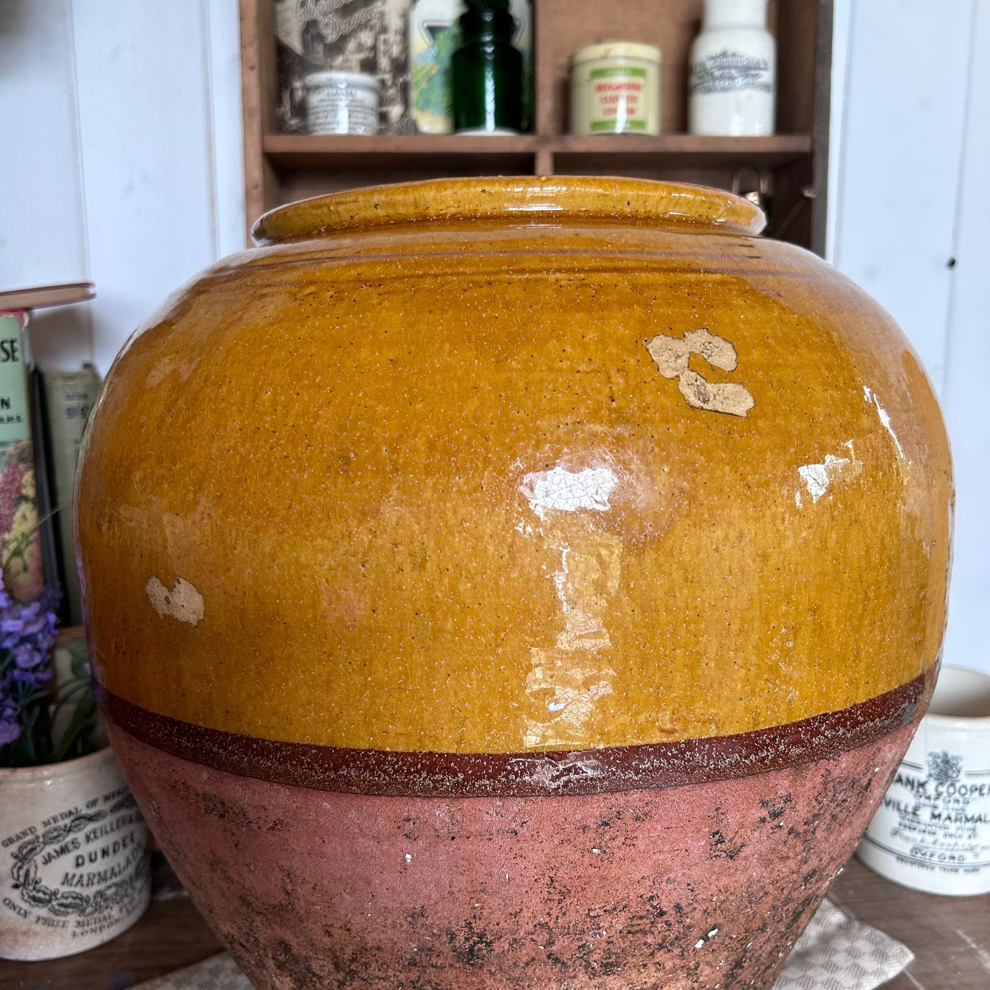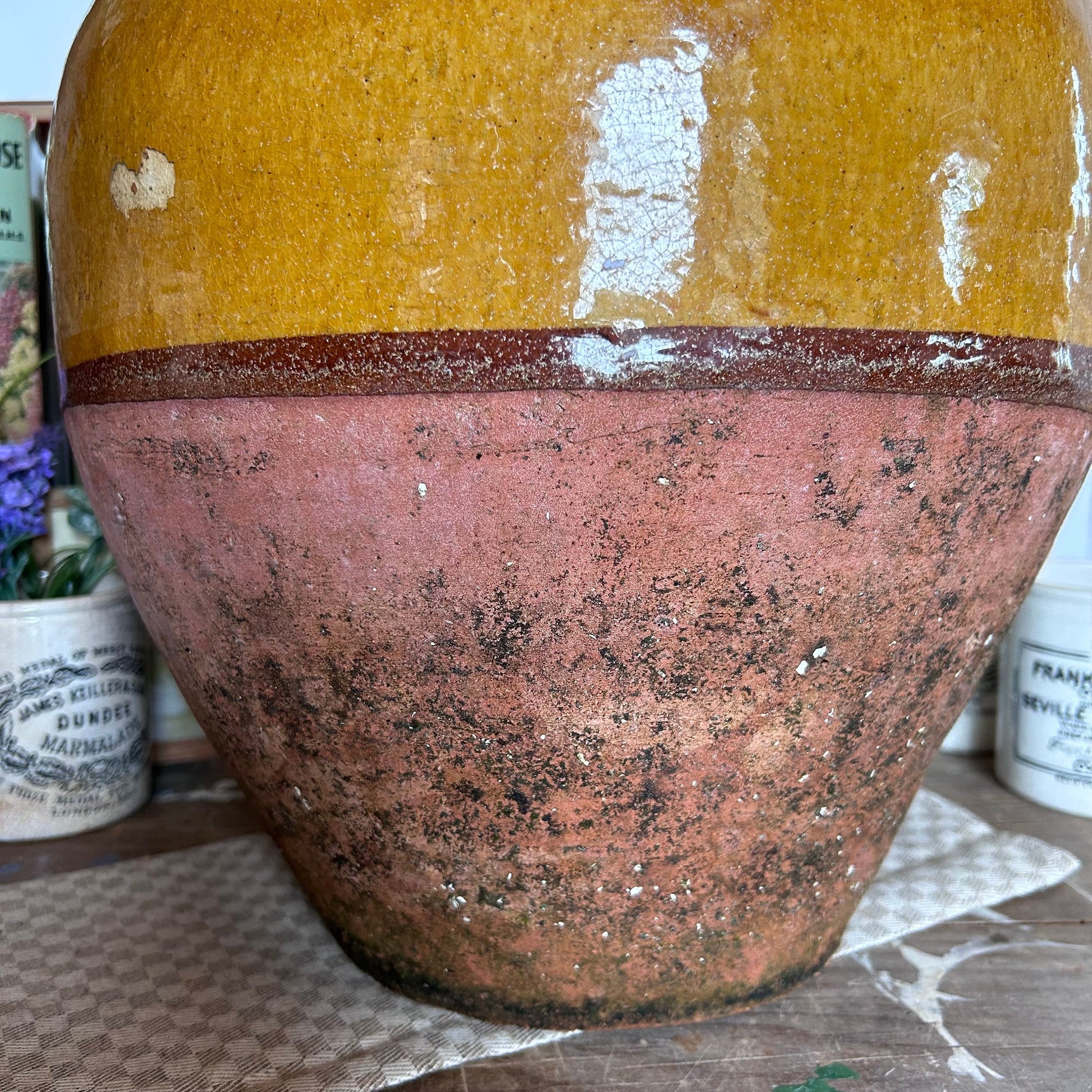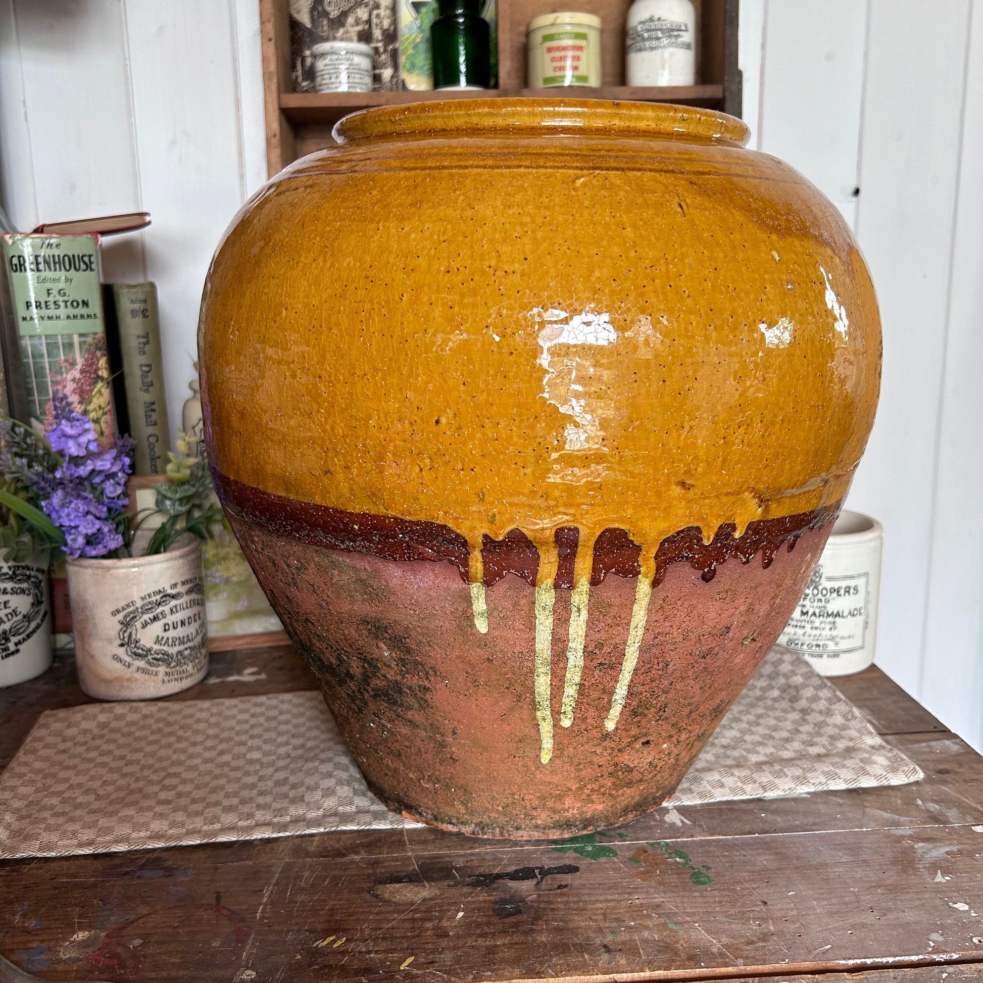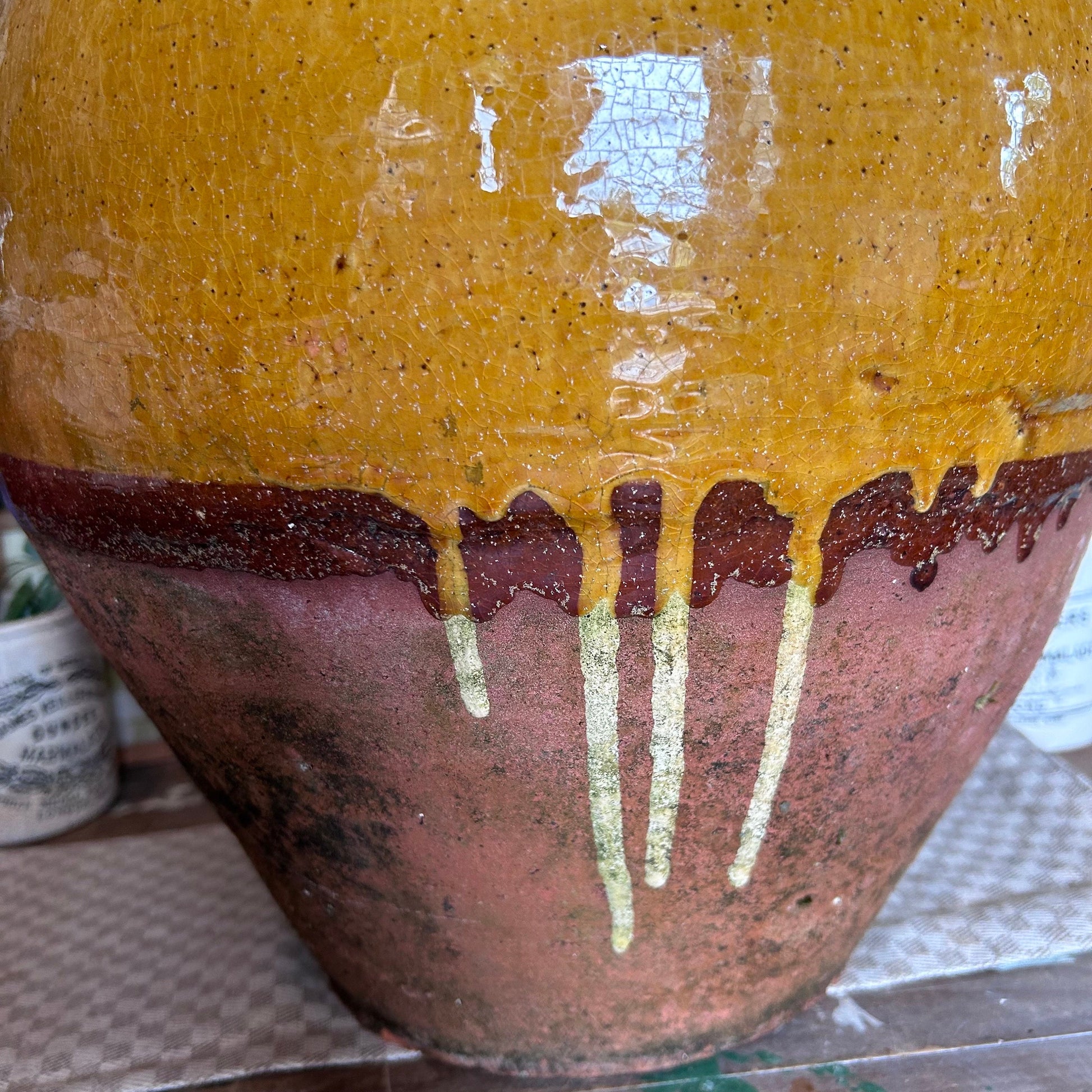 Beautiful French terracotta confit jar with a gorgeous mustard drip glaze dating circa 1920/30s.