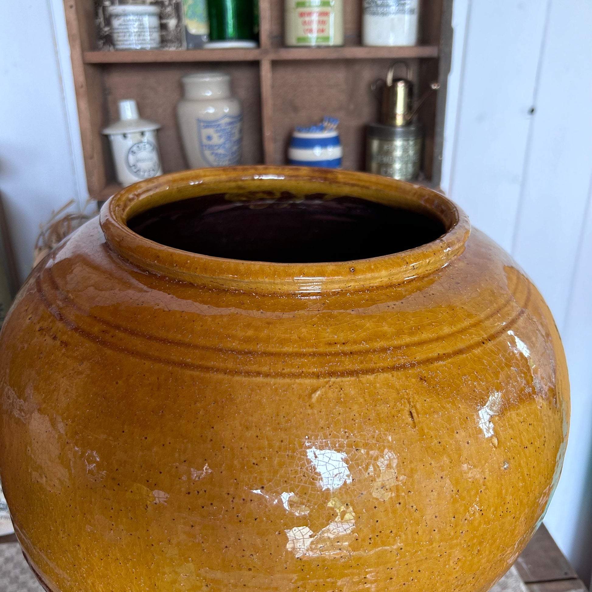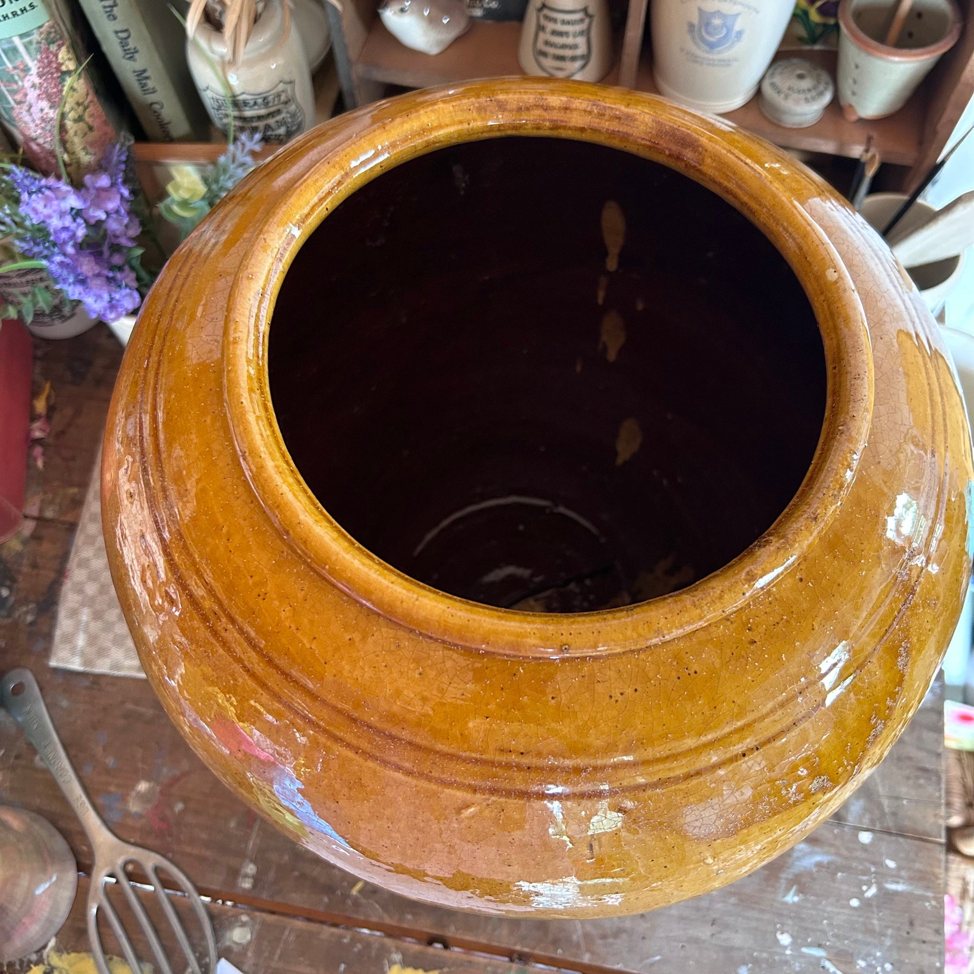 In great condition for its age for a rustic old working item. Some chips and nibbles across the pot, some loss to the glaze but nothing too bad, it all adds to a wonderful rustic patina. No cracks or significant chips, this is a sturdy pot.